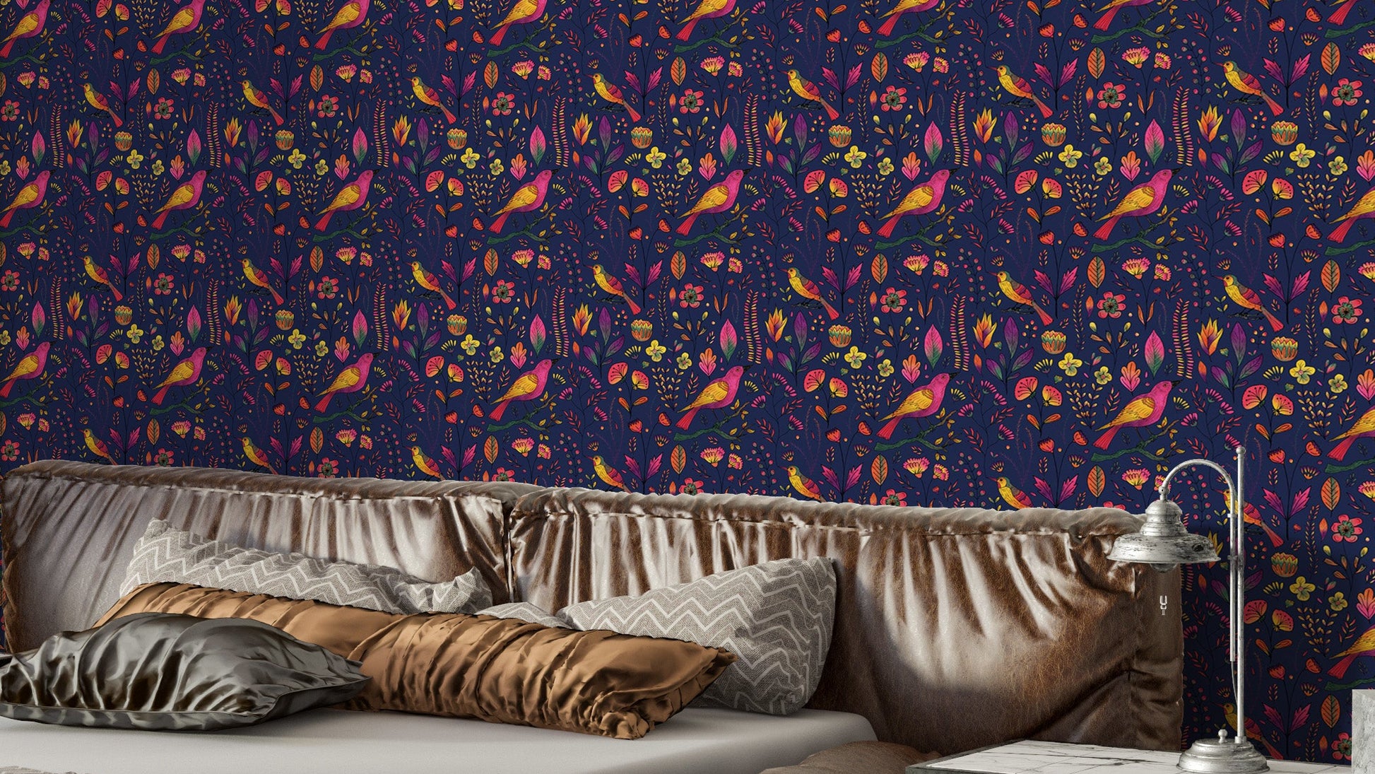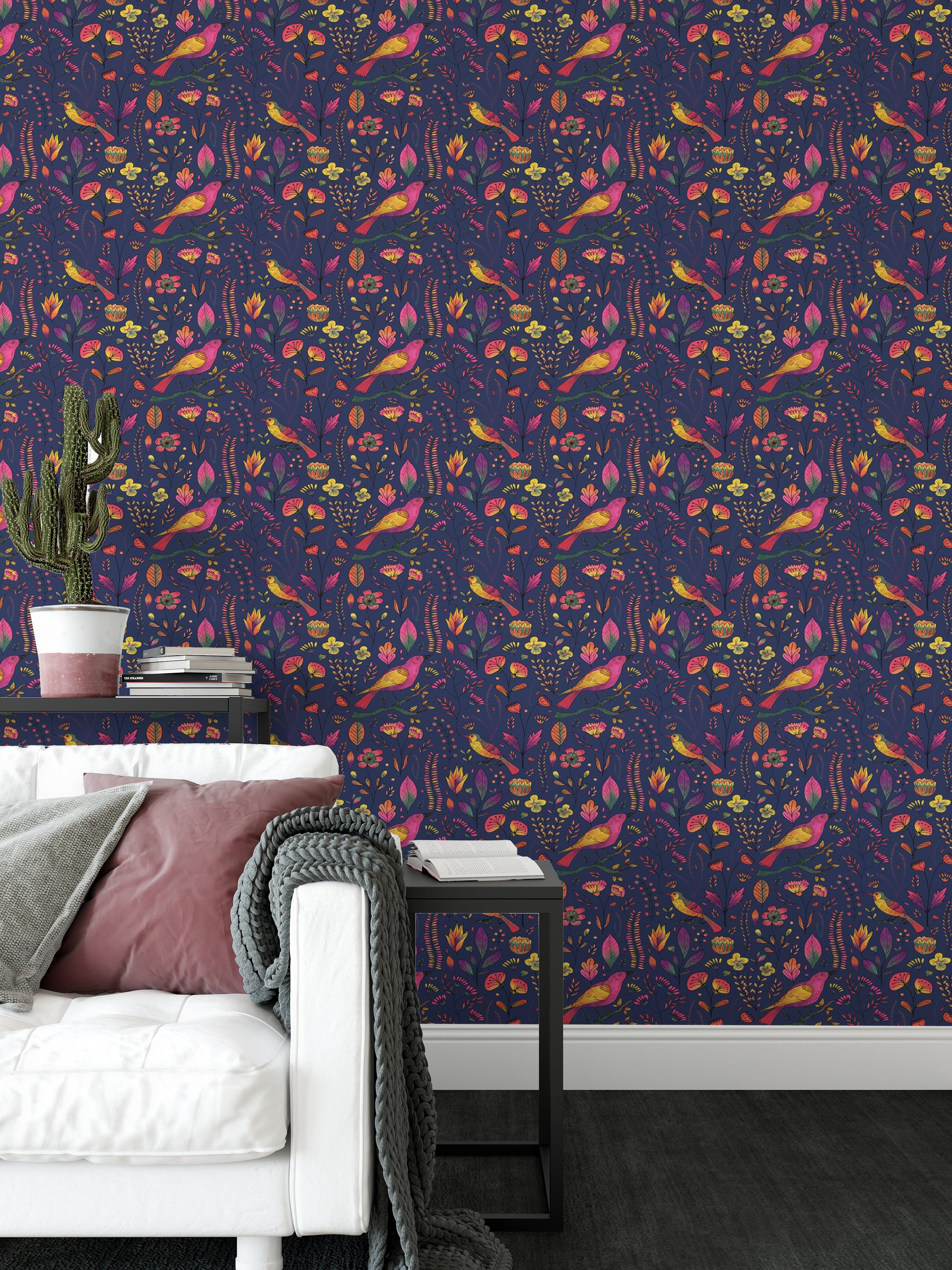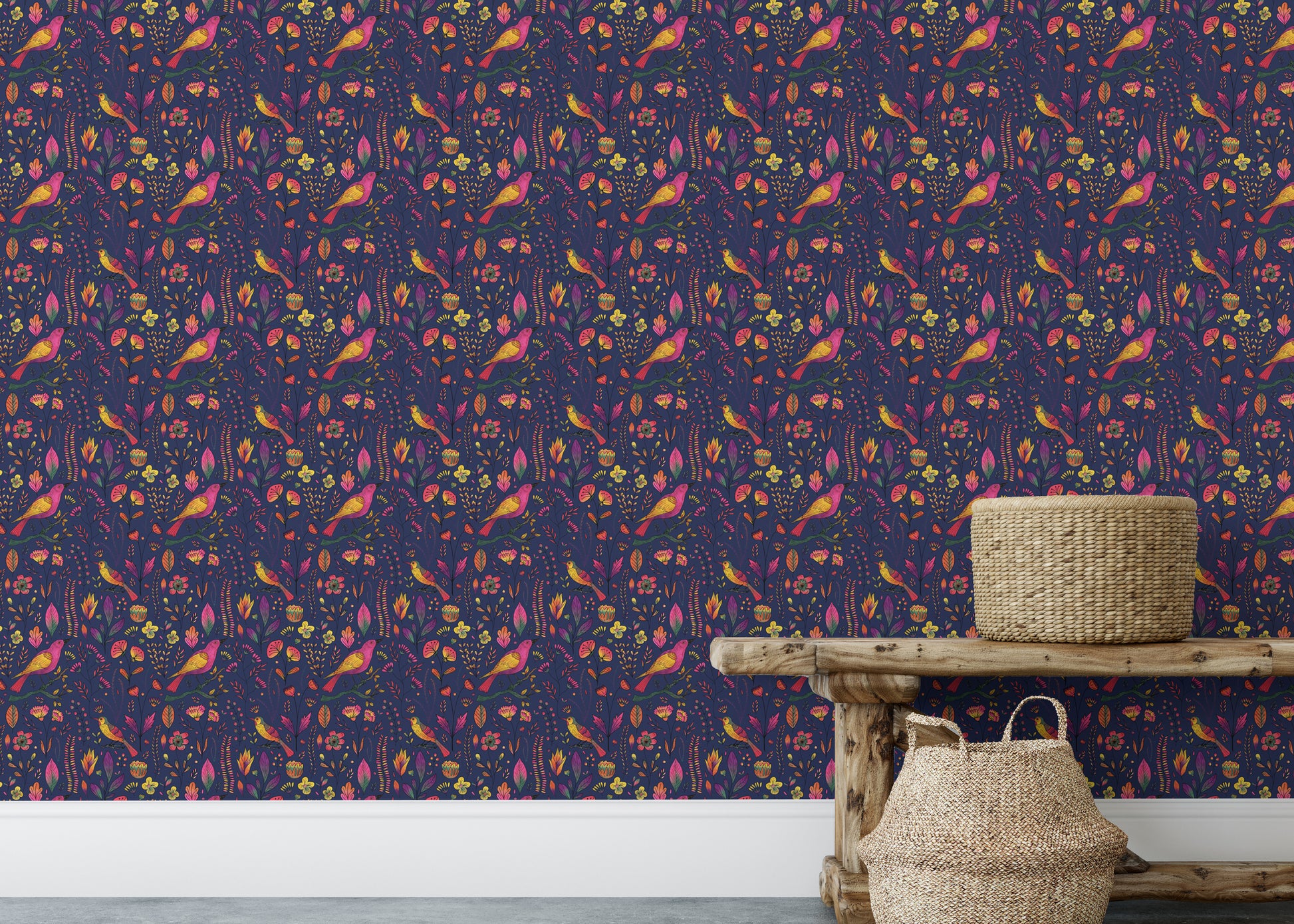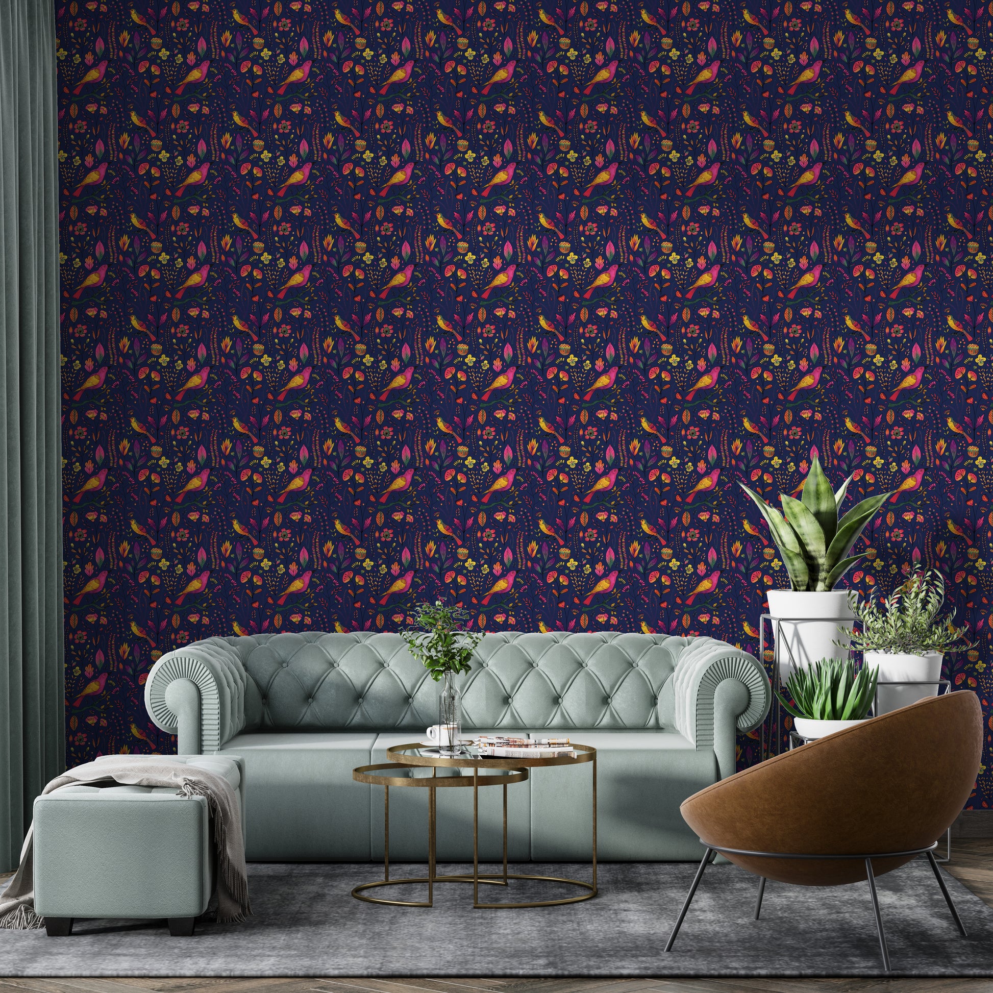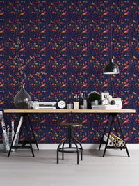 Let your walls sing with charm using our Whimsical Songbird Garden Navy Wallpaper. This delightful birds wallpaper features vibrant pink and yellow songbirds perched among hand-drawn florals and foliage, all set against a deep navy background for a striking contrast. The rich jewel tones and whimsical details make it perfect for accent walls, reading corners, or a playful nursery. Whether you're a nature enthusiast or simply love a bold, botanical vibe, this wallpaper adds personality and warmth to any space. Easy to apply and remove, it’s the perfect blend of elegance and enchantment for your home’s unique story.