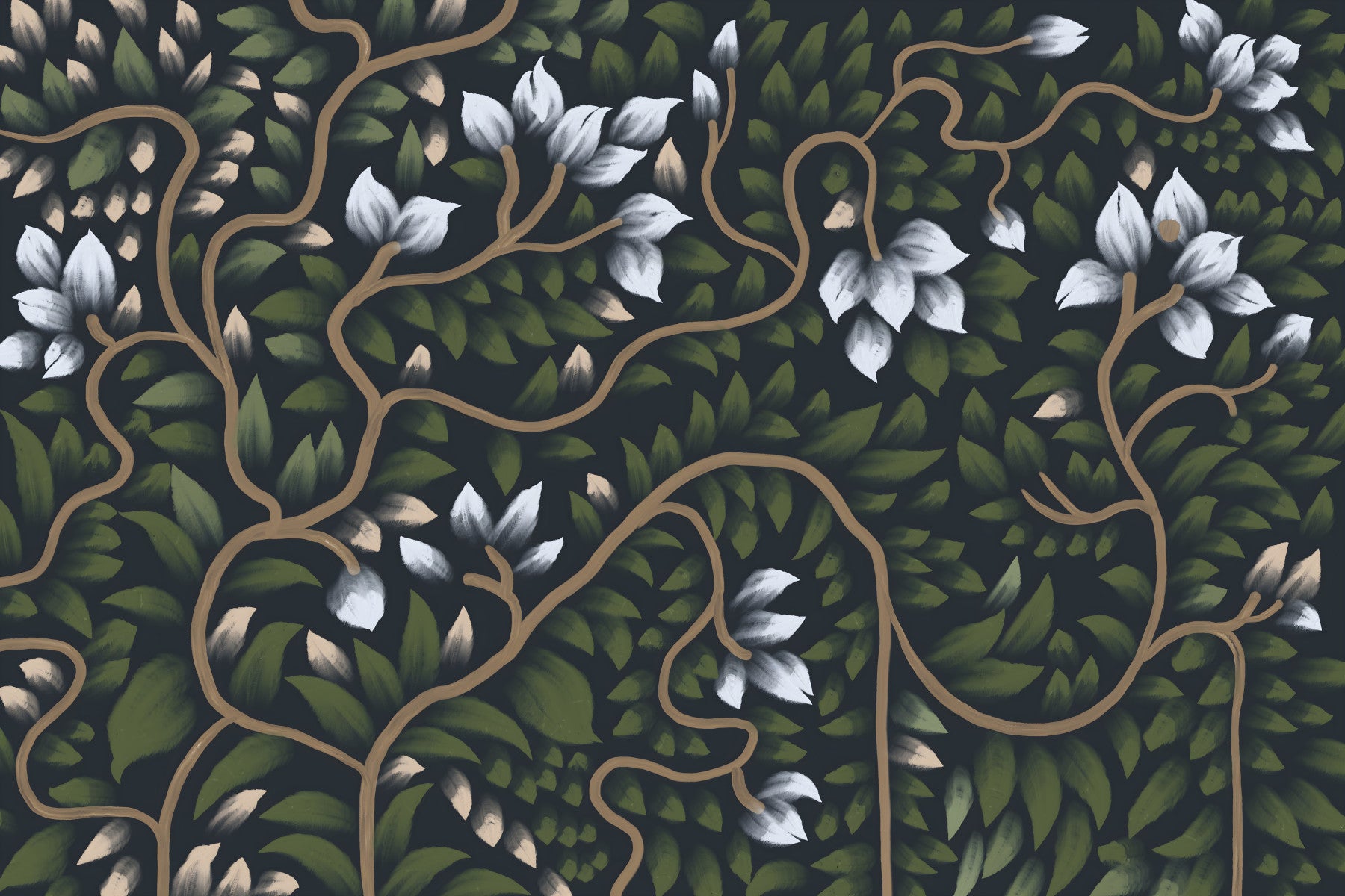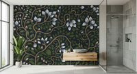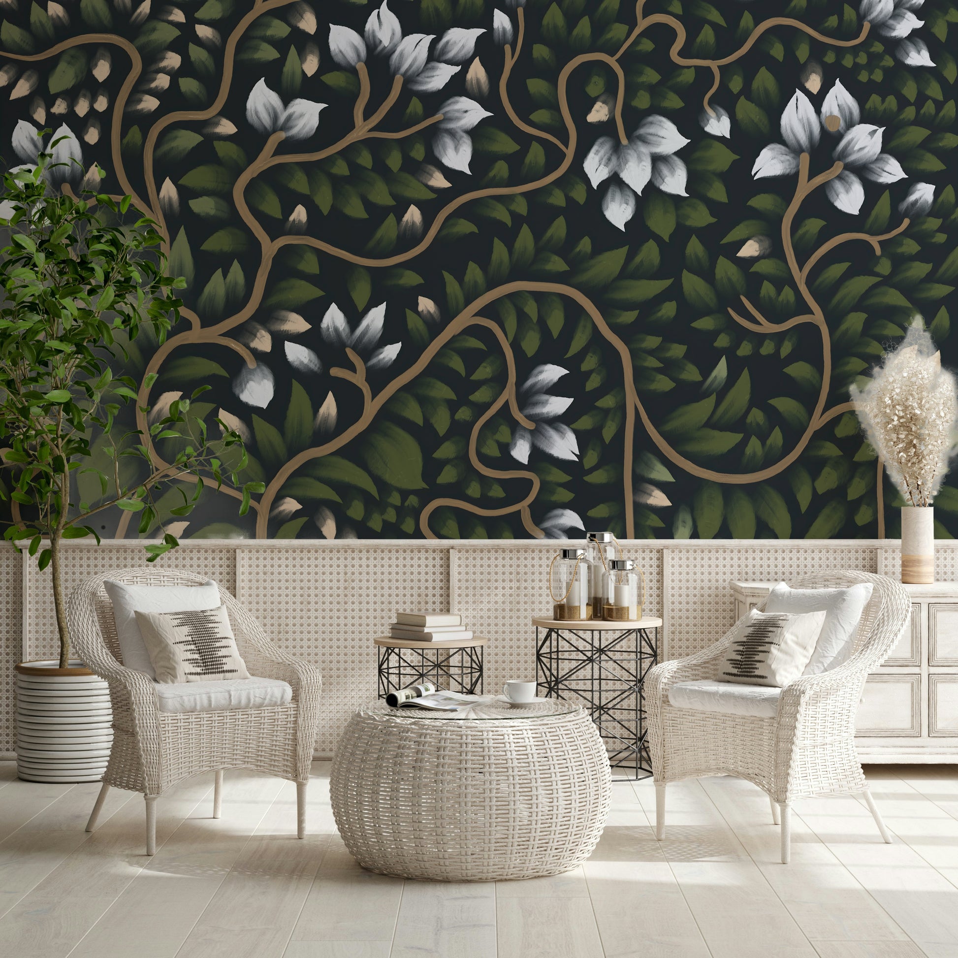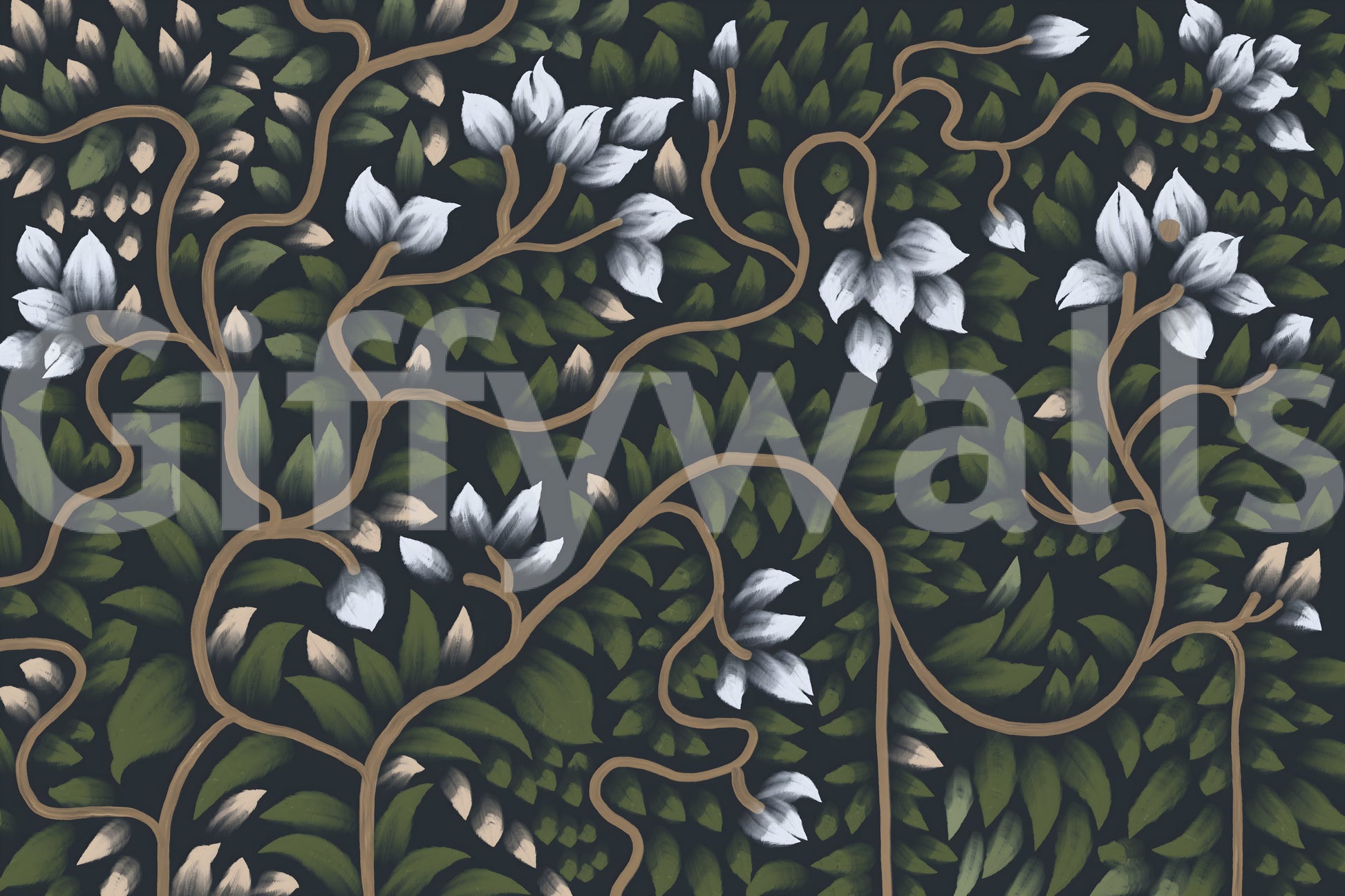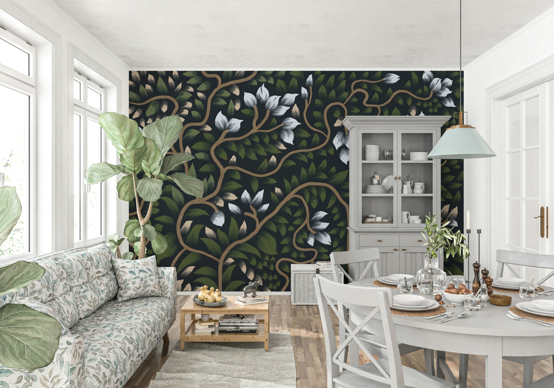 Bring the tranquility of a secret garden to your home with this captivating floral design. Lush greenery and delicate white petals dance across a deep backdrop, creating a sense of depth and intrigue. This wallpaper for walls is a great choice for those looking to add a touch of nature and sophistication to their space. Picture it enhancing a serene bedroom, an inviting living room, or a tranquil dining room. Its classic charm complements interiors with a touch of natural beauty.