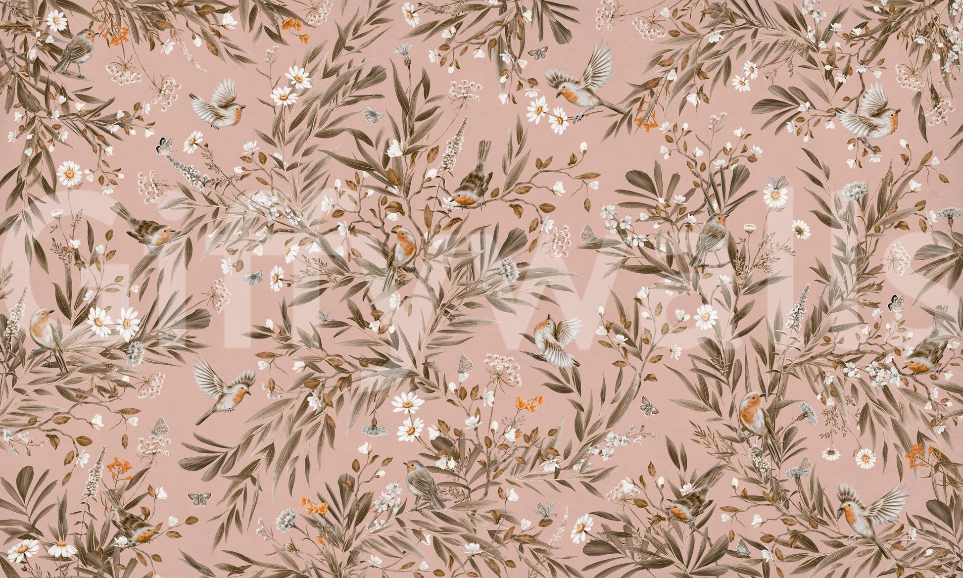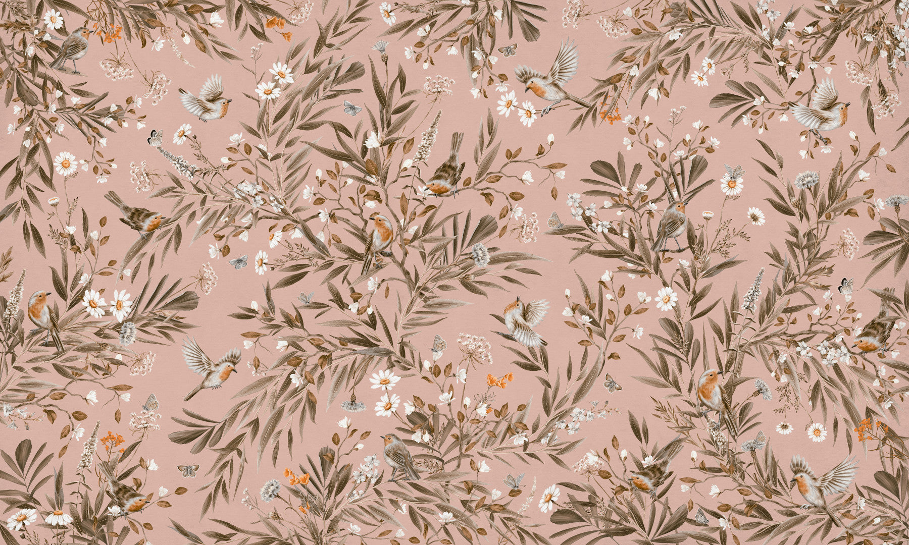 Transform any room into a tranquil retreat with this beautiful birds and blooms wallpaper for walls. The delicate design features tiny robins nestled among floral branches and fluttering butterflies, all rendered in muted hues of pink, cream, and brown. The repeating pattern brings a touch of nature's peaceful energy to your home. Ideal for a bedroom, living room, or even a cozy reading nook, this design complements vintage, rustic, or Scandinavian interiors.