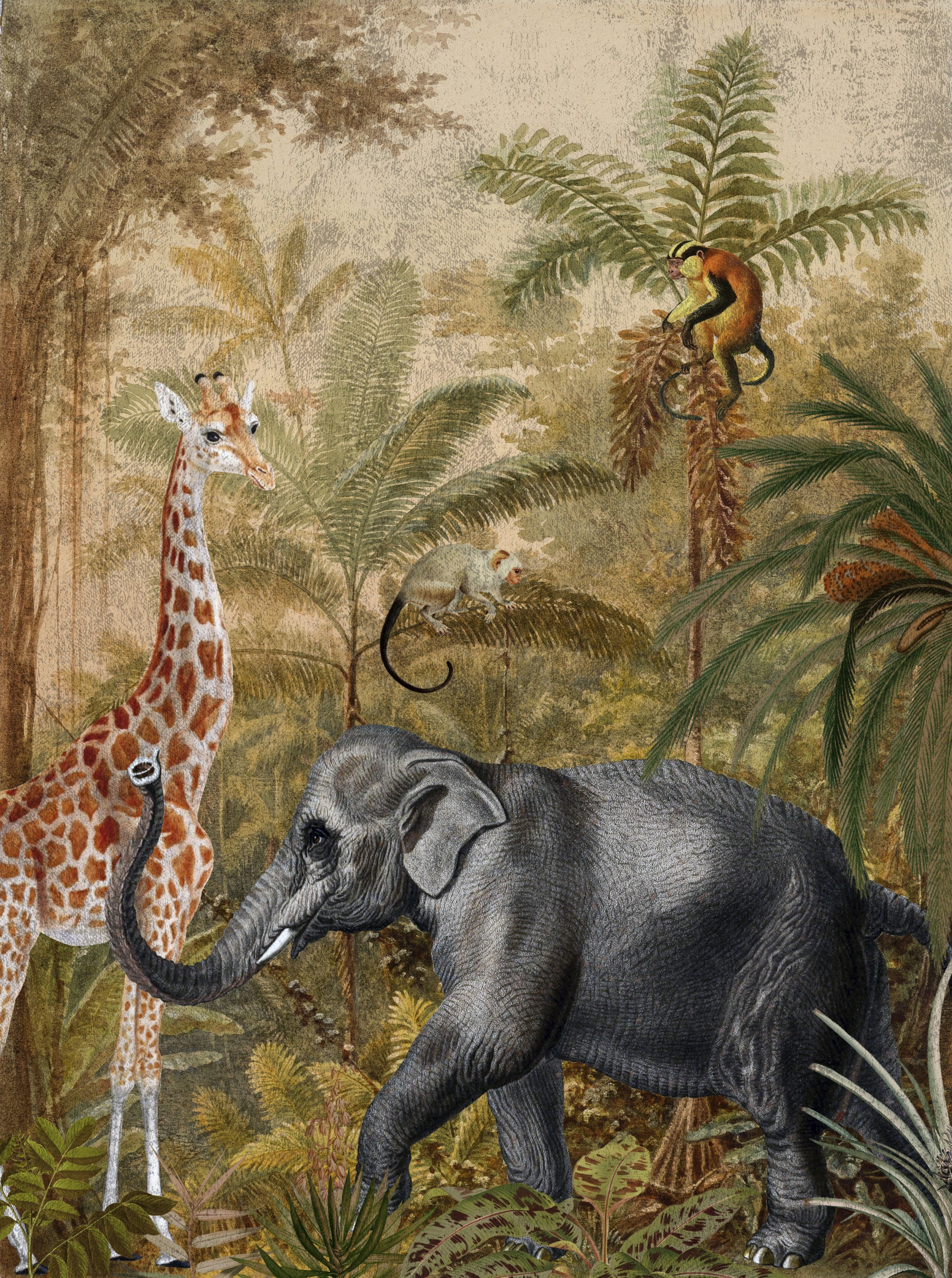 Immerse yourself in the beauty of the untamed wilderness with this captivating wallpaper. The artwork masterfully combines a vintage aesthetic with a modern sensibility. A majestic elephant and graceful giraffe share the scene with playful monkeys, all nestled within a lush tropical landscape depicted in rich, textured detail. The muted color palette creates a sense of tranquility, making it ideal for a calming and elegant space. This piece invites you to reconnect with nature's serenity and embark on a visual journey to the heart of the wild.
