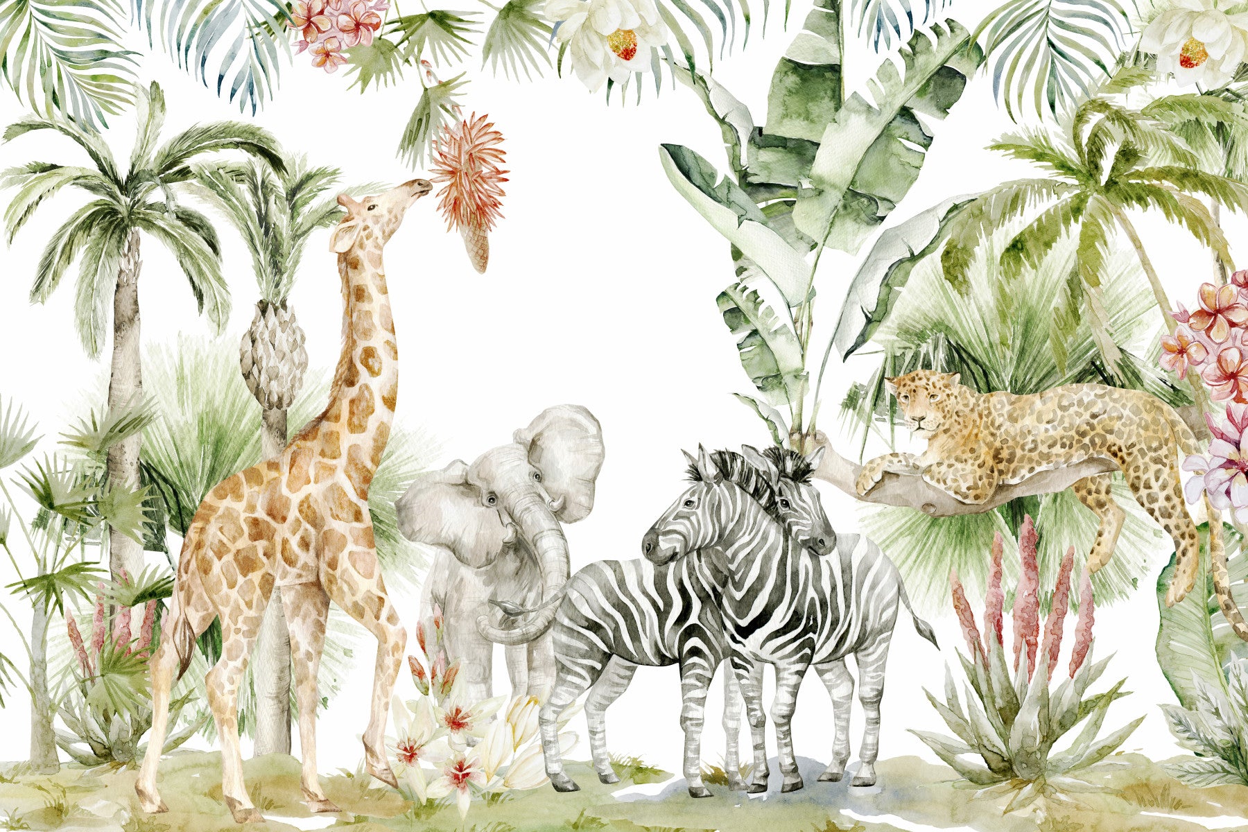 Immerse yourself in the tranquil beauty of the African savanna with this exquisite wallpaper. Delicate watercolor brushstrokes depict a harmonious scene of majestic animals: a giraffe, zebras, an elephant, and a leopard, all peacefully coexisting among lush tropical foliage. The soft color palette of greens, browns, and muted earth tones creates a calming and sophisticated ambiance, ideal for a nursery, playroom, or any space seeking a touch of wild elegance. The intricate detail and artistic rendering of the animals and plants bring a sense of authentic natural wonder to your walls.