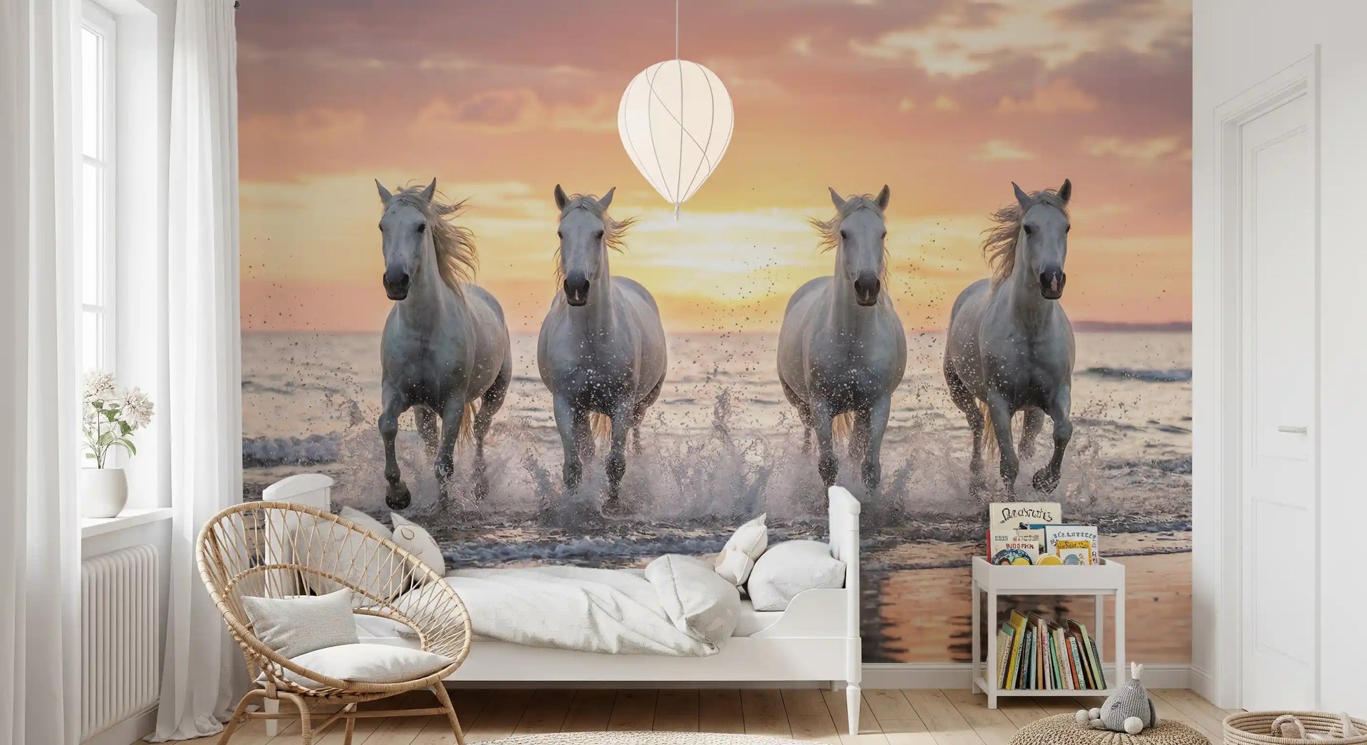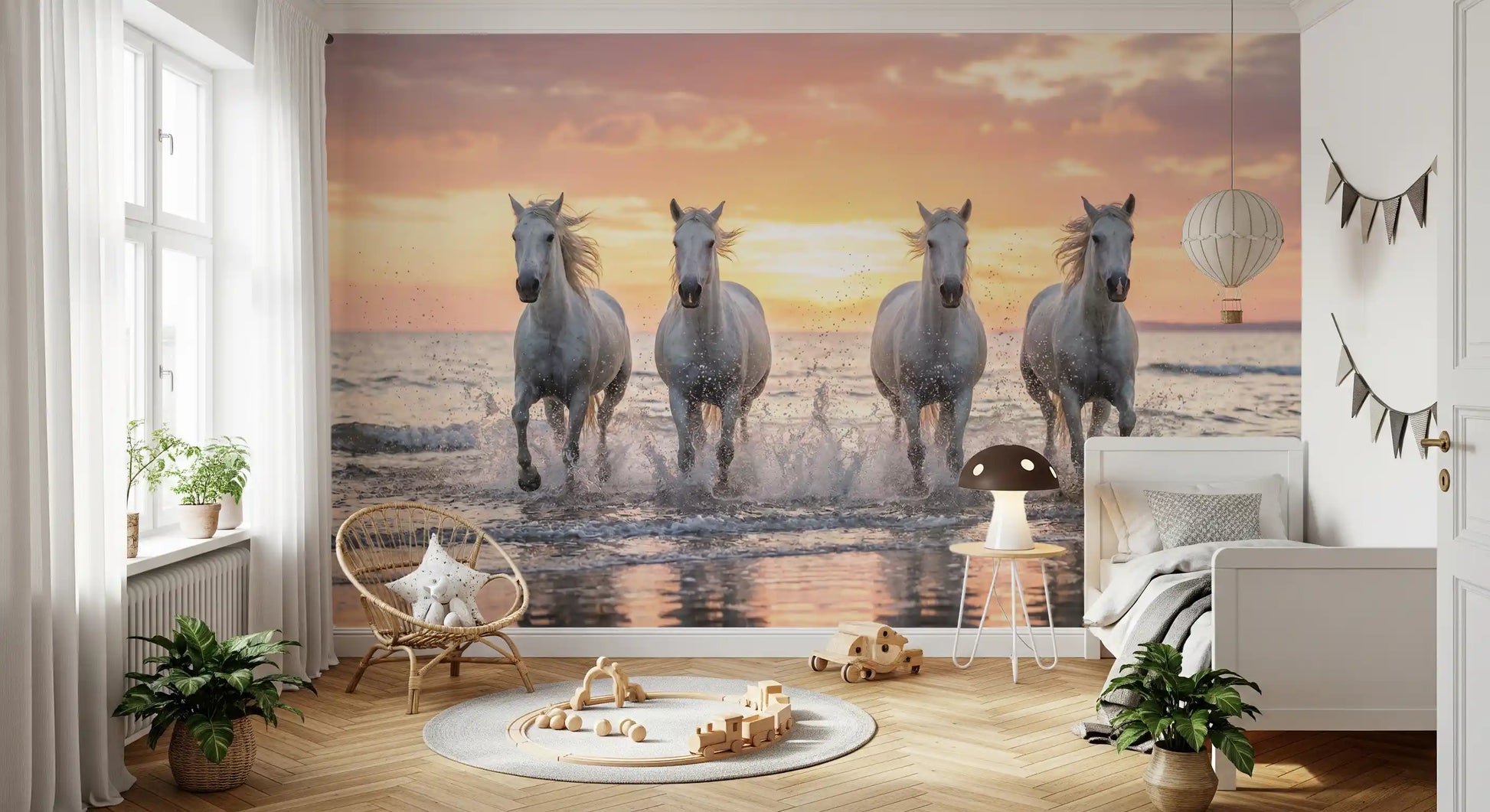 This stunning wallpaper for walls brings the majestic beauty of wild horses to your living space. Four powerful white horses gallop through shallow ocean waters, creating dynamic splashes that capture their raw energy. The breathtaking sunset sky features a harmonious blend of soft oranges, warm yellows, and delicate pinks, casting a golden glow over the tranquil seascape. This captivating design transforms any room into a serene escape. Ideal for a living room, bedroom, or dining area, it infuses elegance and a profound sense of freedom. The vibrant yet calming palette enhances interior spaces, adding both warmth and a touch of dramatic natural beauty.
