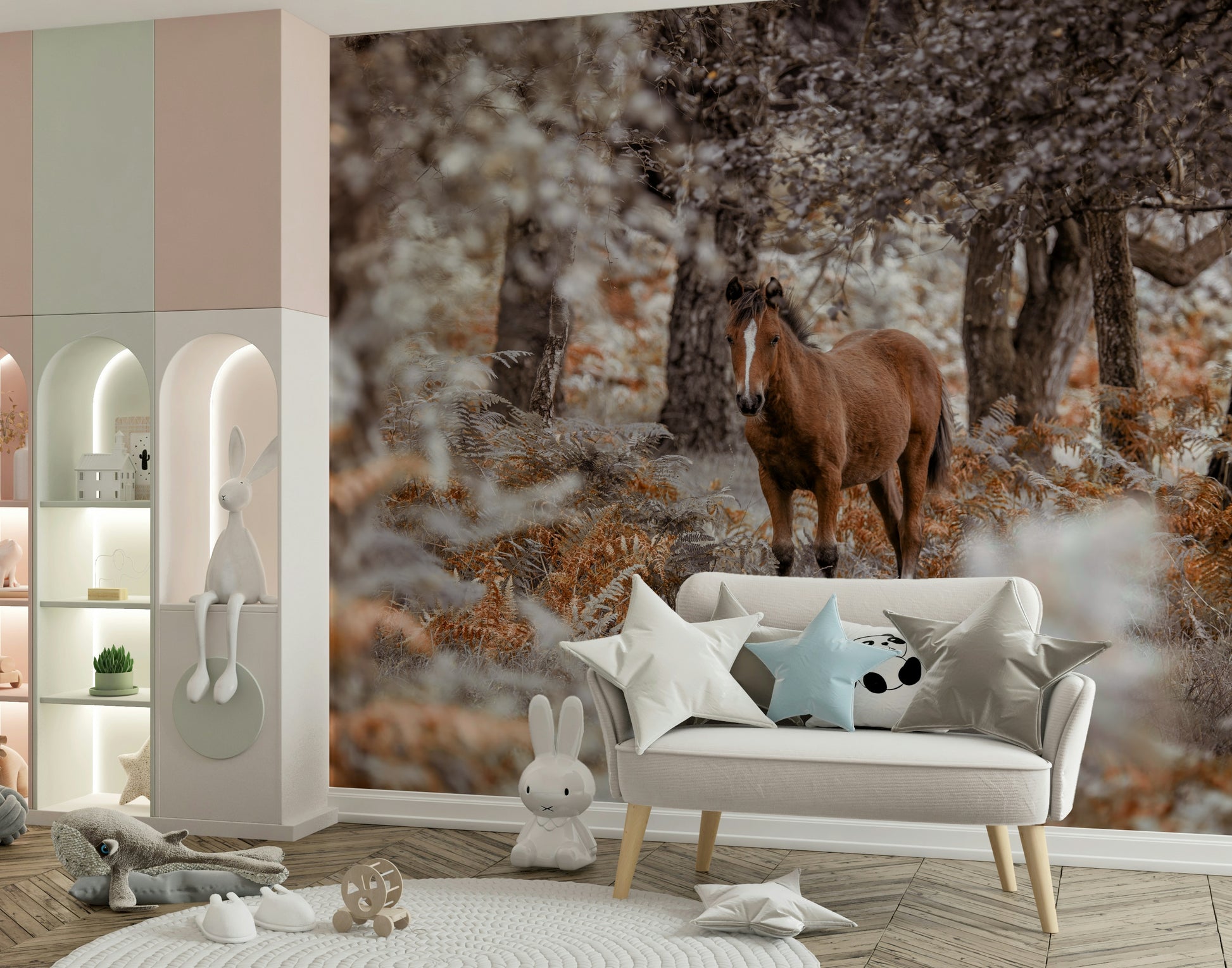 Wild Horse, New Forest. Bring the untamed spirit of the wilderness into your living space with "Wild Stallion." This captivating wall décor piece captures the essence of freedom and raw beauty, showcasing a magnificent horse amidst a serene forest setting. The image features a striking stallion, its coat a rich chestnut hue, standing proudly amidst a carpet of muted ferns and silver-tinged foliage. Filtered light dances through the trees, creating an ethereal atmosphere that evokes a sense of tranquillity and adventure. "Wild Stallion" is more than just decoration; it's an invitation to connect with nature and embrace the untamed spirit within. Let this piece transform your wall into a window to a world of natural wonder, where the beauty and power of the wild reign supreme. Its understated elegance complements a variety of interior styles, adding a touch of rustic charm and sophisticated grace.