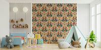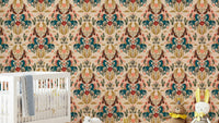 Embrace the mystical beauty of the Wild West with this captivating wallpaper. Vibrant teal horses, adorned with ornate blankets, leap across a stylized desert landscape under a peach-hued sunset. Soaring birds and majestic cacti create a balanced, symmetrical design, complemented by earthy tones and celestial motifs—moons, stars, and stylized clouds. The overall aesthetic blends Southwestern imagery with a touch of Art Deco, creating a unique and sophisticated Wild West experience for your desktop.