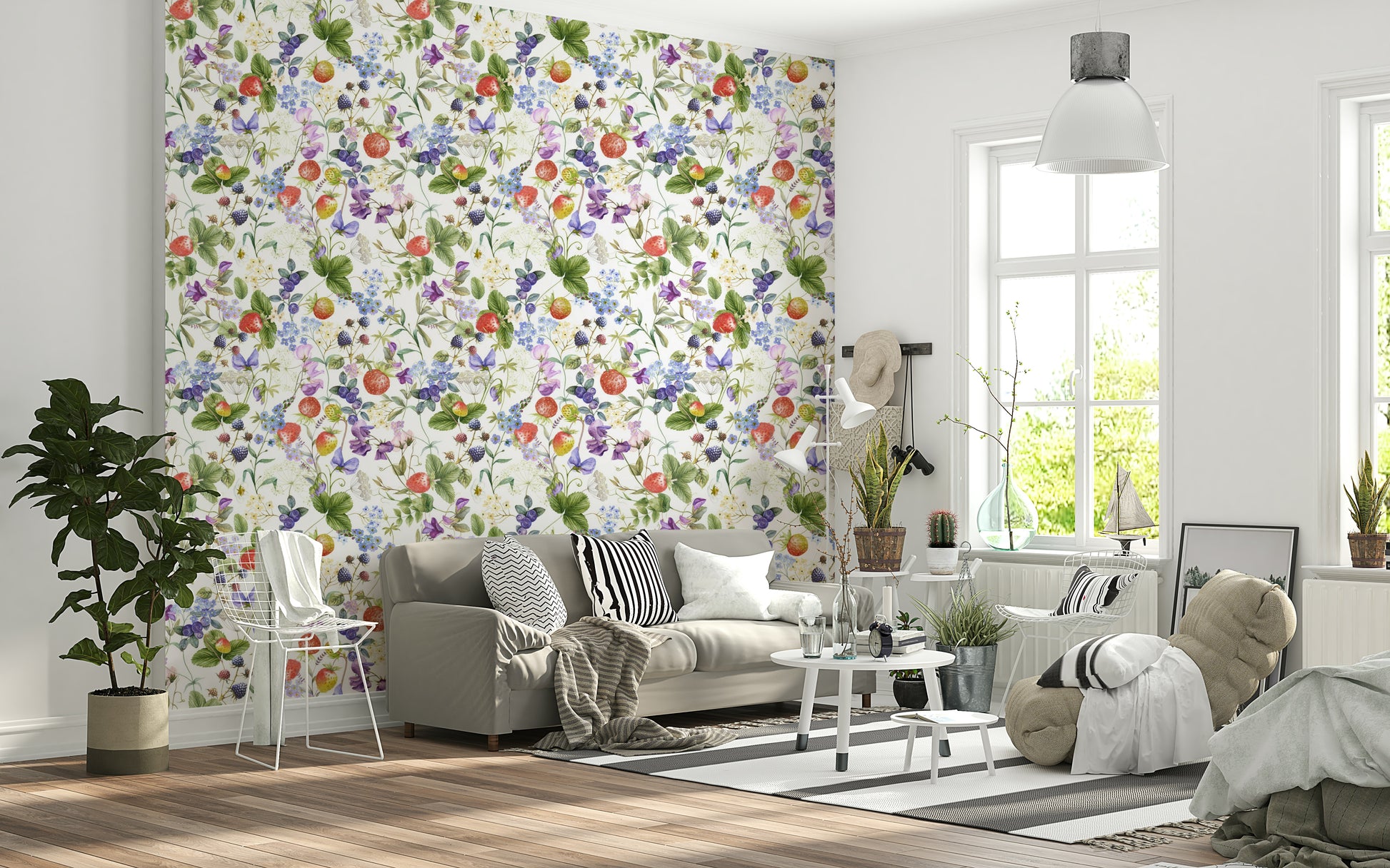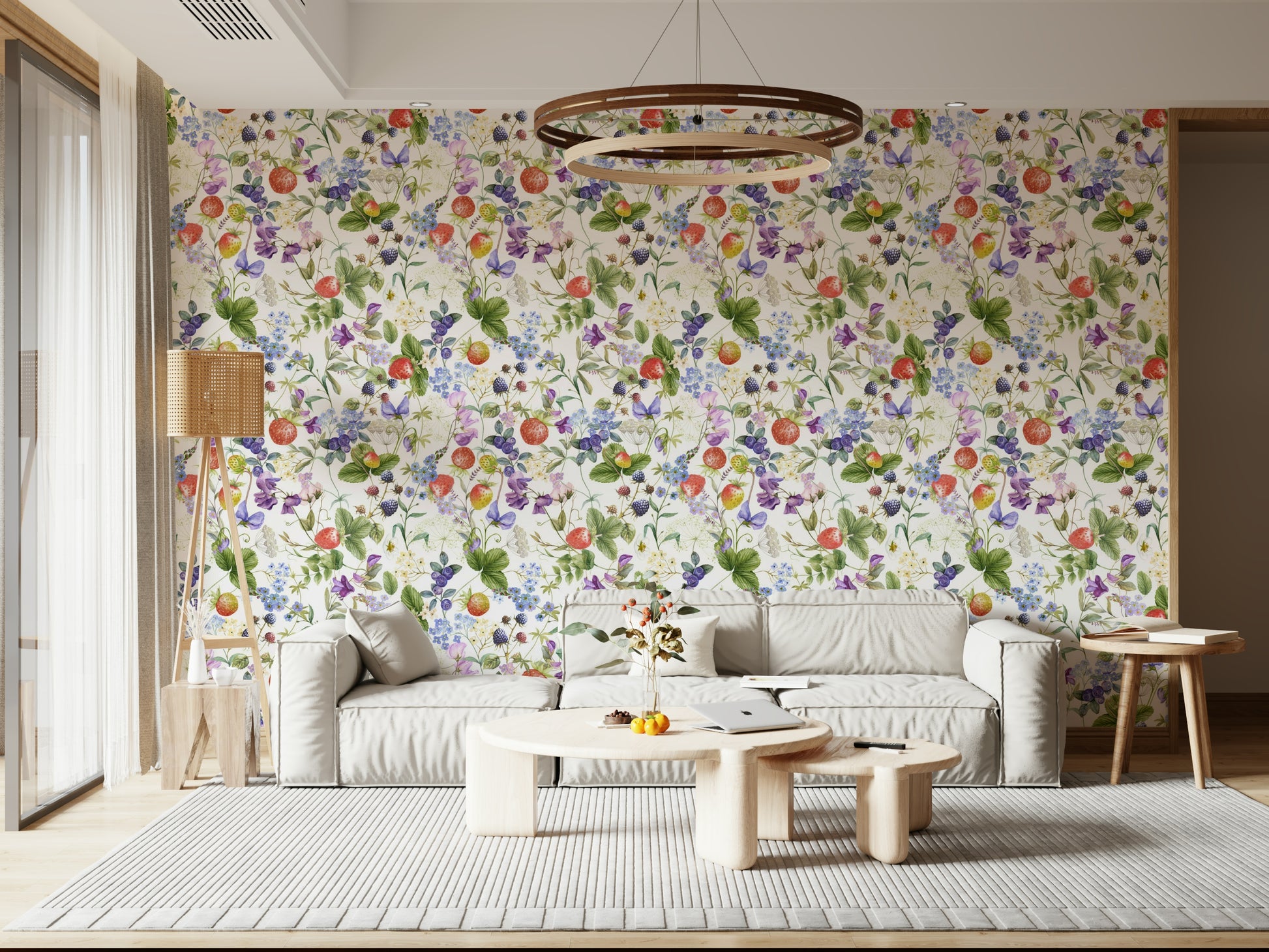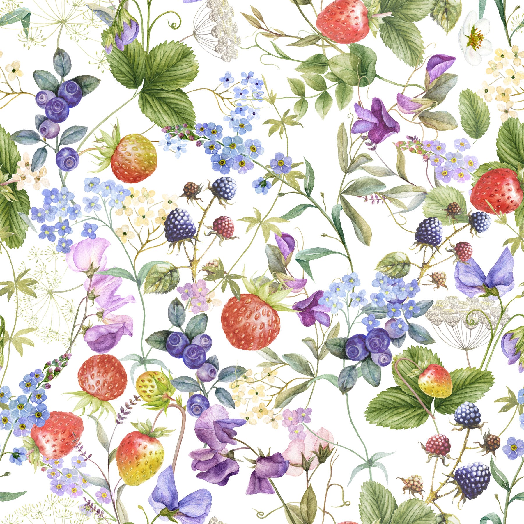 Bring the beauty of a sun-kissed meadow to your home with this elegant watercolor wildflower wallpaper by Uta Naumann. The design bursts with strawberries, blueberries, and diverse flowers, crafted in a painterly style. Shades of red, blue, and green blend seamlessly, creating a vibrant yet serene look. Use this wallpaper for walls to breathe new life into living rooms, bedrooms, or nurseries. It enhances interiors with its fresh aesthetic, injecting a dose of playful and joyful style. This wallpaper adds personality and charm to your space.