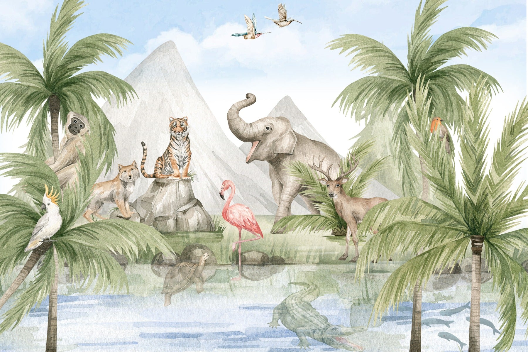 Step off the beaten path and into the heart of nature with the Wildlife Wonders wallpaper mural. A lavish celebration of the animal kingdom, this exquisite mural captures the untamed beauty of a jungle's inhabitants in their natural habitat. Picture the regal tiger, the wise elephant, and a flamboyance of flamingos coming to life on your walls, bringing the vibrancy of the wild indoors. This African jungle wallpaper is a symphony of nature’s splendor, meticulously crafted to showcase each creature in vivid detail. Imagine the intrigue and delight as your walls become a canvas for this rich, storytelling panorama. It's more than just animal wallpaper; it's a gateway to adventure, a visual journey that beckons you to a world teeming with life and color. Embrace the call of the wild with this enchanting mural, where every glance is a new discovery, and every room is a safari waiting to be explored.