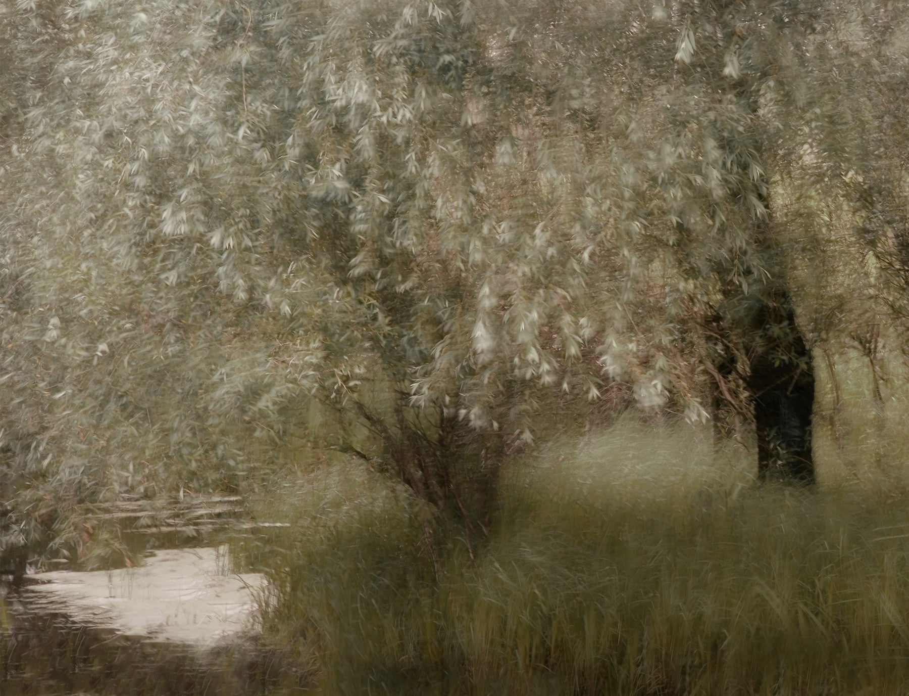 This elegant wallpaper for walls creates a serene escape. The blurred effect highlights light filtering through the willow tree’s slender leaves. Muted greens and browns create a calm atmosphere. It offers a natural vibe that suits living rooms, bedrooms, or hallways. This wallpaper invites the beauty of the outdoors, generating a feeling of peace and understated elegance.
