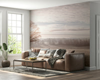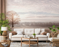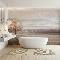 Trees in meadow. Capture the serene beauty of a winter landscape with this panoramic view. A lone tree stands in a field, dusted with frost, while soft light filters through the sky. The design brings a calming presence into any space, promoting a sense of peace. This wallpaper for walls introduces natural elements without overwhelming a room. Ideal for living rooms, bedrooms, or offices, it creates a relaxing backdrop. The neutral color palette makes it a perfect choice for Scandinavian or minimalist interiors.