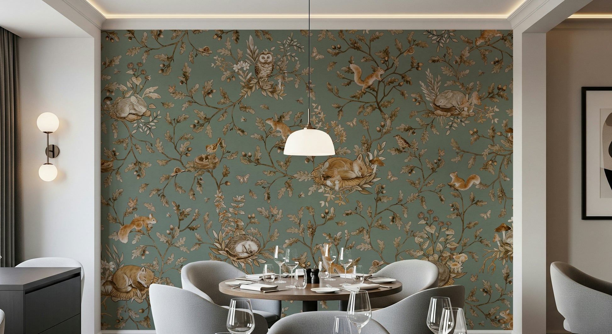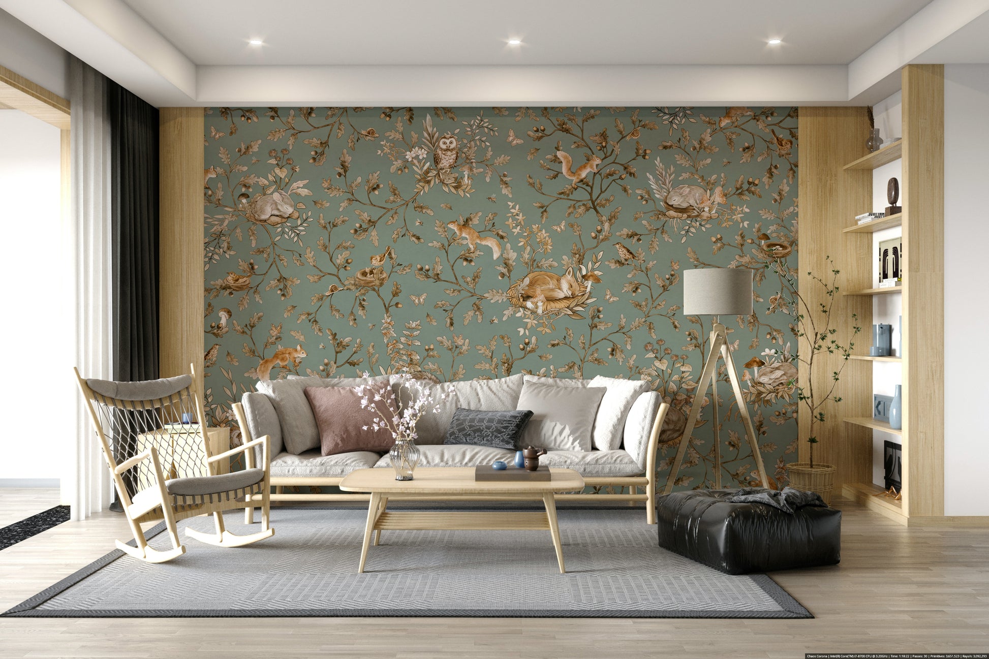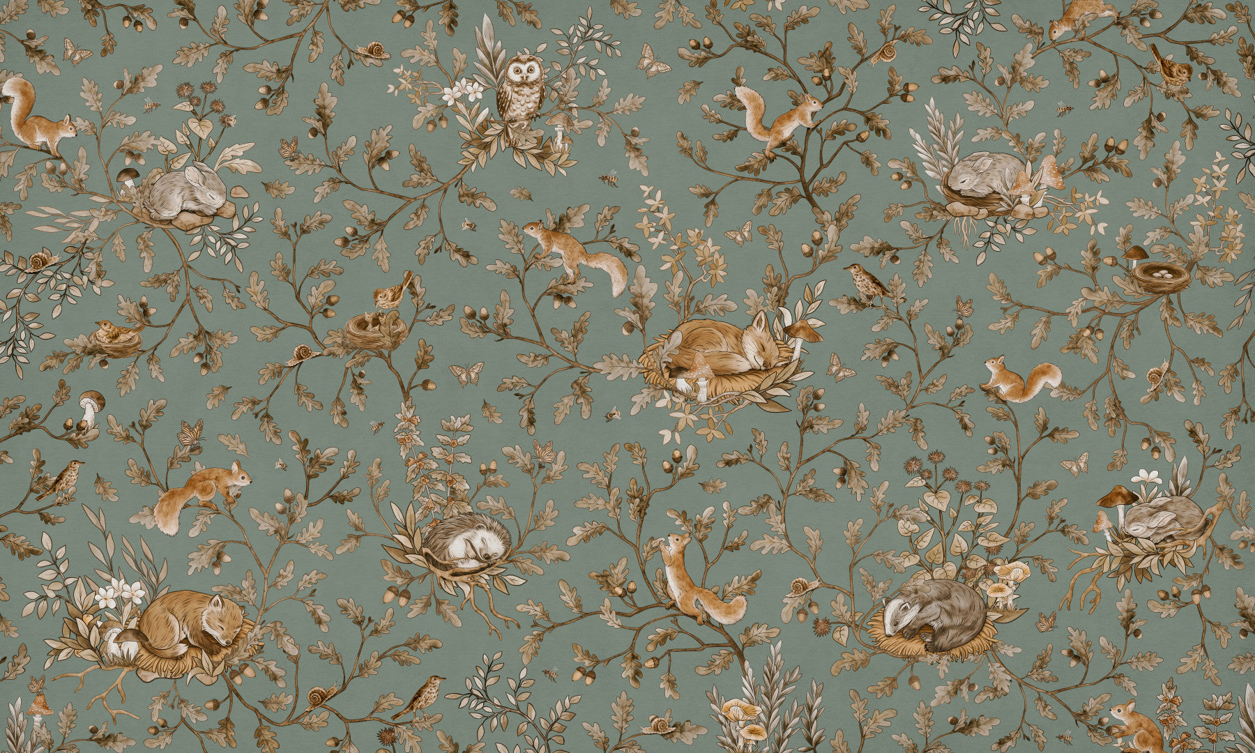 Invite nature indoors with this enchanting forest-inspired wallpaper for walls. Featuring charming illustrations of sleeping animals nestled among oak branches and delicate flora, this design brings a sense of calm and wonder to any space. The muted earthy tones of beige, brown, and soft green offer a soothing backdrop, perfect for creating a relaxing ambiance in bedrooms, nurseries, or living rooms. This wallpaper transforms interiors with a touch of whimsical elegance and rustic charm.