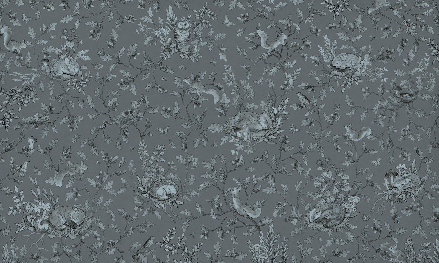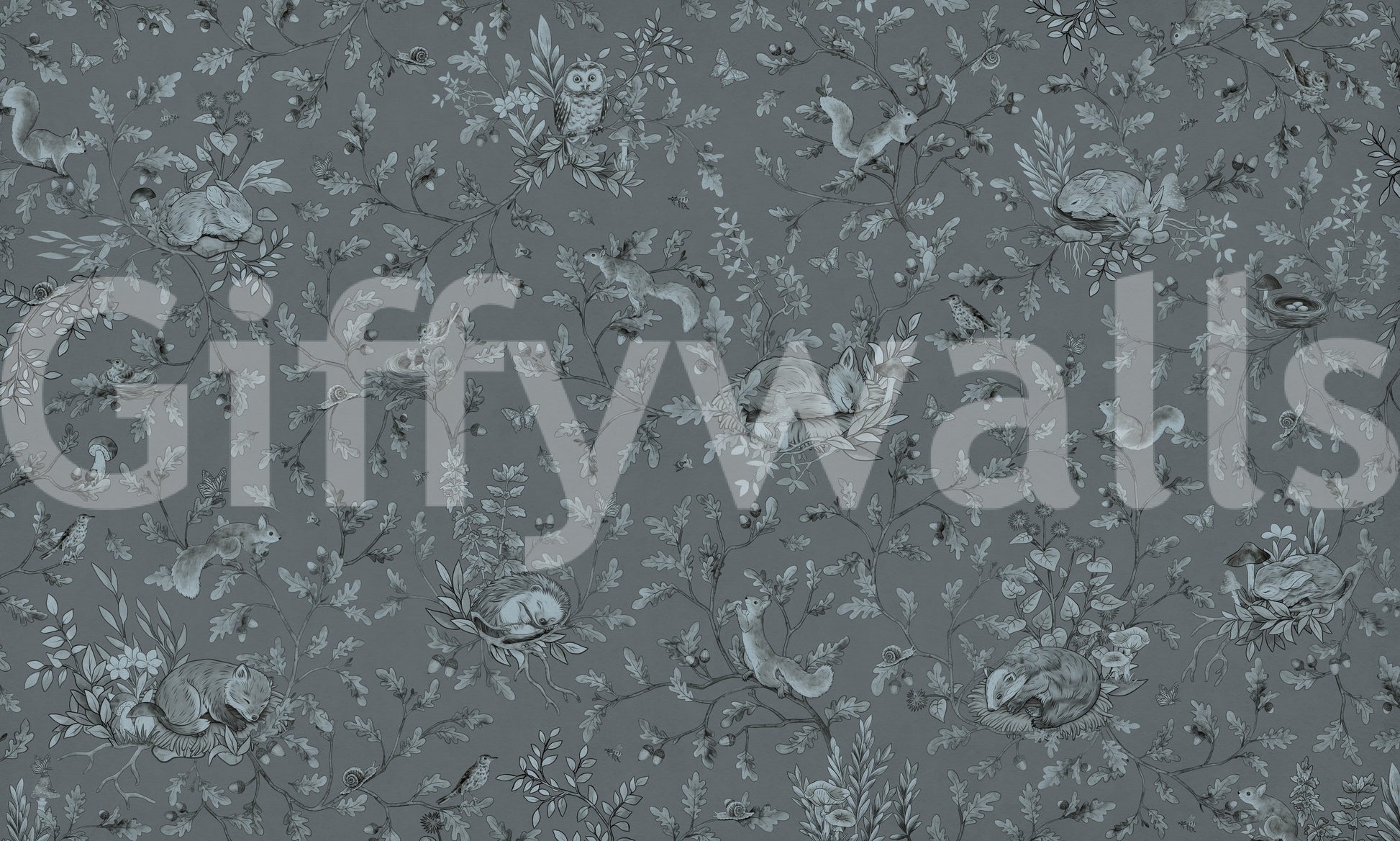 Drift into a peaceful slumber with this calming wallpaper for walls. A collection of forest friends, including foxes, squirrels and hedgehogs, are artfully nestled among branches, flowers, and acorns. Rendered in a monochrome palette with shades of grey, this enchanting scene is perfect for creating a relaxing atmosphere in bedrooms, nurseries, or reading nooks. The detailed illustrations bring a touch of nature indoors and complement interiors with their subtle charm.