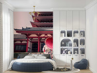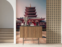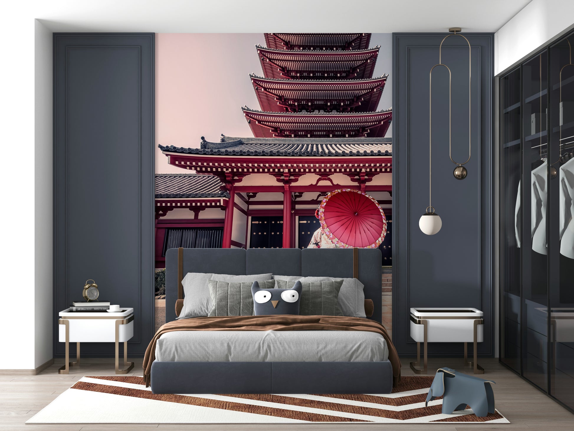 Elevate your interior with this stunning pagoda wallpaper. The multi-tiered pagoda design, featuring rich reds and dark accents, provides a visually engaging focal point. A lone woman in a floral kimono carrying a matching parasol adds a human element. This wallpaper for walls infuses a sense of peace and sophistication into any room. Ideal for a study, bedroom, or meditation space, it works well with minimalist decor, creating an ambiance of quiet contemplation. Enhance your home with cultural elegance.