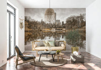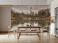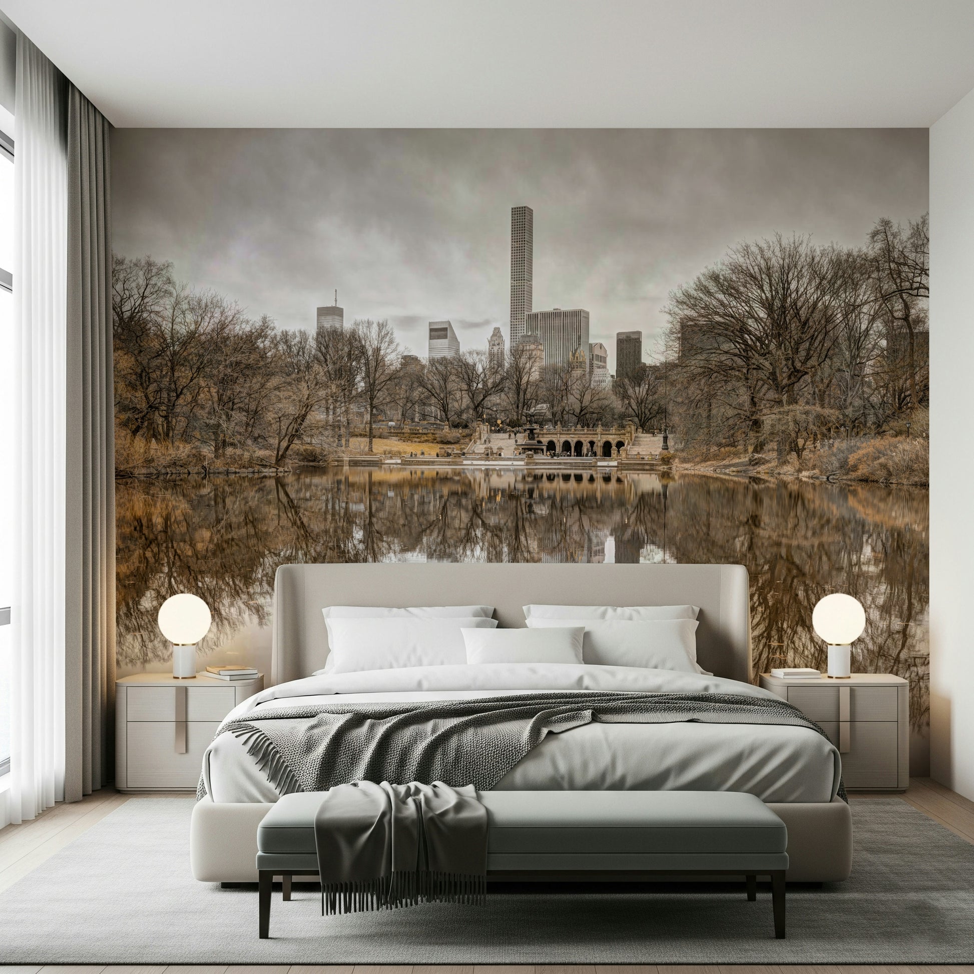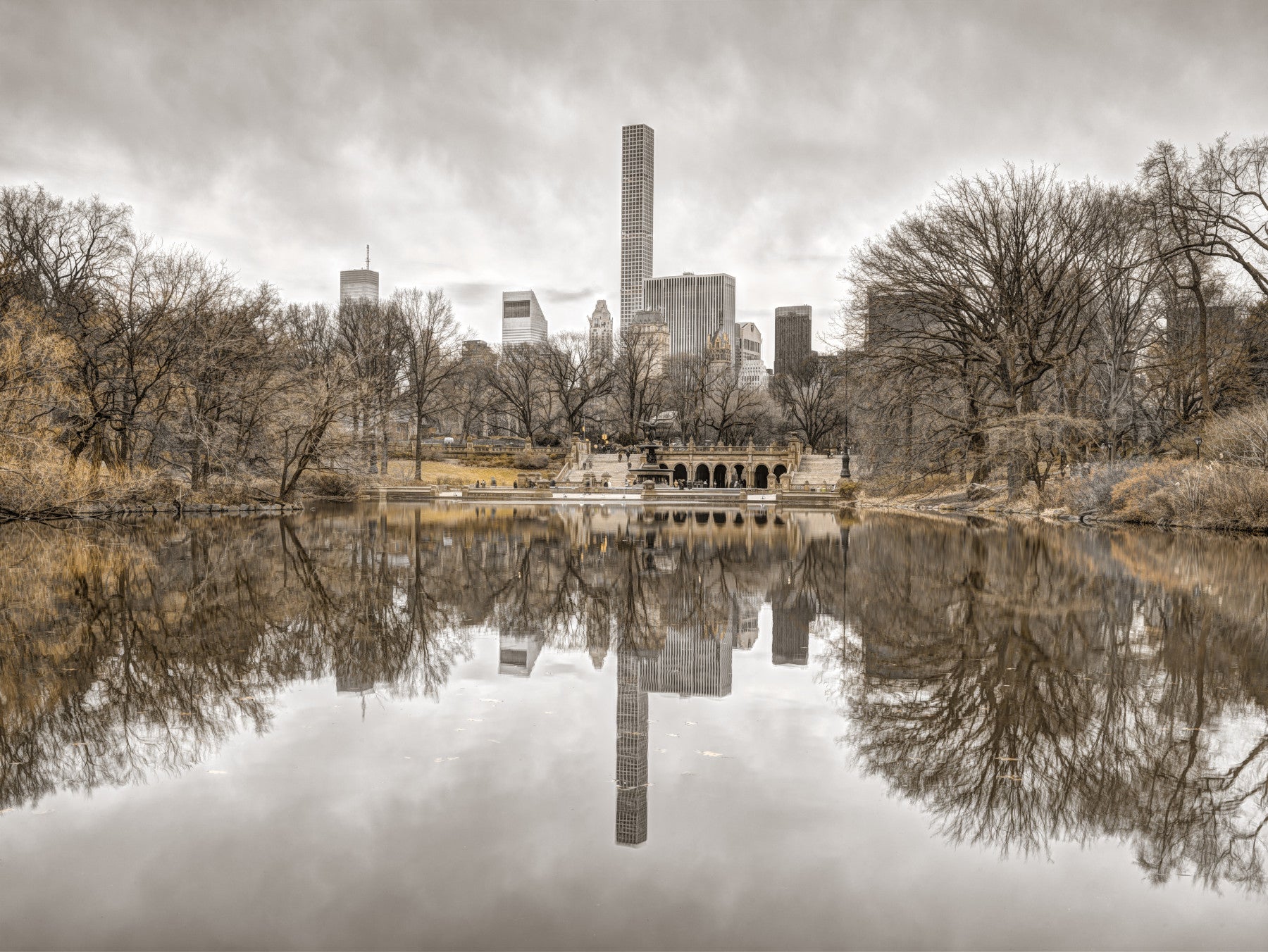 Lower Manhattan skyline from Central park, New York. Adorn your walls with "Contrast of Worlds," a visual exploration of nature's serenity juxtaposed with urban ambition. This piece captures a tranquil body of water mirroring a skyline defined by towering architecture, showcasing the harmony and tension between organic and constructed environments. The monochromatic palette adds a timeless quality, emphasizing the textures of bare trees and the sleek surfaces of city structures. The still water creates a perfect reflection, blurring the lines between reality and illusion, inviting introspection and contemplation. Ideal for spaces seeking a sophisticated and thought-provoking accent, this design serves as a reminder of the diverse yet interconnected elements that shape our world. It transforms any wall into a window offering a unique perspective on balance and coexistence, the perfect conversation starter.