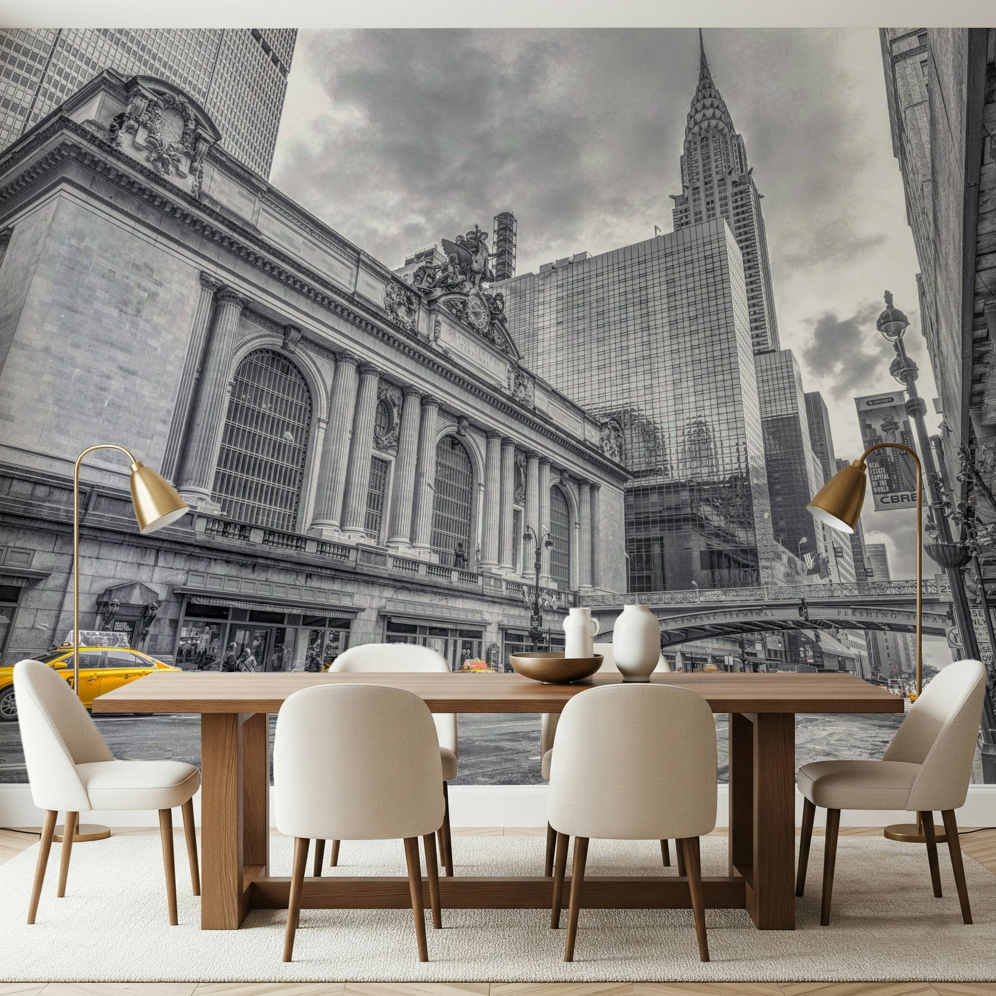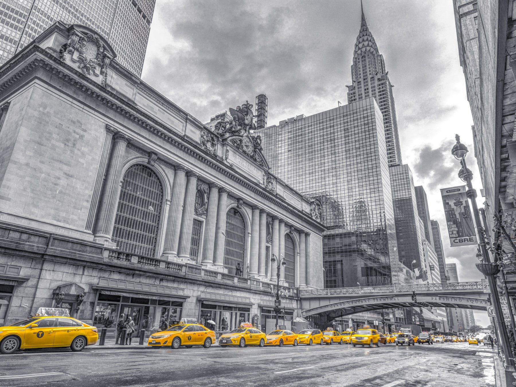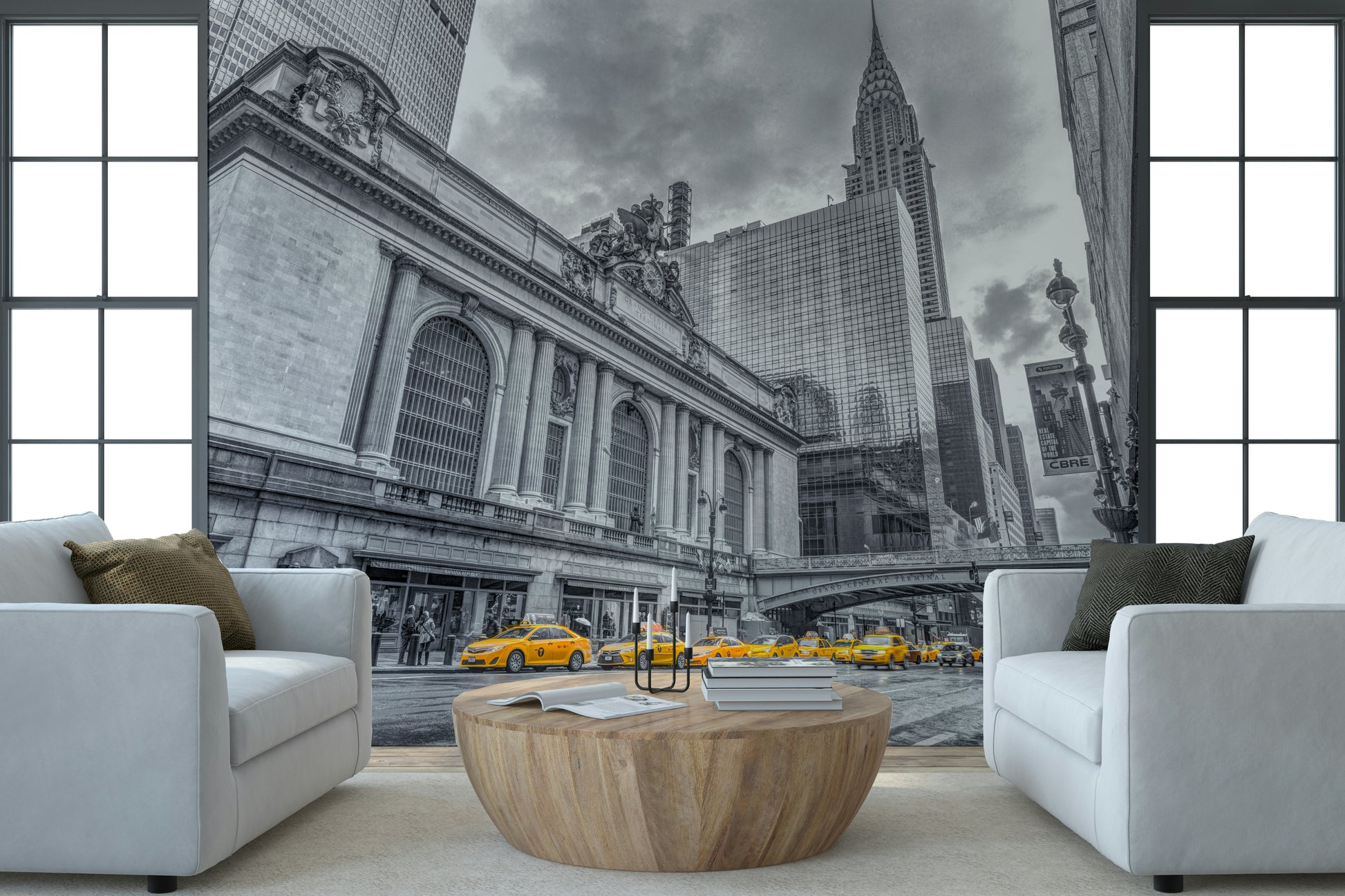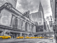 Cabs in front of the Grand Central Terminal, New York. Transform your living space with this captivating wall décor piece, showcasing the iconic Grand Central Terminal. The monochrome palette emphasizes the architectural grandeur of the building, juxtaposed against the vibrant yellow of a fleet of New York taxis, creating a striking visual contrast that commands attention. The intricate details of the terminal's facade, from its majestic columns to its ornate sculptures, are rendered with stunning clarity. Rising behind the terminal are the towering skyscrapers of Midtown Manhattan, adding depth and a sense of scale to the composition. This artwork captures the energy and timeless elegance of one of New York City's most beloved landmarks, bringing a touch of urban sophistication and historic charm to any room. Ideal for lovers of architecture, cityscapes, and the vibrant spirit of New York.