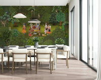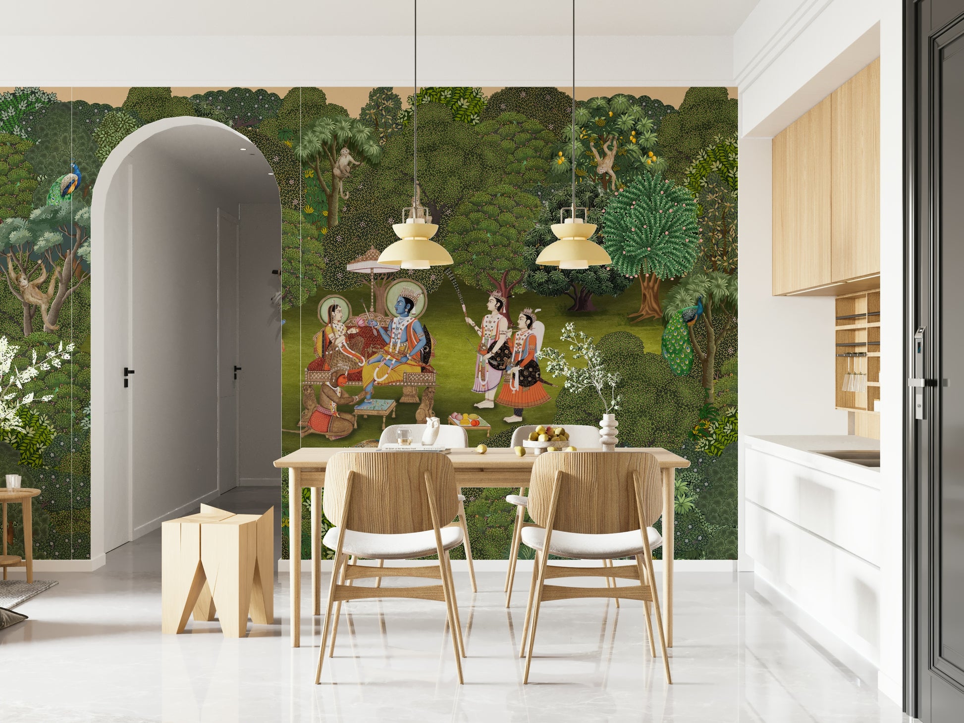 Immerse yourself in the serene beauty of 'Panchavati Vihar', a meticulously crafted wall décor piece inspired by traditional Indian art. This vibrant artwork transports you to a lush, enchanted forest. Ram and Sita, the divine couple, are depicted in peaceful repose amidst a thriving natural world, surrounded by courtiers and attendants. Towering trees filled with vibrant leaves and ripe fruits create a dense, captivating backdrop. Peacocks strut proudly, monkeys playfully swing through the branches, and a gentle deer graces the forest floor. The intricate details and rich color palette bring a touch of timeless elegance and spiritual harmony to any room, transforming your space into a tranquil sanctuary. Let this idyllic scene infuse your home with the essence of tranquility and regal charm.