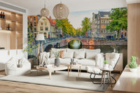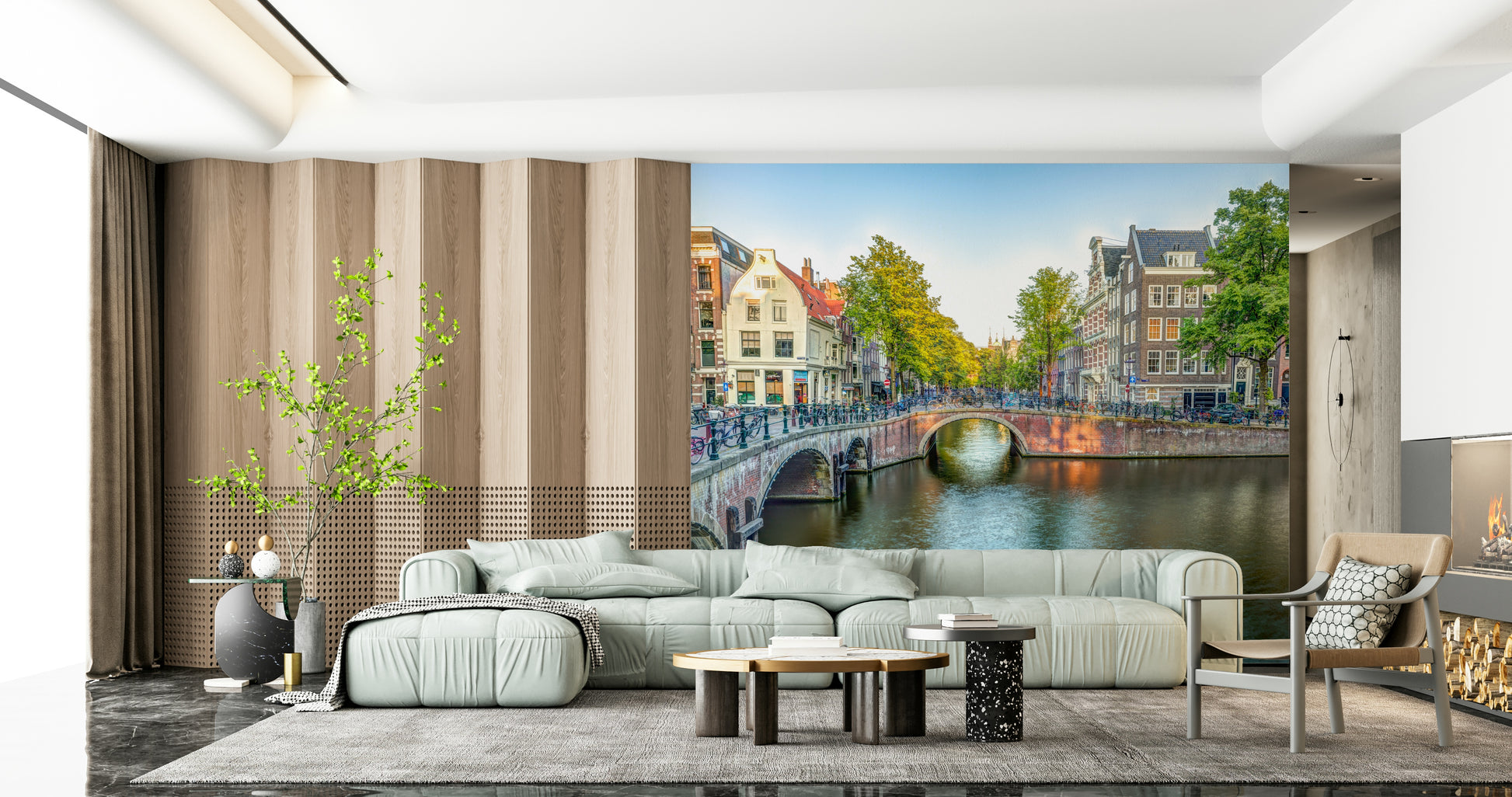Canal through Amsterdam city. Transform your space with the timeless charm of Amsterdam. This wall décor piece captures the tranquil beauty of a quintessential Amsterdam canal scene. Imagine the serene water reflecting the warm hues of the brick bridges and the iconic Dutch architecture that lines the waterways. Bicycles rest casually along the bridge's edge, hinting at the city's vibrant, eco-conscious culture. Lush green trees create a beautiful frame, adding a touch of nature to this urban landscape. The subtle golden light filtering through the scene evokes a sense of peace and invites you to step into the heart of this captivating city. Infuse your environment with a touch of European elegance and the laid-back atmosphere of Amsterdam's canals with this evocative wall art.