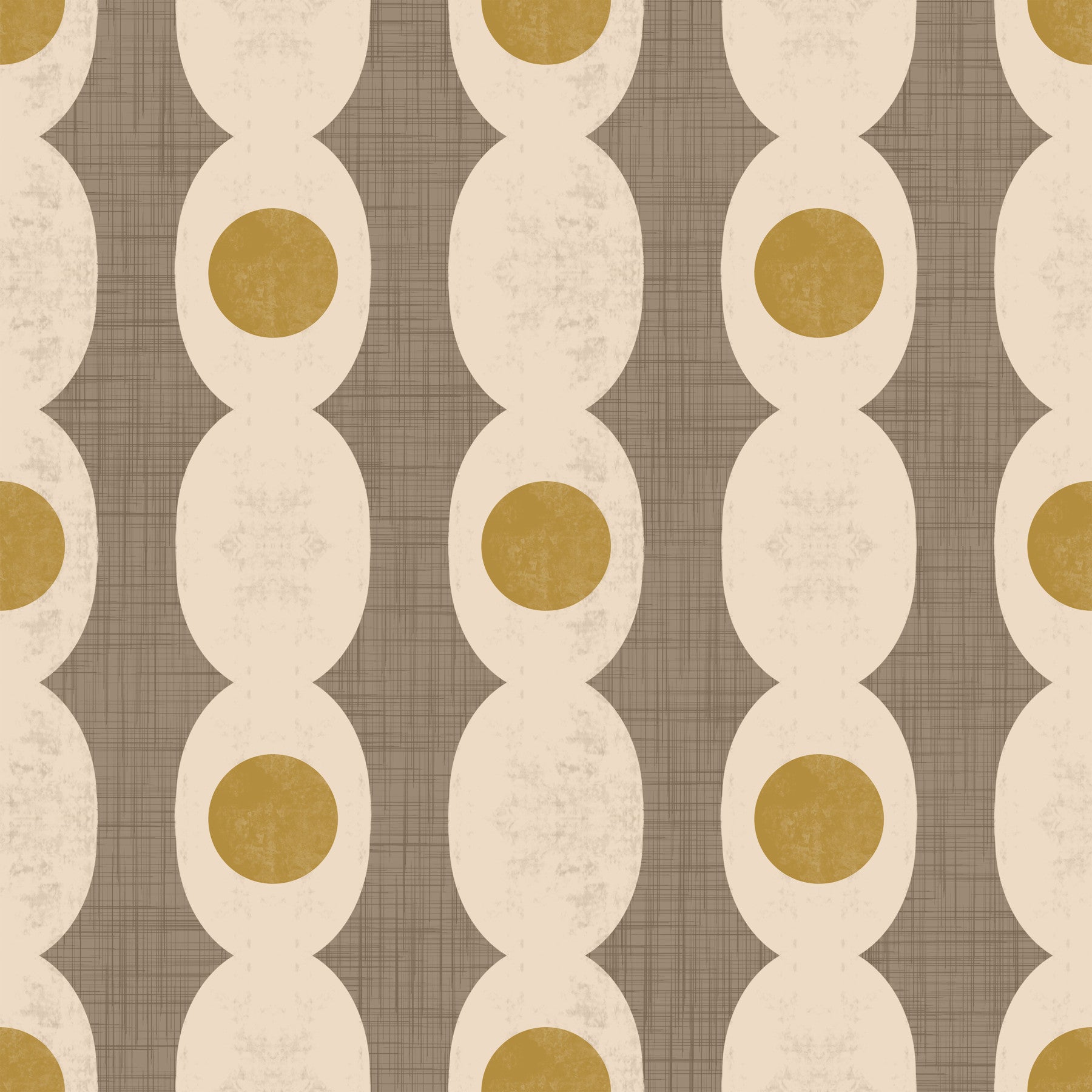 Infuse your home with a dose of vintage style through this wallpaper for walls. It displays stacked, off-white ovals punctuated by mustard yellow circles. A crosshatch pattern in taupe sets the design nicely. The vintage feel is balanced by a neutral color scheme. Consider this in a bedroom, living room, dining area, or home office. The design gives a stylish vintage look while still complementing other furniture and décor elements.