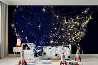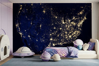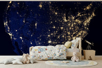 Transform your walls with this stunning depiction of the United States at night. The wallpaper for walls showcases the brilliance of urban centers and the interconnectedness of communities across the nation. A deep blue backdrop contrasts with the warm golden glow of city lights, creating a dramatic and captivating effect. This design works beautifully in a modern living room, a home office, or even a teen’s bedroom, adding depth and a sense of wonder to the space. It is perfect for sparking conversation and enhancing the sophistication of interior schemes.