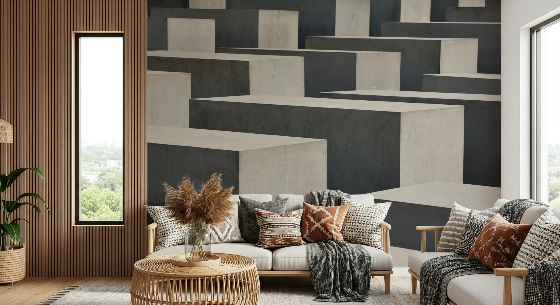Explore a world of modern art with this captivating geometric design. The concrete blocks create an abstract landscape that plays with light and shadow. This wallpaper for walls works well in minimalist living rooms, industrial-style offices, or a contemporary hallway. The neutral gray tones blend into your home, while the strong lines give a bold touch. Add depth and dimension to your space.