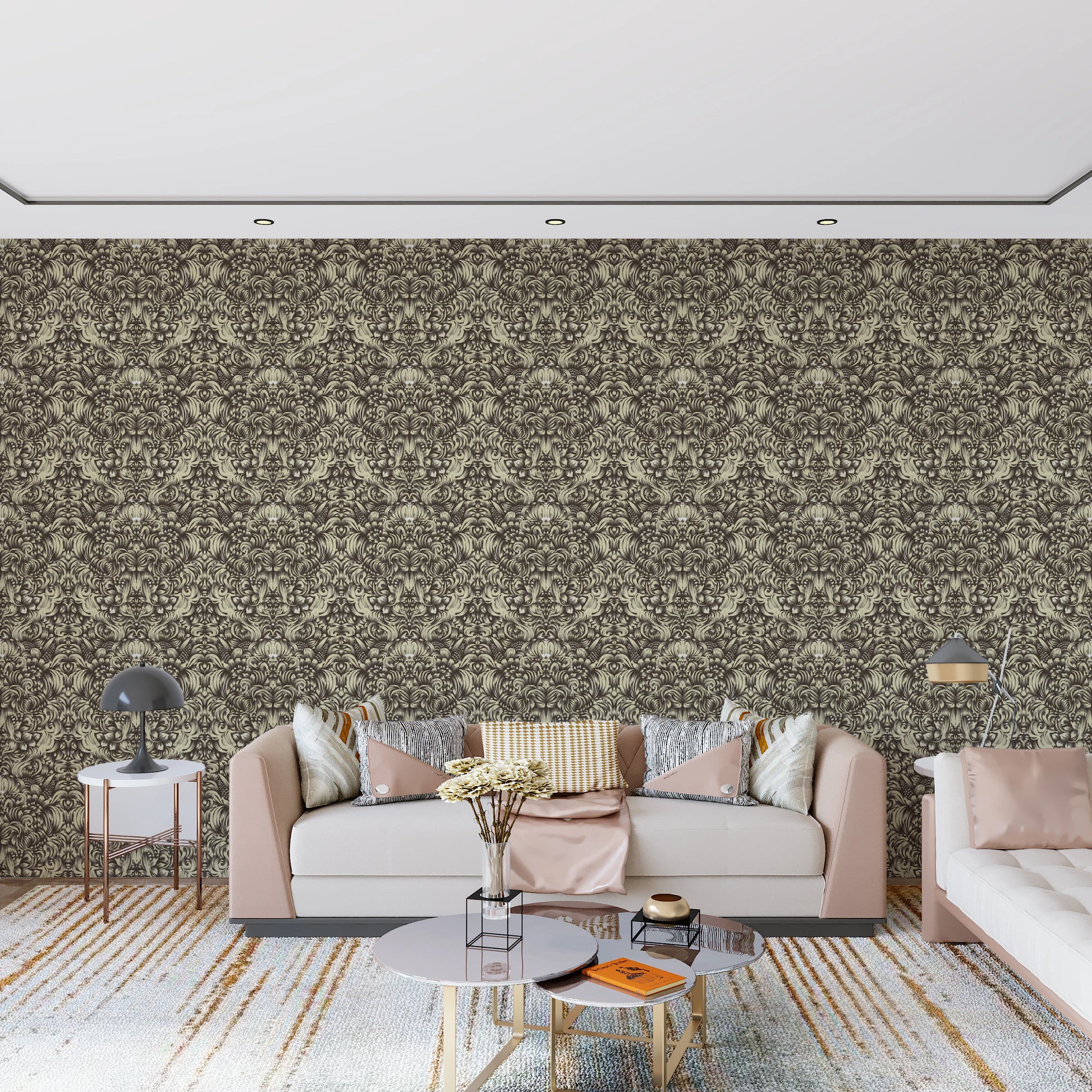 Tuo klassista viehätysvoimaa asuintilaasi tällä kukkaisella damaskikuvioisella seinätapetilla. Kuosissa on monimutkaisia, tyyliteltyjä kukkaelementtejä, jotka on järjestetty perinteiseen damaskikuvioon. rustiikkinen, damaski, kermanvärinen, antiikki, vintage-henkinen, barokkityylinen eleganssi, koristeelliset pyörteet, koristeellinen seinävaate, kulunut tekstuuri, ikääntynyt patina, perintötyyli, klassinen eurooppalainen, ranskalainen maalaistyyli, shabby chic, maalaistalon luksus, romanttiset yksityiskohdat, viktoriaaninen vaikutus, hillitty norsunluu, pehmeä beige, neutraali paletti, monimutkainen spiraalikuviointi, koristeelliset koristeet, ajaton kuvio, kuninkaallinen motiivi, perinnetyyli, vanhan maailman charmi, haalistunut loisto, sään kuluttama viimeistely