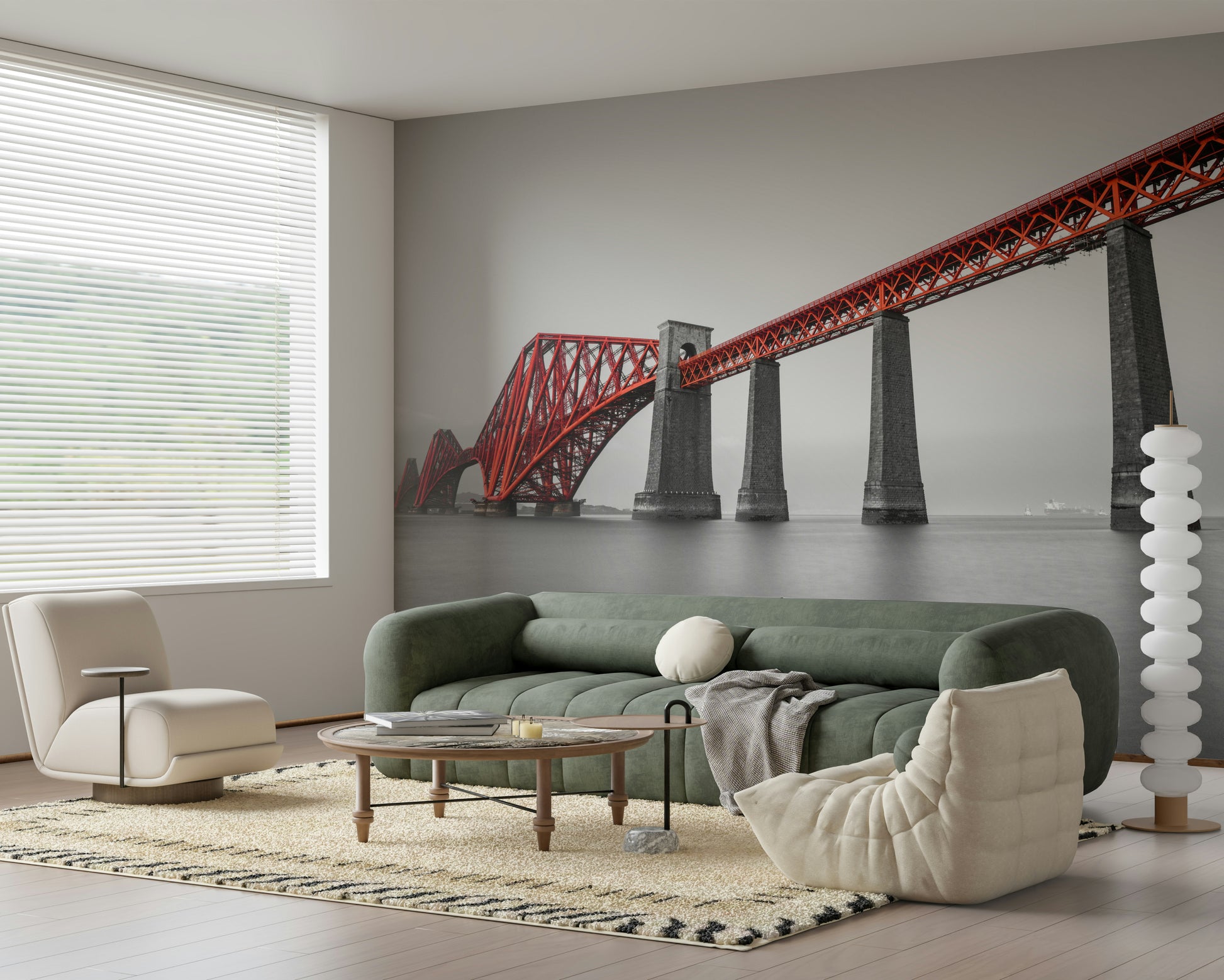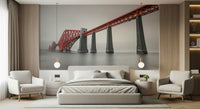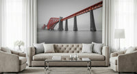 Forth Rail Bridge, Scotland. Elevate your space with this architectural marvel. This wallpaper for walls presents a dramatic view of a striking red bridge, its intricate steel structure sharply contrasted against a muted grey backdrop. The long exposure creates a serene water surface. The selective color draws the eye, making it a captivating focal point in any room. It works well in modern living rooms, studies, or even hallways seeking a touch of industrial chic. The composition and tones add depth to interior spaces, enhancing their sense of scale and artistry.