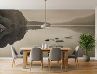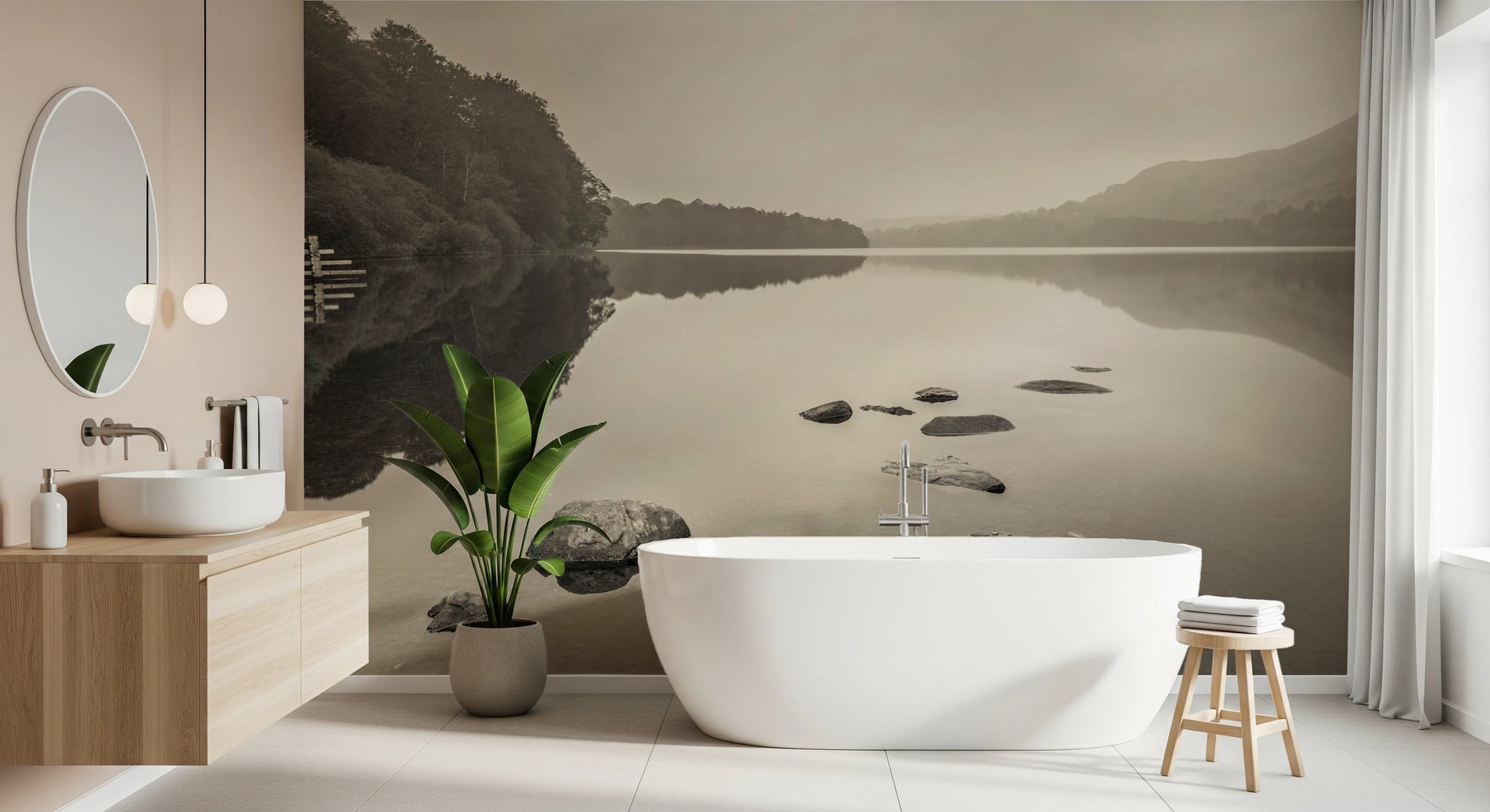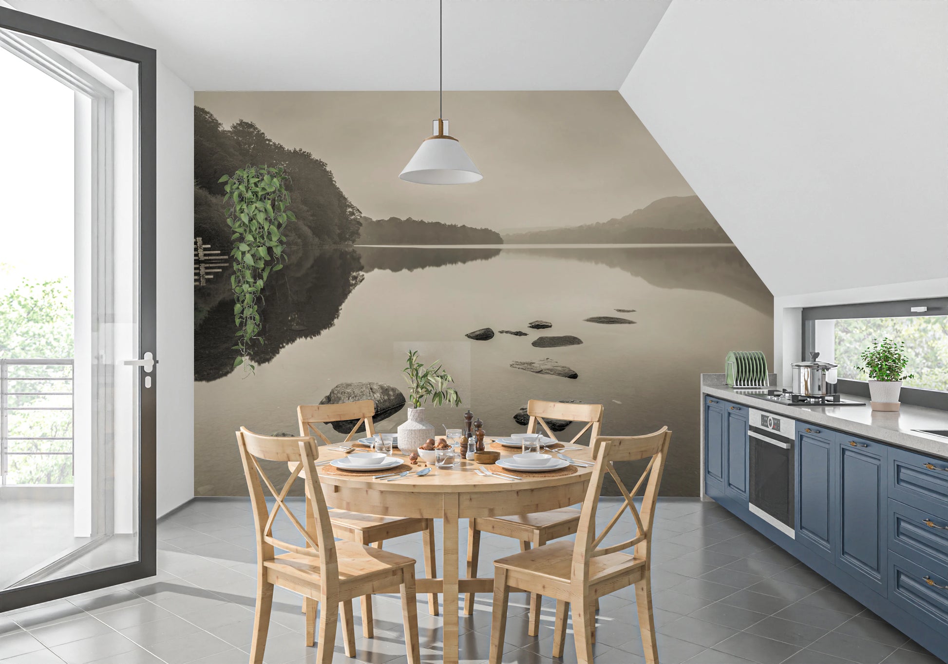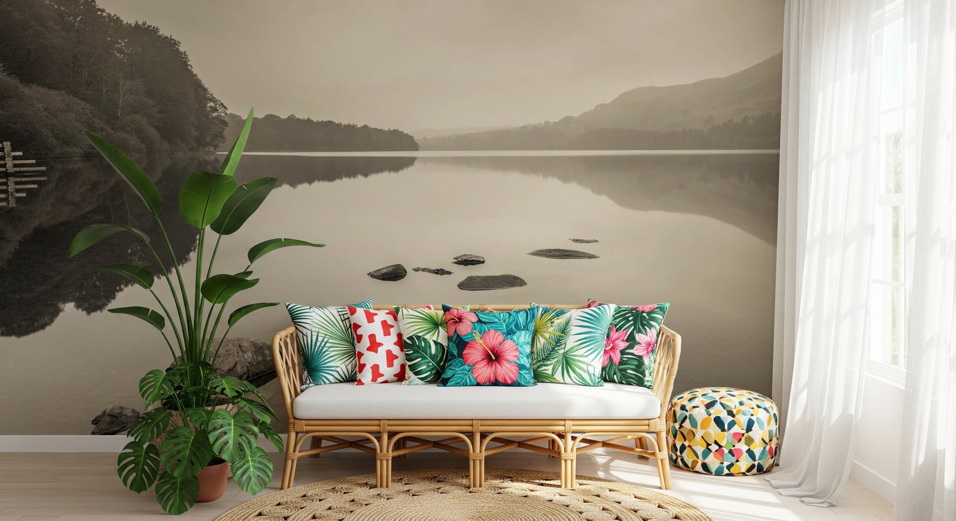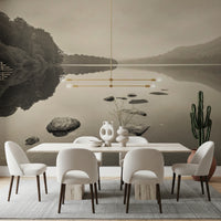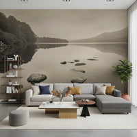 Kutsu rauhaa tilaasi 'Järven rauha' -teoksella. Tämä seesteinen näkymä vangitsee tyynen järven eteerisen kauneuden, sen pinnan peilaaessa taivaan ja ympäröivien kukkuloiden pehmeitä, vaimennettuja sävyjä. Vedestä nousee rivi kiviä, jotka luovat polun tämän rauhallisen maiseman sydämeen. Kokonaisvaikutelma on syvän hiljaisuuden tunne, turvapaikka arjen pakopaikasta. Tämä seinäkoriste on ihanteellinen luomaan rauhoittava tunnelma mihin tahansa huoneeseen, ja se tarjoaa hienovaraisen mutta voimakkaan seesteisyyden ilmaisun. Sen neutraali paletti varmistaa saumattoman integroinnin erilaisiin sisustustyyleihin ja lupaa rauhoittavan ja hienostuneen tunnelman.