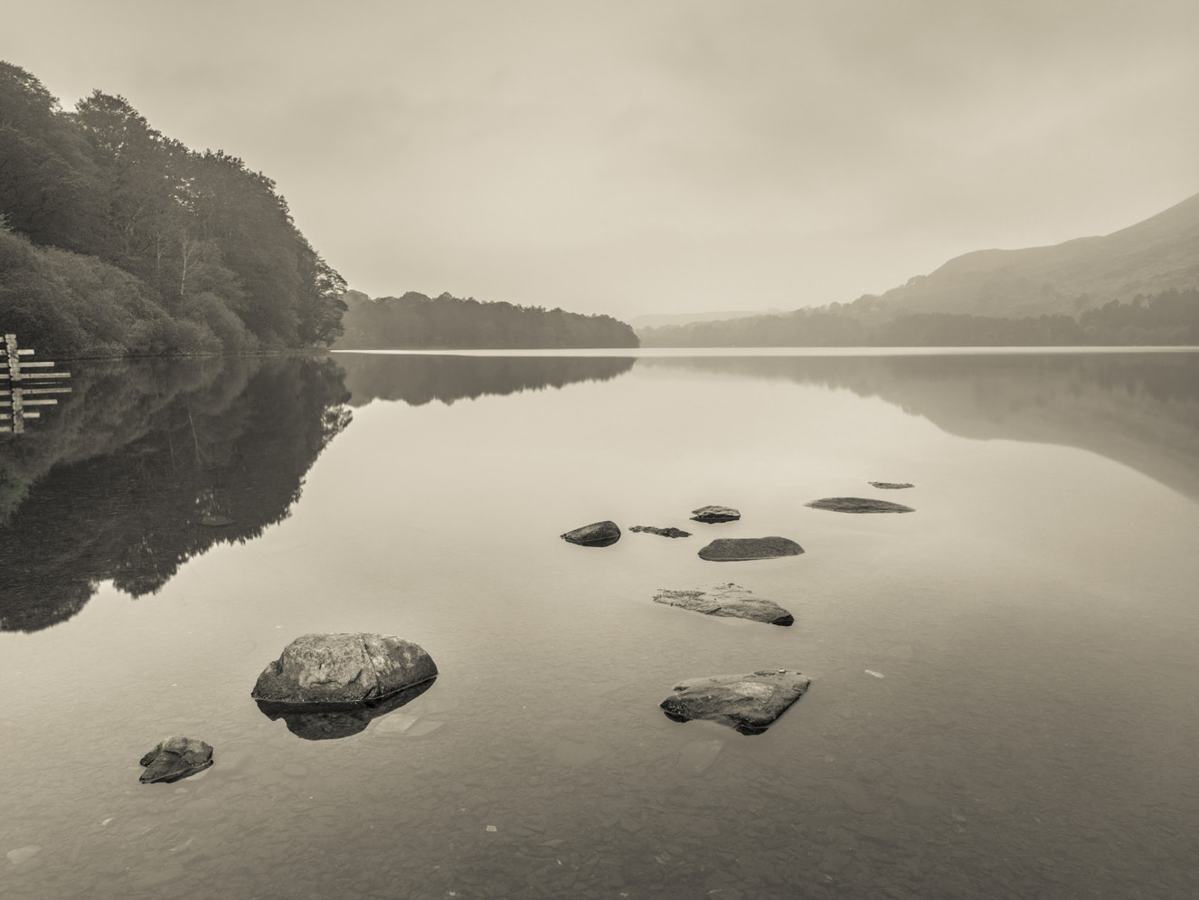 Lifestyle view with the mural behind a simple wooden desk and chair.