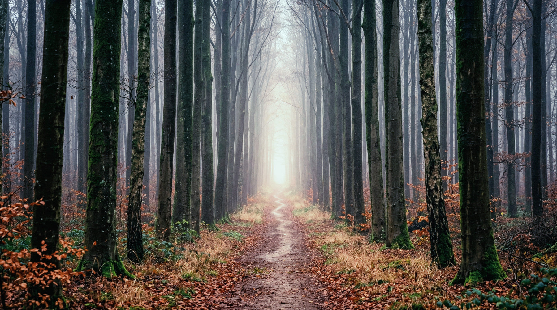 Tämä lumoava seinätapetti muuttaa minkä tahansa huoneen rauhalliseksi metsäpakopaikaksi. Korkeat, sammaleen peittämät puunrungot luovat majesteettisen luonnollisen käytävän, joka vetää katseen mutkittelevaa polkua pitkin. Polun päässä oleva pehmeä, valoisa valo antaa kuosille toivon ja syvyyden tunteen. Maanläheinen väripaletti sisältää syvän sammaleen vihreän ja pudonneiden lehtien rikkaan syksyisen ruskean sävyjä, joita täydentävät kauniisti utuisen harmaan ja vaaleansinisen sävyt kaukaisessa sumussa. Tämä tunnelmallinen kohtaus tuo seesteisen ja mietiskelevän tunnelman olohuoneisiin, makuuhuoneisiin tai meditaatioalueille. Muotoilu parantaa sisätiloja luomalla mukaansatempaavan, rauhallisen taustan, joka kutsuu tyyneyteen ja yhteyteen luonnon kanssa. Se sopii täydellisesti ihmetystä herättävän seinän luomiseen.