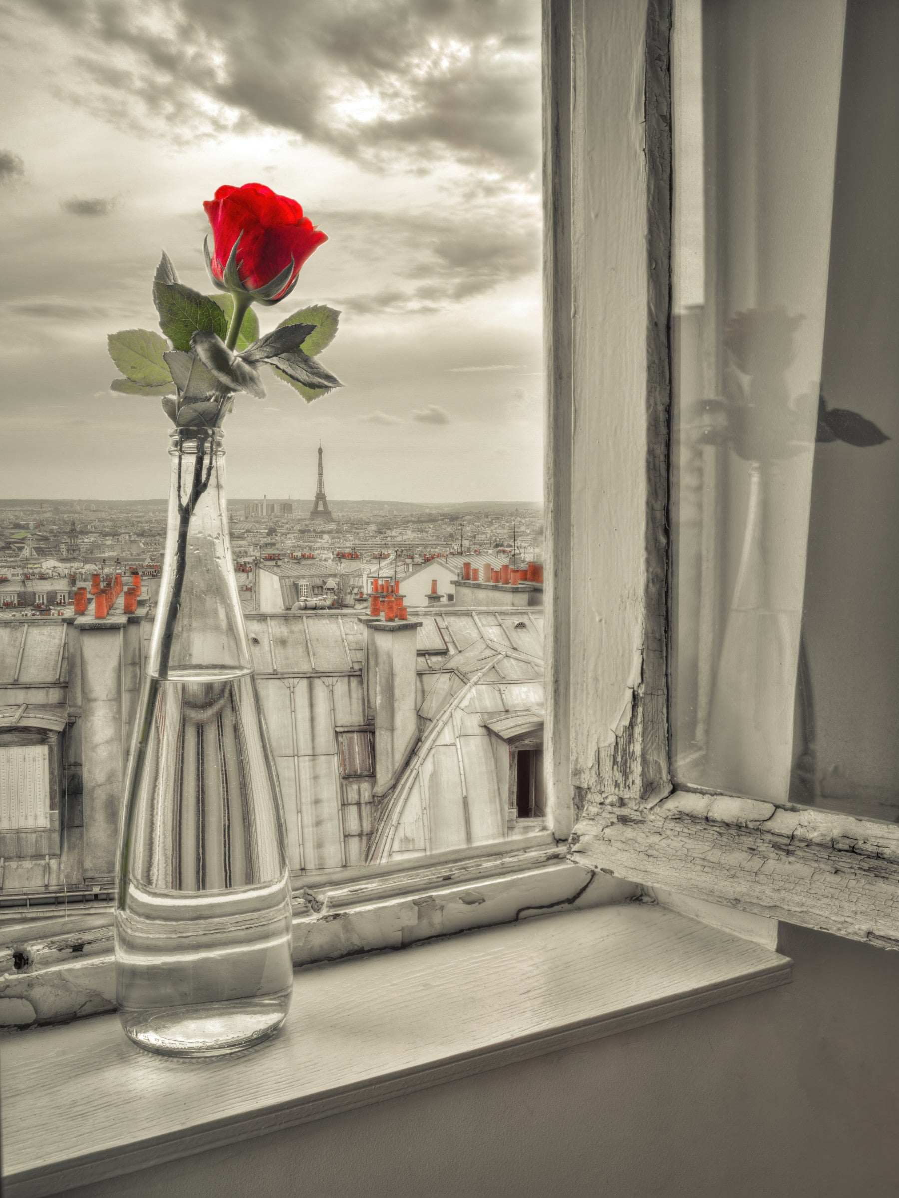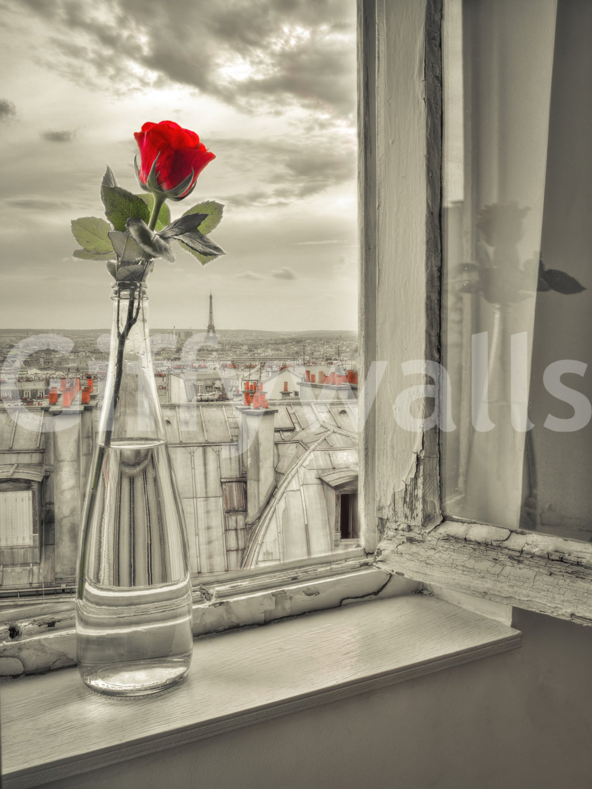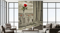 Tuo sisätiloihin ripaus pariisilaista viehätysvoimaa tällä ainutlaatuisella seinätapetilla. Elävänpunainen ruusu yksinkertaisessa lasipullossa seisoo kuluneella ikkunalaudalla, jota reunustaa Eiffel-tornin esittämä kaupunkikuva. Harmaasävyinen paletti korostaa ruusun väripilkkua ja luo katseenvangitsevan keskipisteen. Tämä tapetti tuo romanttisen, vintage-tunnelman olohuoneisiin, makuuhuoneisiin tai käytäviin. Kuvittele, kuinka hienostunutta tämä tapetti tuo viehättävään ruokailutilaan tai tyylikkääseen kotitoimistoon, yhdistäen vaivattomasti luonnon ja urbaanin eleganssin.