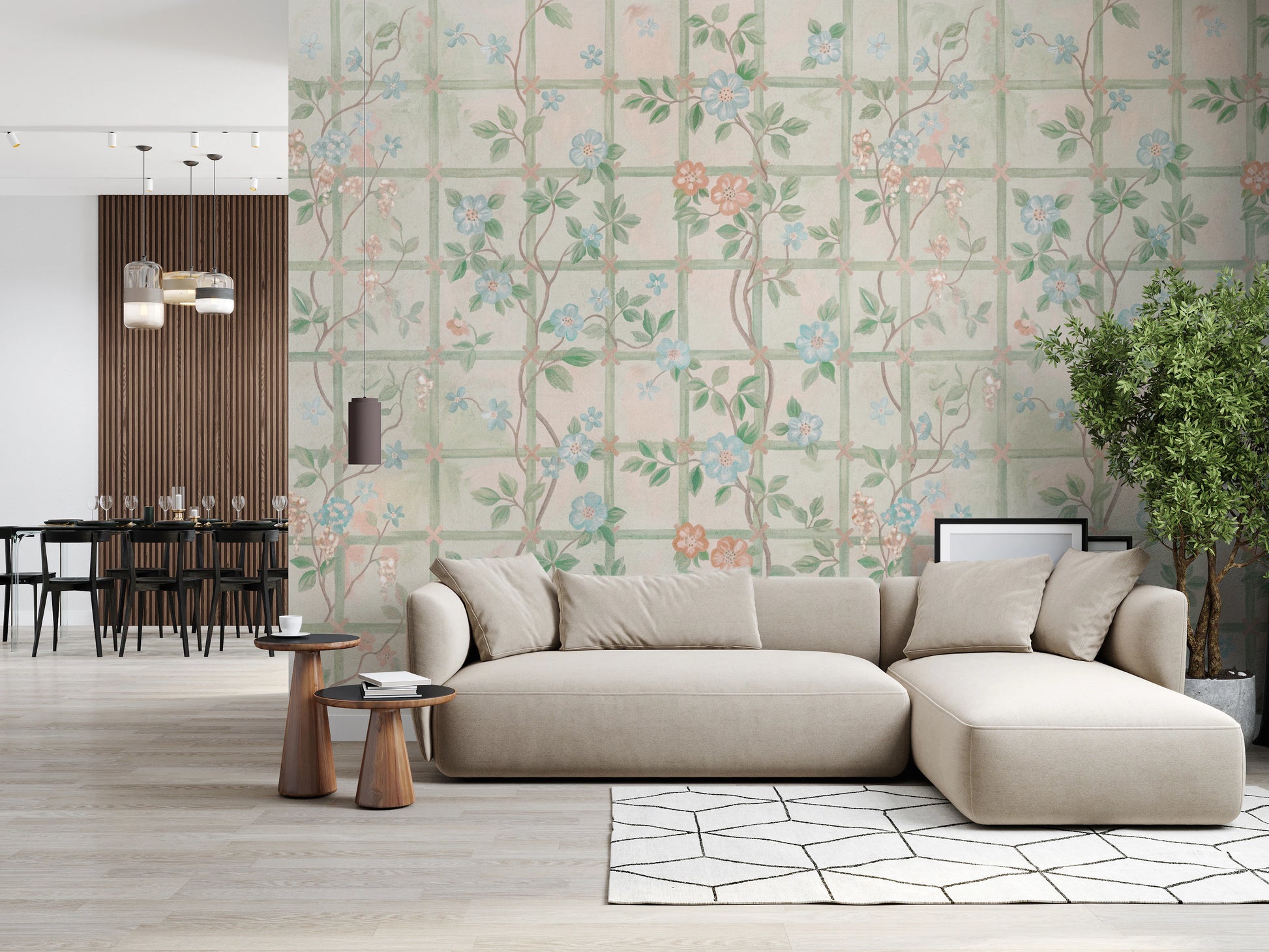 Muunna tilasi seesteiseksi englantilaiseksi puutarhaksi tällä upealla seinäkoristeella. 'Pastel Charm Garden English Roses' -kuosi koostuu herkästä, pehmeän vihreästä säleiköstä, joka on kietoutunut kiipeilyruusujen kanssa lempeän pastellisävyissä. Vaaleansiniset ja aprikoosin kukat luovat rauhoittavan ja hienostuneen tunnelman, joka tuo mieleen aurinkoisen aamun kukkivassa ruusutarhassa. Tämä hienovarainen mutta lumoava kuvio tuo ripauksen ajatonta eleganssia mihin tahansa huoneeseen. Täydellinen rauhoittavan ja kutsuvan tunnelman luomiseen, tämä kuosi lisää seinillesi ripauksen kukkaista armoa.