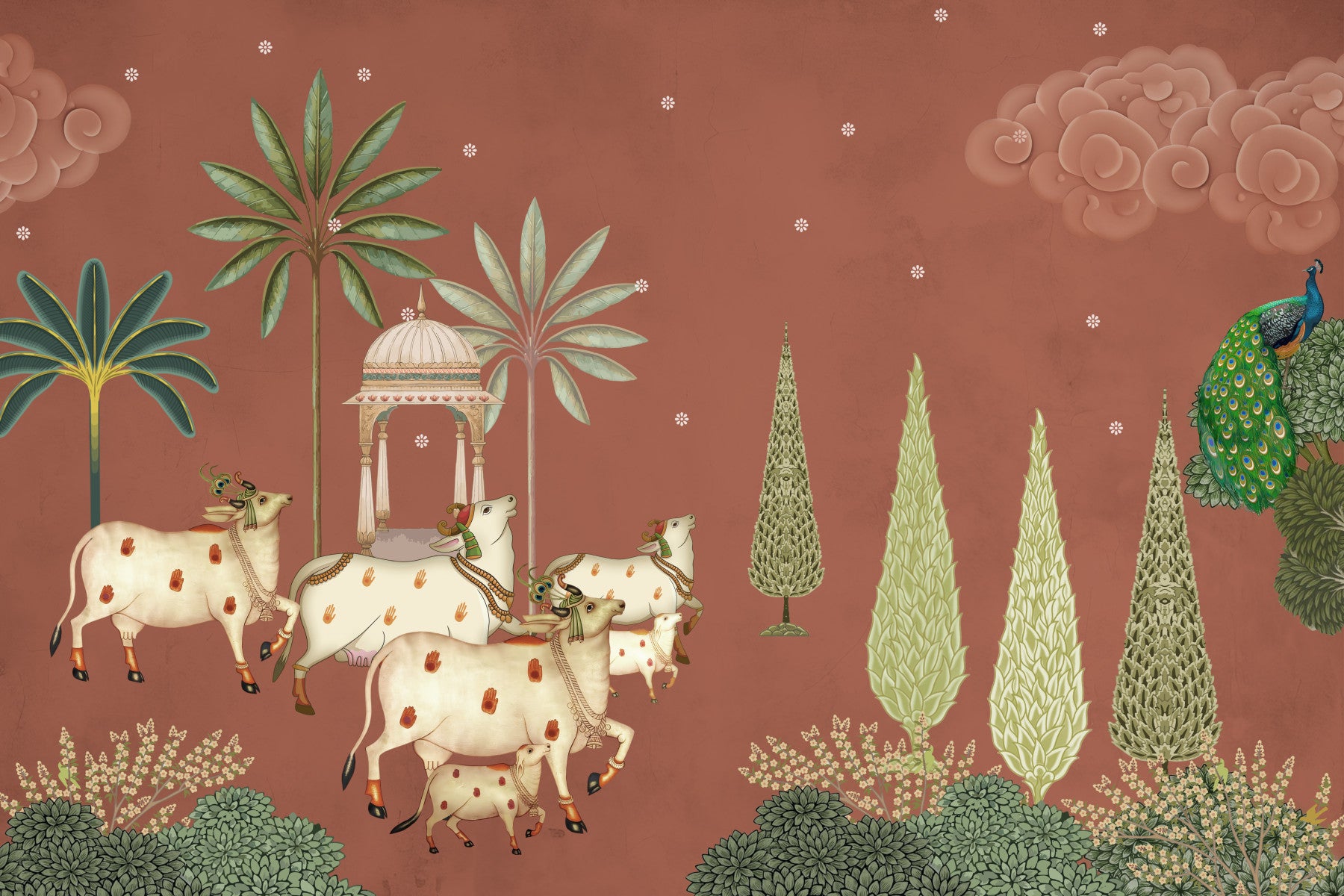 Step into the tranquil world of 'Pichwai Vanam,' a captivating wallpaper that brings the age-old art of Pichwai painting to your modern space. This design showcases a serene landscape rendered in warm, earthy tones, evoking a sense of peace and harmony. Graceful cows, adorned with traditional motifs, wander through a lush forest dotted with stylized trees and ornate structures, reminiscent of ancient Indian temples. A vibrant peacock perched amidst the verdant foliage adds a touch of regal beauty. The overall composition, complete with soft, swirling clouds, creates a dreamlike ambiance, transporting you to a realm of spiritual depth and artistic splendor. Transform your walls into a living canvas with 'Pichwai Vanam' and embrace the timeless elegance of Indian art.