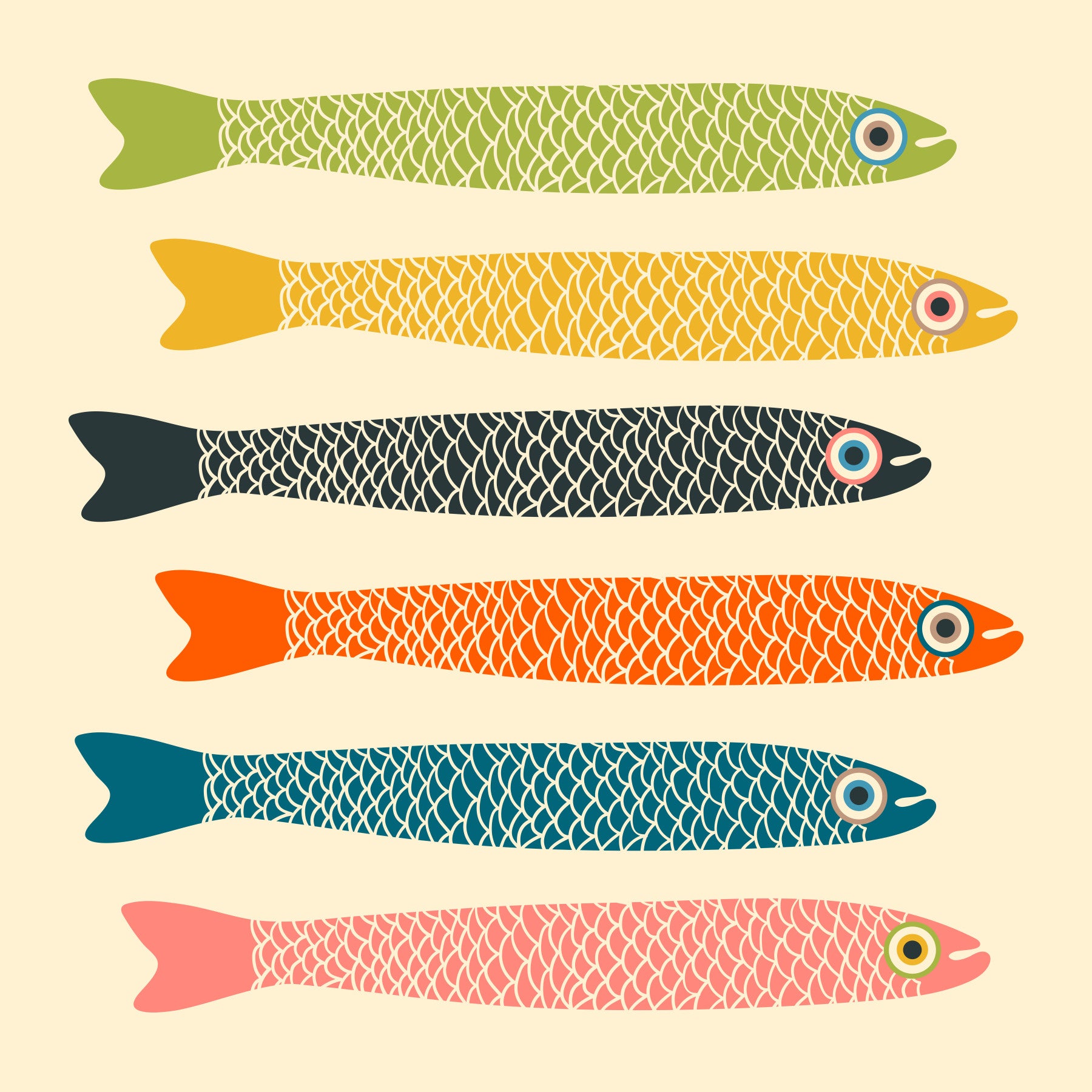 Anchovies Retro Vintage Multicolored Fish on Cream Wall Mural.