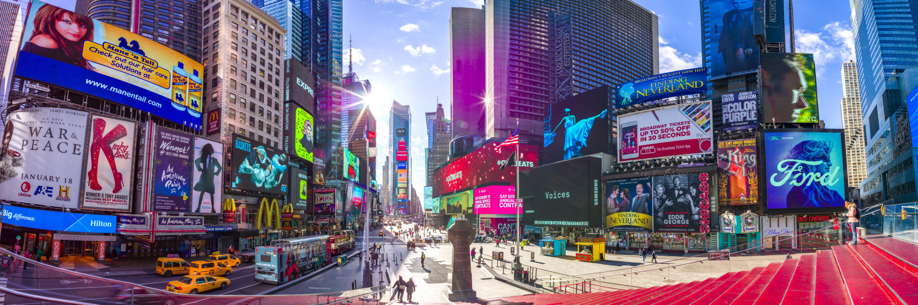 Times Square, New York City. Experience the energy of Times Square with this lively wallpaper for walls. Buildings adorned with vivid billboards reach for a bright sky. Red steps in the foreground pull you into the scene. This design injects urban energy into spaces like living rooms, offices, or teen bedrooms. The wallpaper complements interiors by acting as a statement piece, infusing excitement and modern flair. The bold colors bring the spirit of New York City to any room.