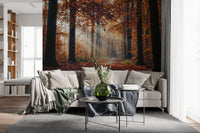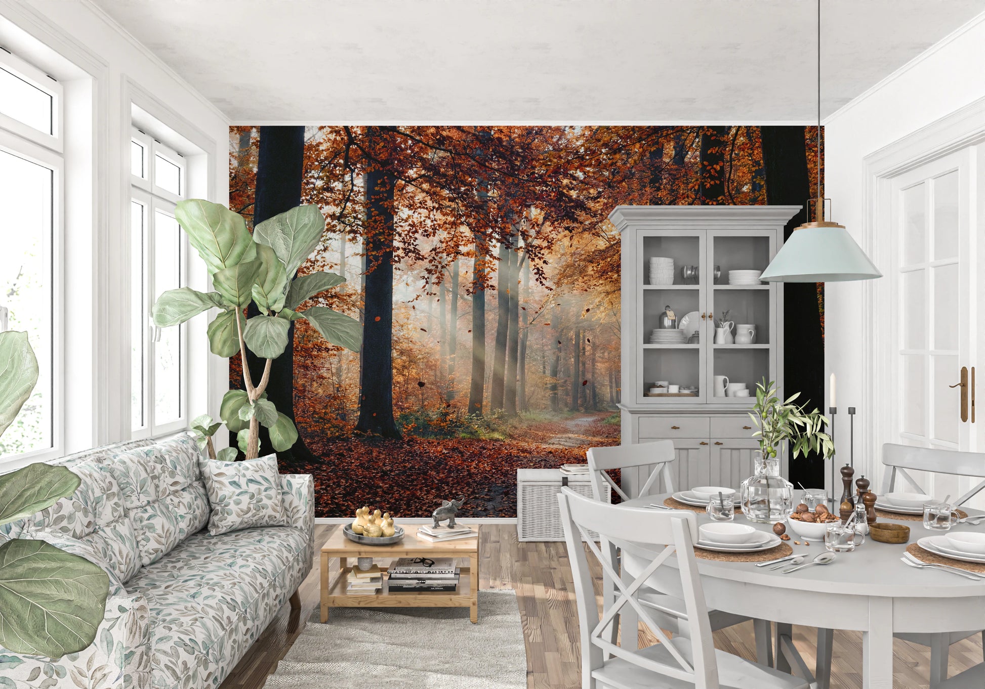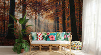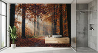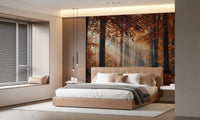 Transformez n'importe quelle pièce avec ce magnifique papier peint à motif forêt. Il met en scène une forêt automnale baignée de soleil, aux riches nuances d'orange, de brun et de beige. La lumière du soleil filtre à travers les arbres denses, créant une scène accueillante et paisible. Ce motif sublime la lumière naturelle et apporte une touche chaleureuse à n'importe quelle pièce. Ce papier peint est idéal pour les salons, les chambres ou les couloirs. Il crée une atmosphère cosy et rend les espaces plus accueillants. Il s'harmonise avec les intérieurs rustiques, traditionnels et modernes. La finesse des détails crée un effet apaisant, propice à la détente et à la contemplation. Son esthétique naturelle évoque la nature et favorise une ambiance sereine. Il fait entrer la beauté de l'automne chez vous.