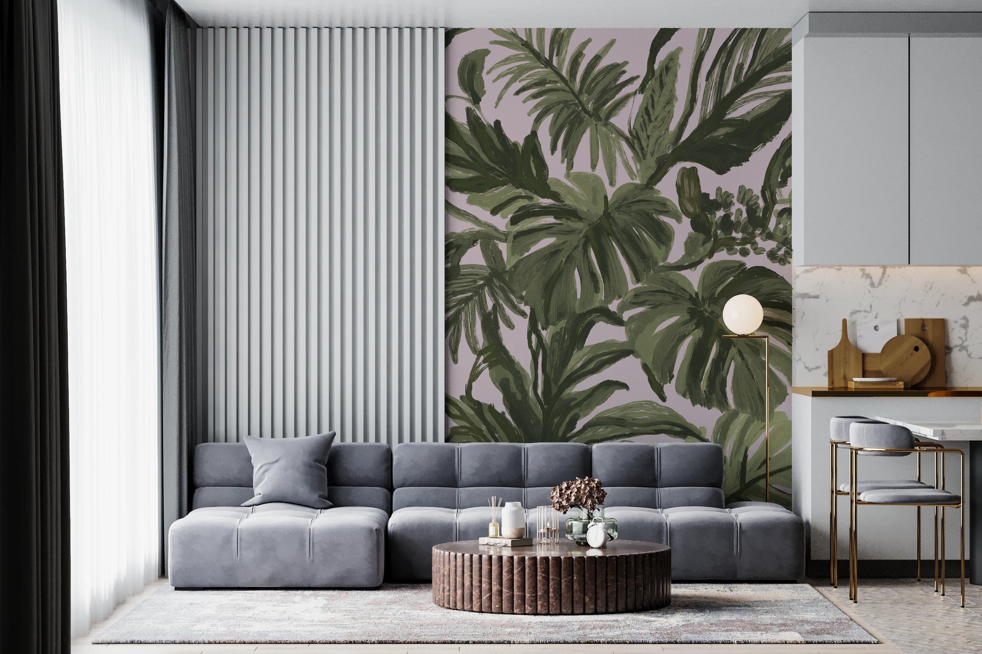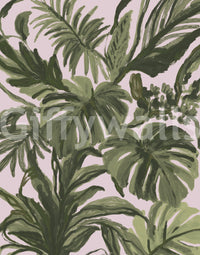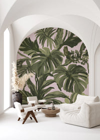 Fresque murale de palmiers aux teintes rosées et au feuillage tropical, aux allures de tableau