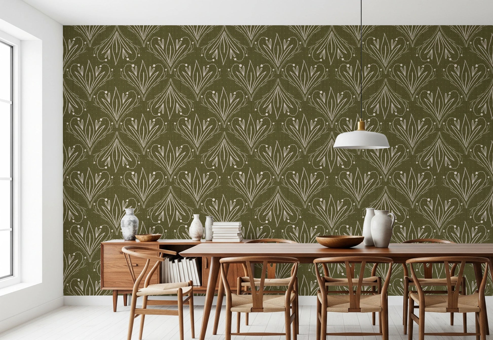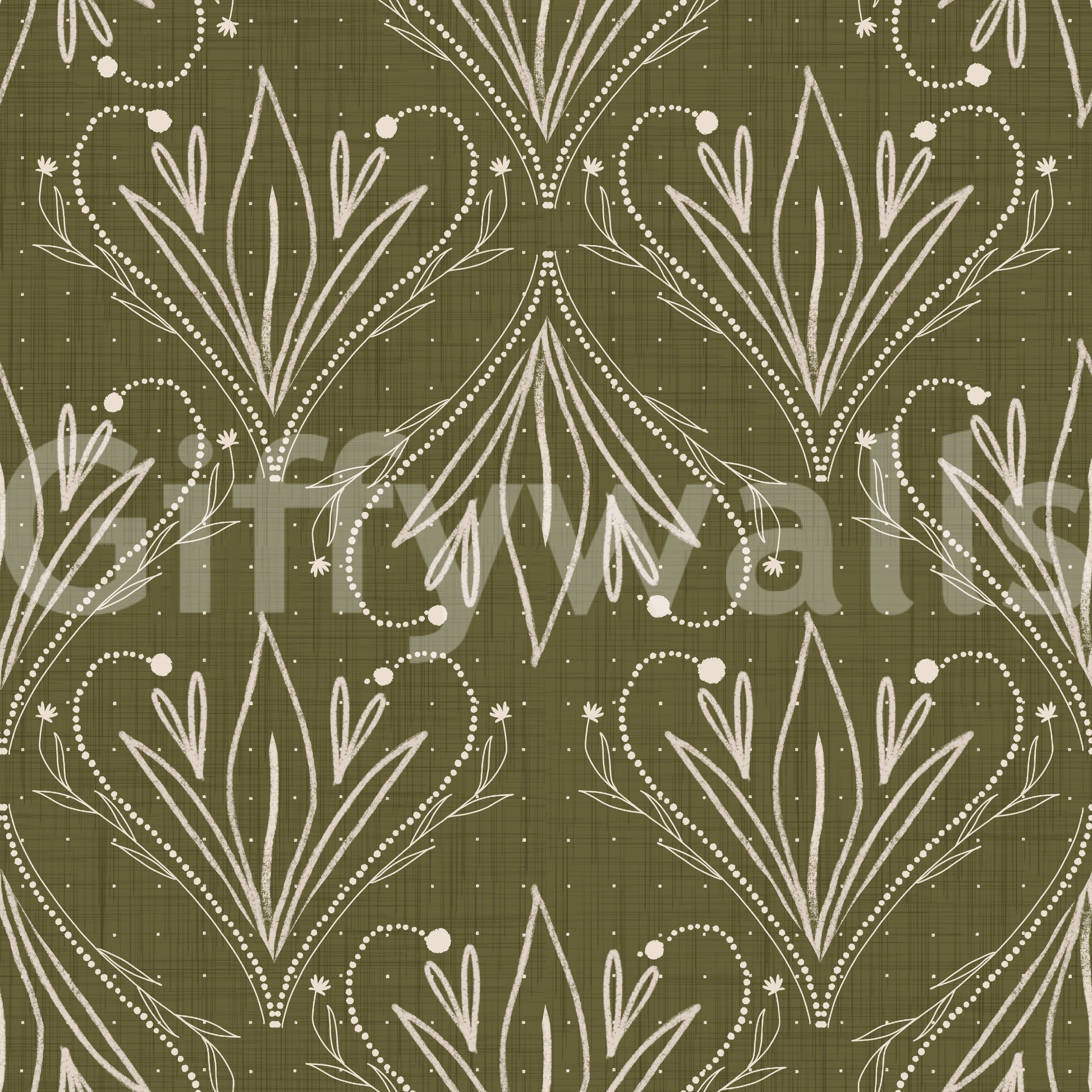 Papier peint bohème Art Nouveau Folk Floral Vert Olive – Papier peint dessiné à la main