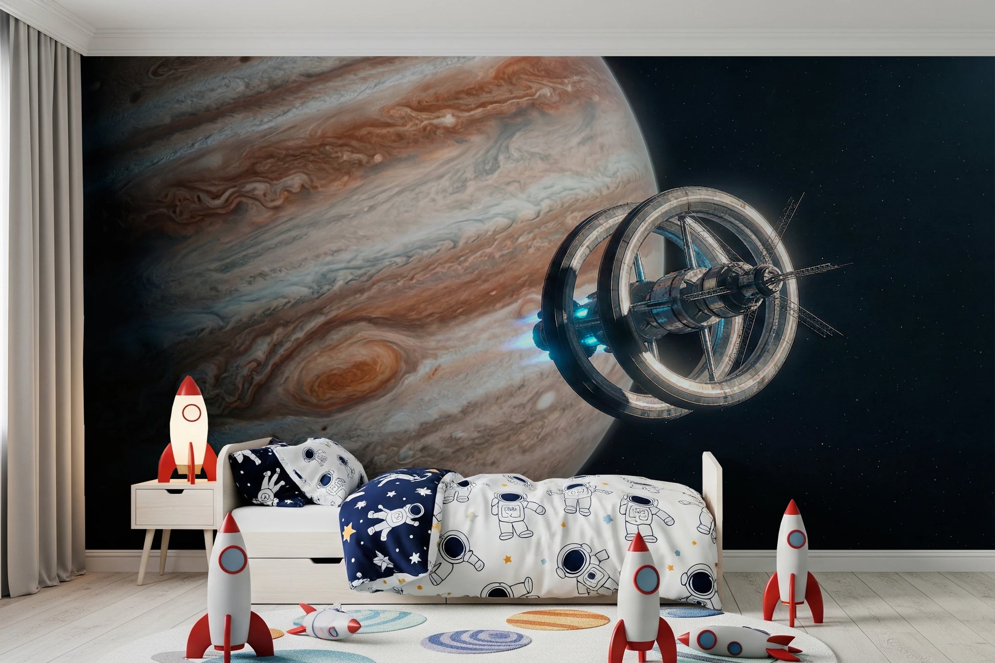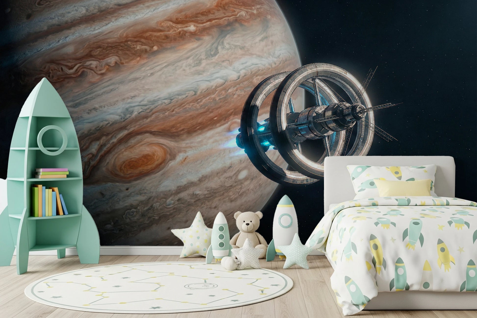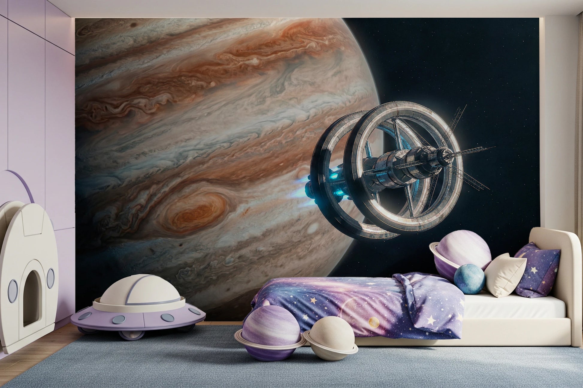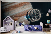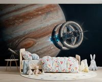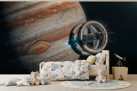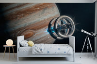 Transportez votre intérieur au-delà des frontières terrestres avec ce motif spectaculaire représentant une station spatiale et la majestueuse planète Jupiter. Les textures riches et tourbillonnantes de la planète contrastent avec les tons métalliques et froids de la structure en orbite. Ce papier peint apportera une touche d'audace à n'importe quelle pièce, notamment celles à l'esthétique moderne ou minimaliste. Idéal pour une chambre d'adolescent, un bureau ou même un salon contemporain, ce motif ajoute de la profondeur et du relief, créant un point focal captivant. Il est parfait pour insuffler un esprit d'aventure et d'imagination à votre espace de vie.