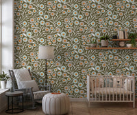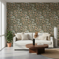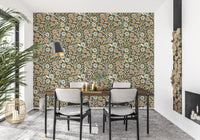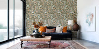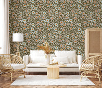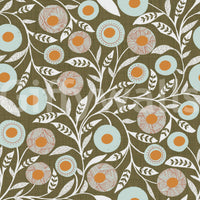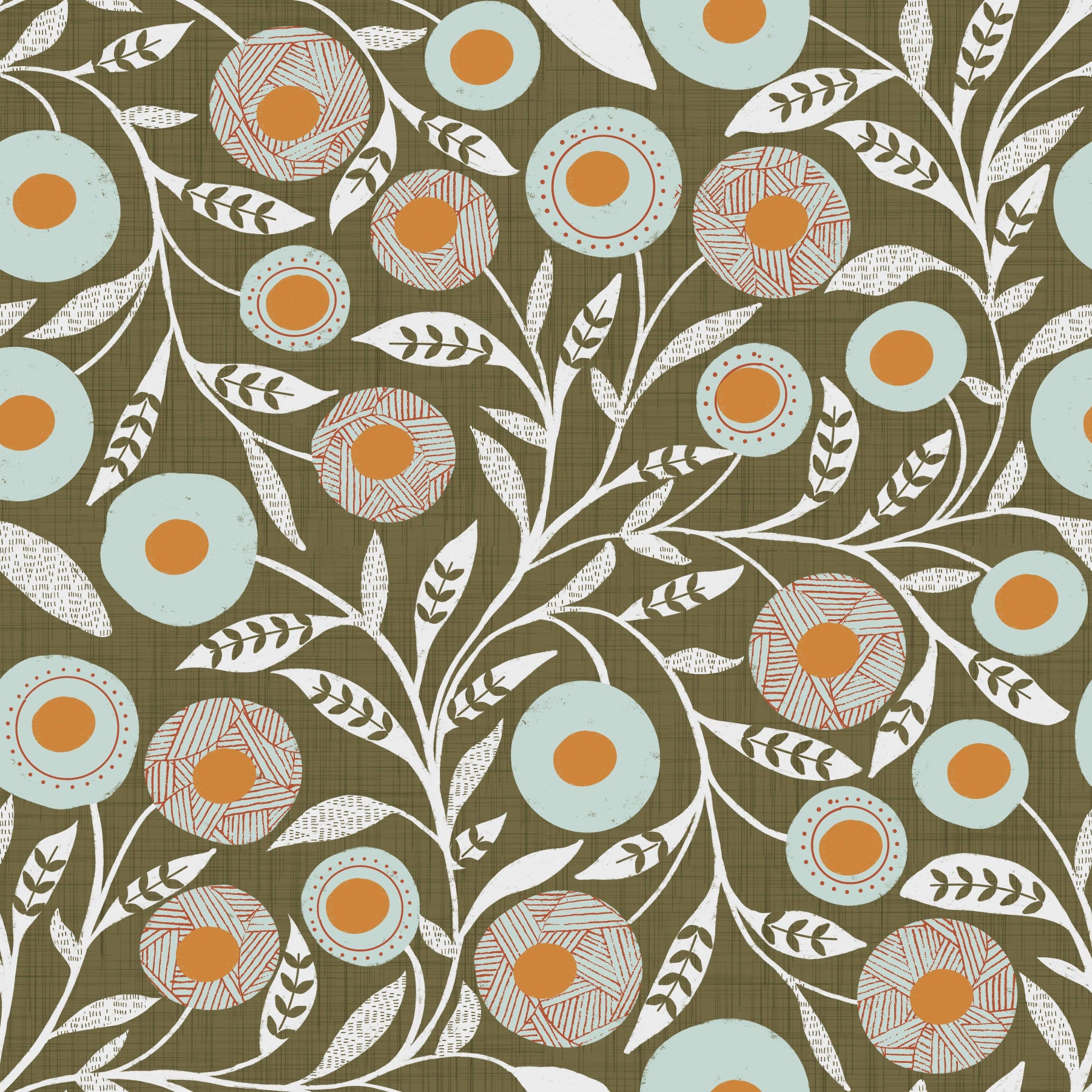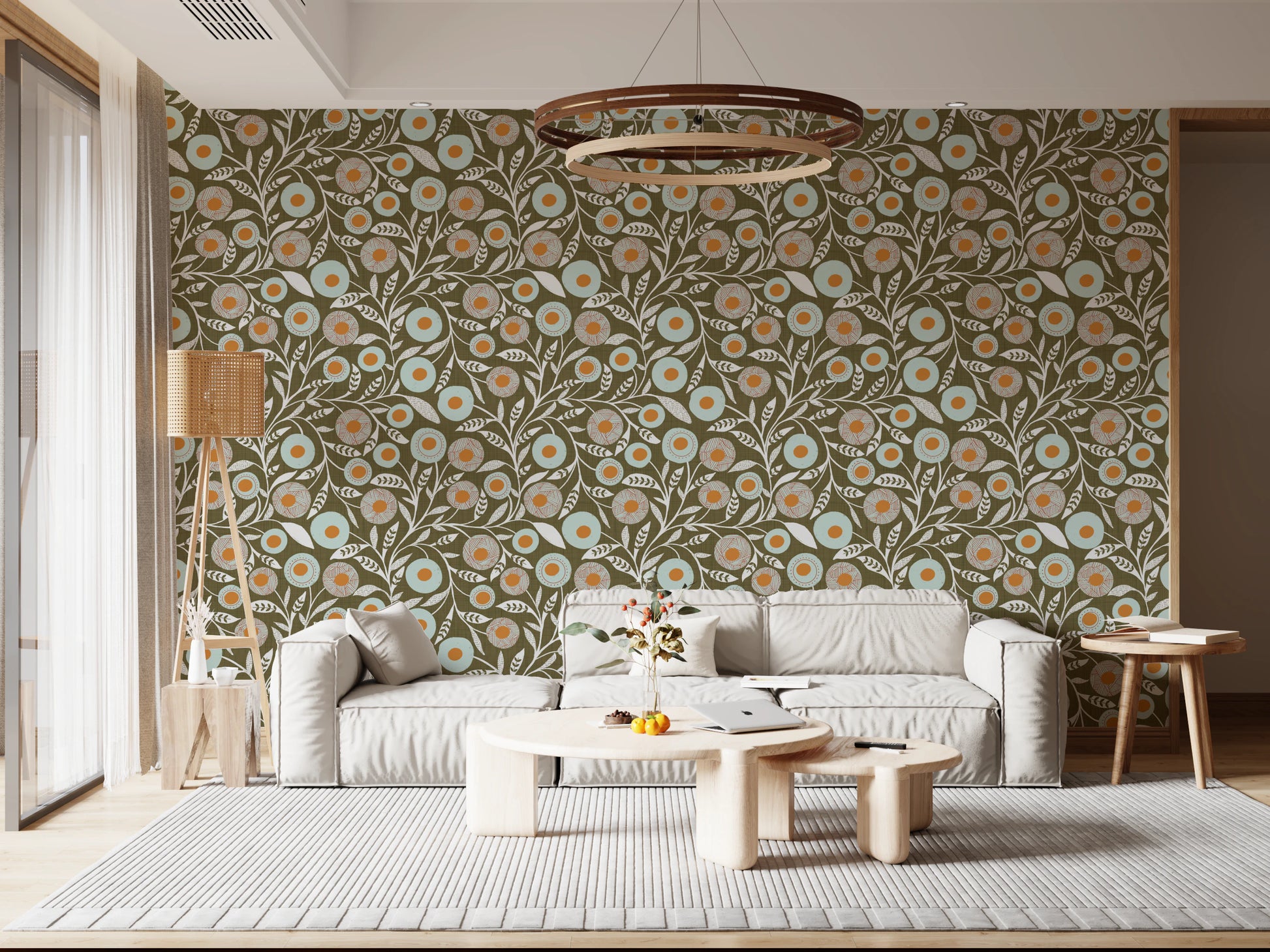 Papier peint artisanal botanique à motifs floraux folk scandinaves et tons olive.