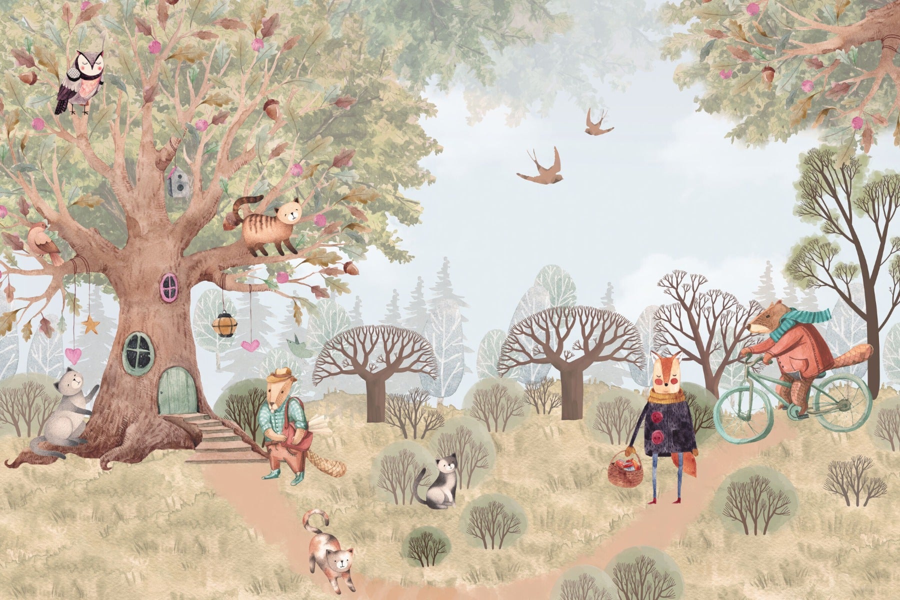 Embarquez pour un voyage enchanteur à travers cette fresque murale féerique représentant des créatures de la campagne, où la fantaisie rencontre le charme sur vos murs. Cette œuvre enchanteresse papier peint de chambre d'enfant est une fresque d'aventures, mettant en scène des animaux folâtres et des paysages luxuriants dignes d'un conte de fées, qui invitent les jeunes à vagabonder. Chaque coup de pinceau raconte une histoire de joie sous-marine, où les renards pédalent à vélo et les hiboux sages trônent dans de majestueuses cabanes dans les arbres. Idéale pour une chambre d'enfant ou une aire de jeux, cette fresque crée un décor captivant pour d'innombrables histoires de courage et d'amitié. Réalisée avec soin, elle ouvre les portes d'un monde de beauté pastorale et de compagnons espiègles qui susciteront joie et créativité dans le sanctuaire de tout jeune rêveur.