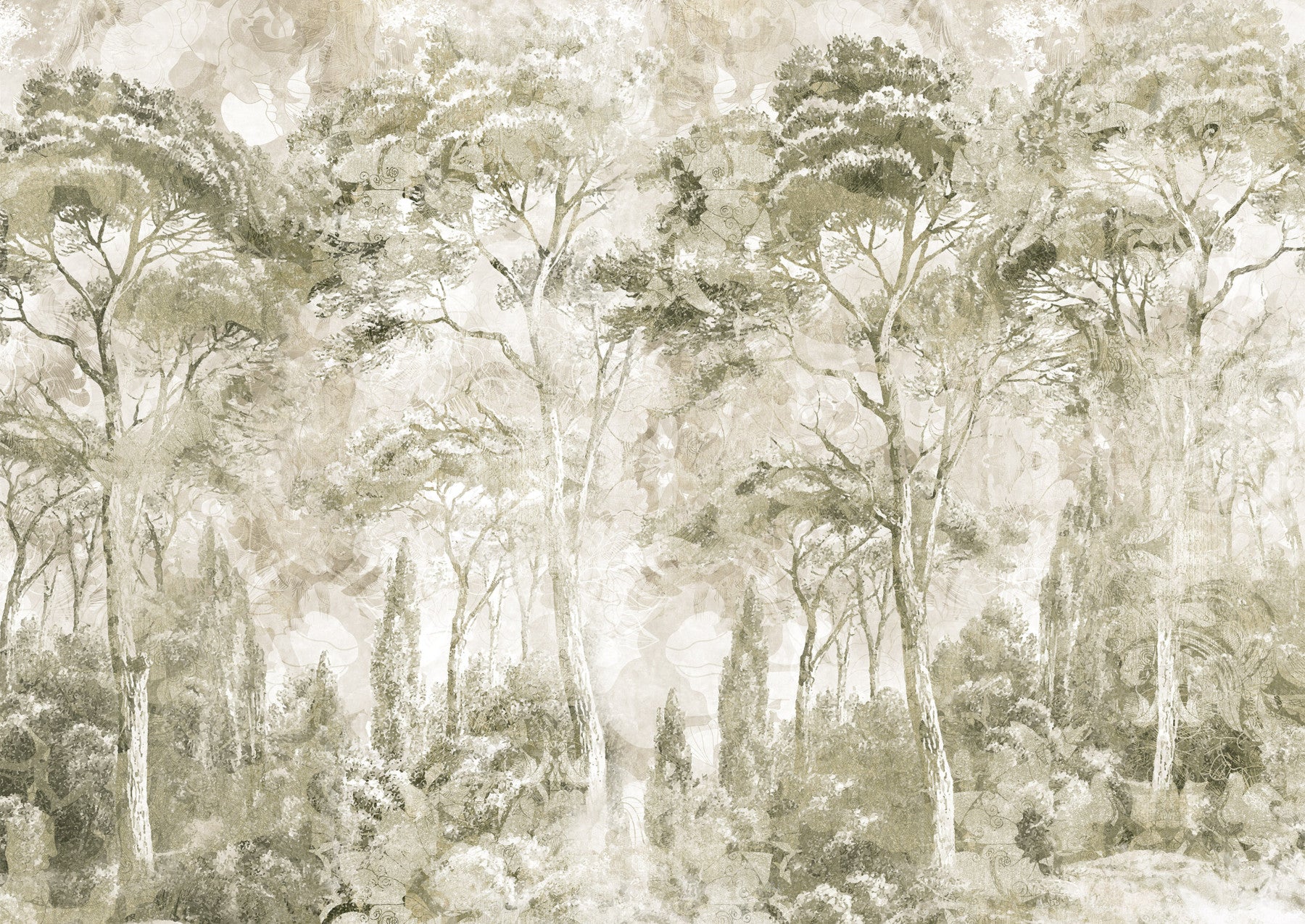 Sepia Pine Forest Landscape wall mural with muted beige and olive hues