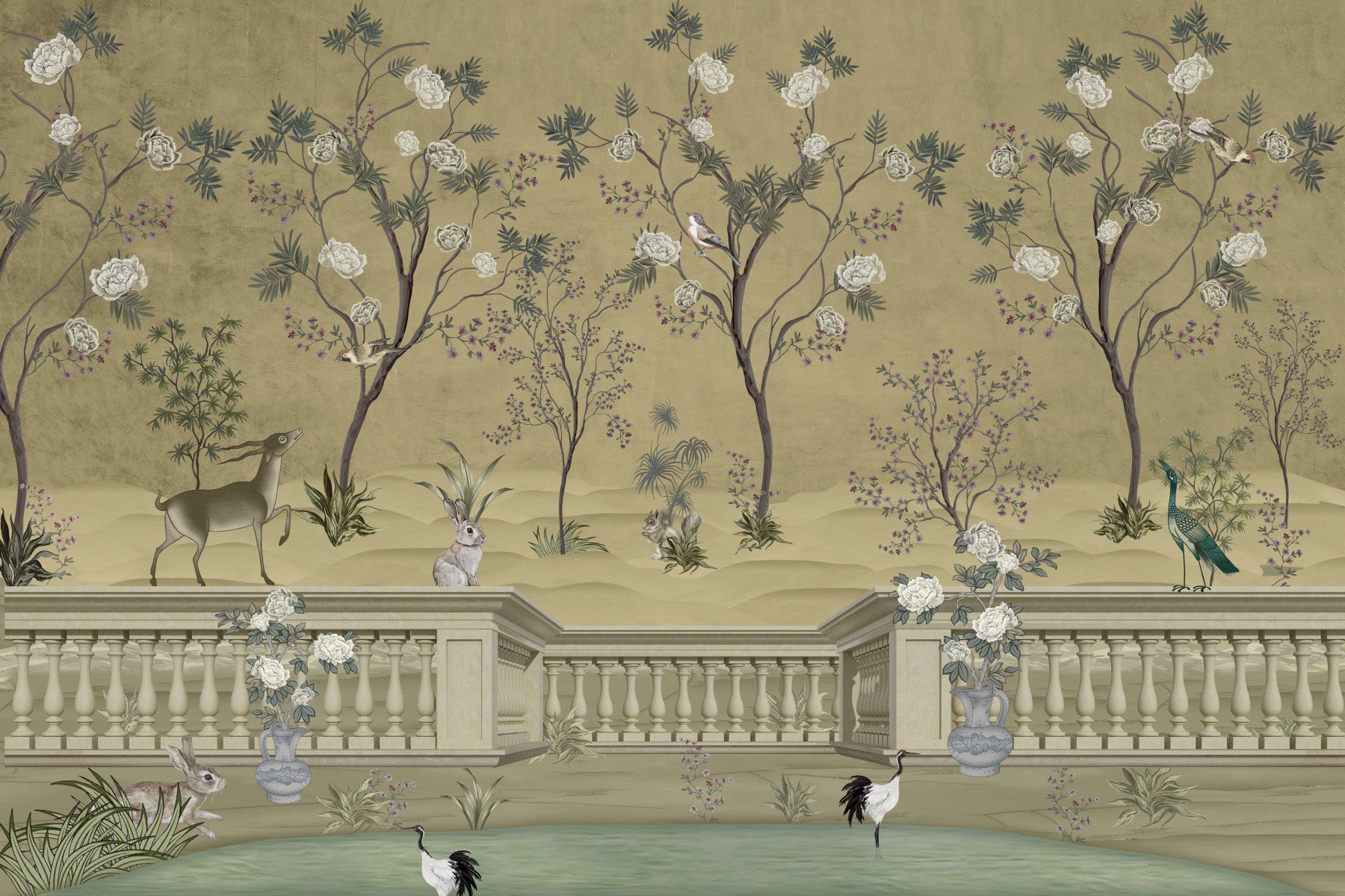 Apportez une touche d'élégance à votre maison avec ce magnifique papier peint de style chinoiserie pour murs. Des tons doux et atténués de vert olive et de beige créent un arrière-plan paisible. De délicates fleurs blanches et des oiseaux gracieux renforcent l'atmosphère calme. Des animaux décorent subtilement ce motif qui est un régal visuel. Idéal pour une chambre, un salon ou une salle à manger, ce papier peint ajoute une touche sophistiquée et artistique qui complète les intérieurs classiques et modernes.