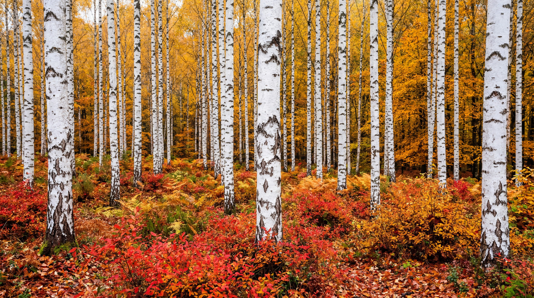 Hallway wall mural with vibrant birch forest and layered fall undergrowth detail
