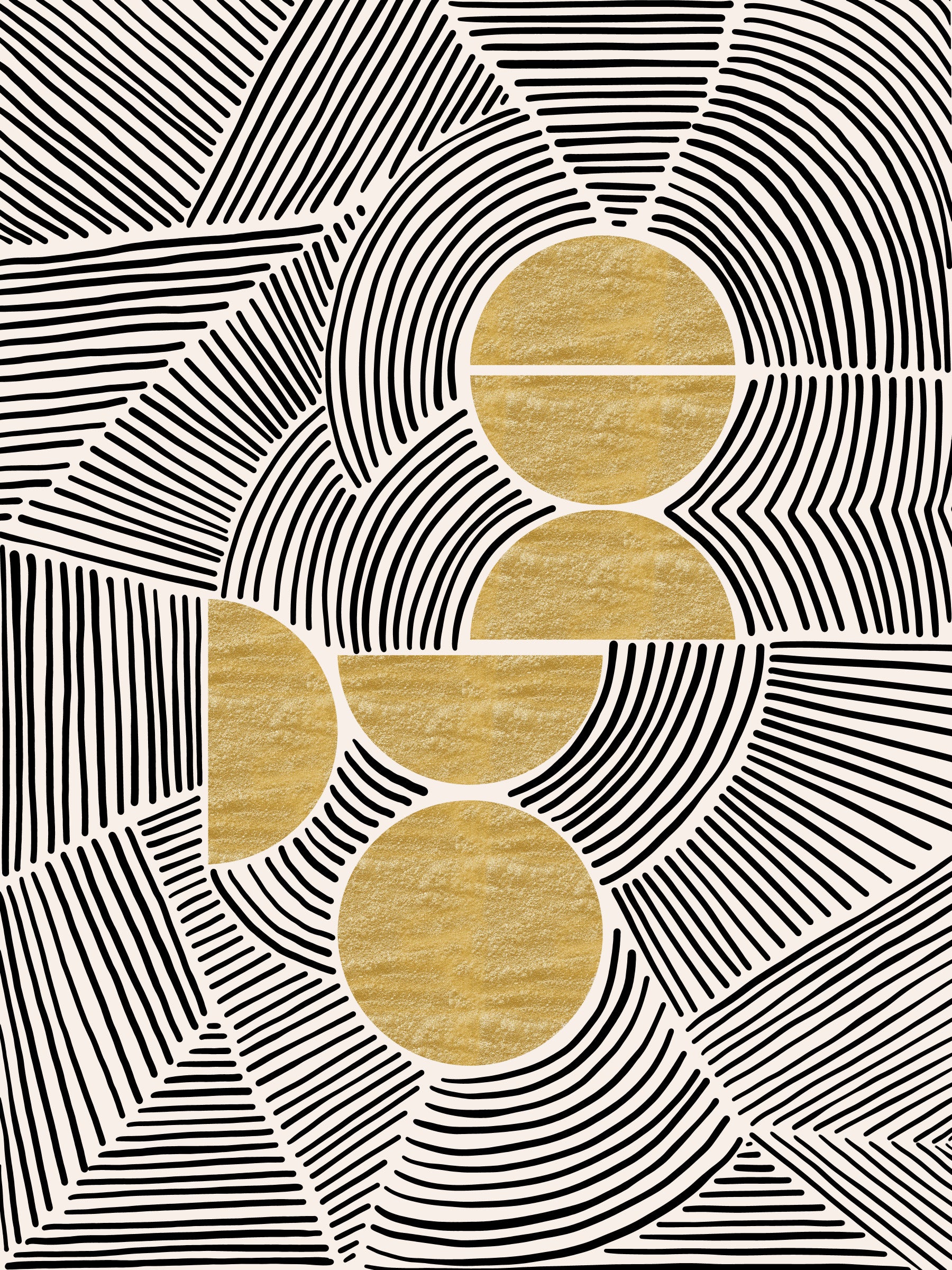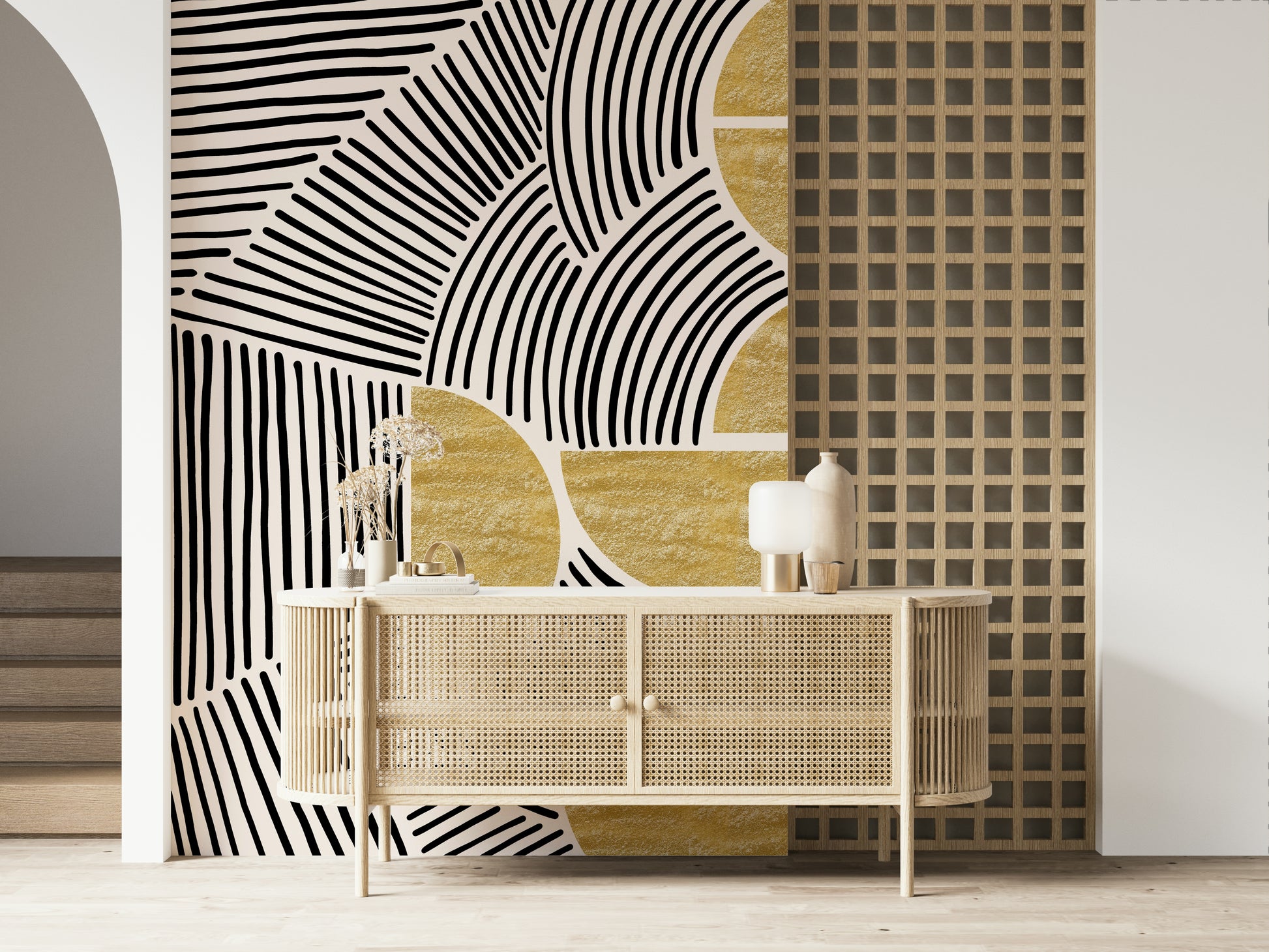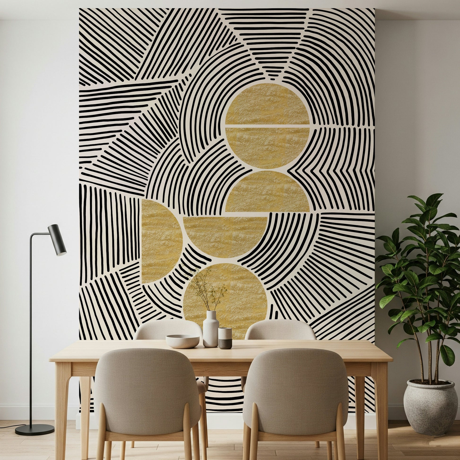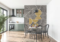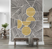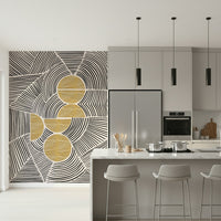 Imprégnez votre intérieur de l'harmonie saisissante de la collection « Bauhaus - Tribal ». Cette décoration murale expressive fusionne la précision géométrique du mouvement Bauhaus avec l'énergie brute et spontanée de l'art tribal. Des lignes noires audacieuses dansent sur un fond neutre, formant des motifs captivants qui évoquent un sentiment de rythme et de connexion ancestrale. L'entrecroisement des formes crée une complexité visuelle, guidant le regard à travers un paysage stimulant de formes et de textures. Des accents d'or texturé ajoutent une touche de chaleur luxueuse et d'élégance primitive, ancrant le design dans une esthétique à la fois sophistiquée et authentique. Transformez votre mur en un point focal qui célèbre à la fois la modernité et le charme intemporel de l'artisanat indigène. Laissez cette création audacieuse insuffler un sentiment d'exploration artistique dynamique.