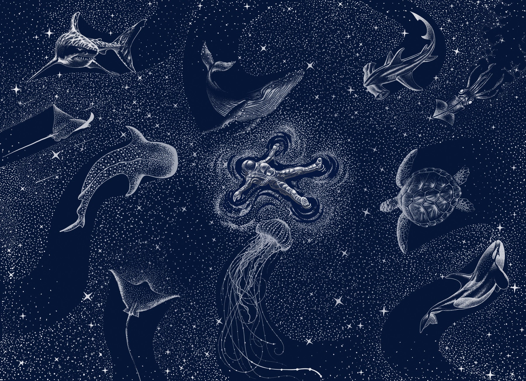 Explorez les mers célestes avec ce papier peint captivant pour murs. Il montre des créatures marines et un astronaute flottant parmi les étoiles sur un fond bleu foncé. Les illustrations détaillées apportent une touche unique à toute pièce. Ce design fonctionne bien dans une chambre, un salon ou un bureau. Installez ce papier peint pour créer un intérieur paisible et enchanteur. Laissez vos murs raconter une histoire d'aventures cosmiques.