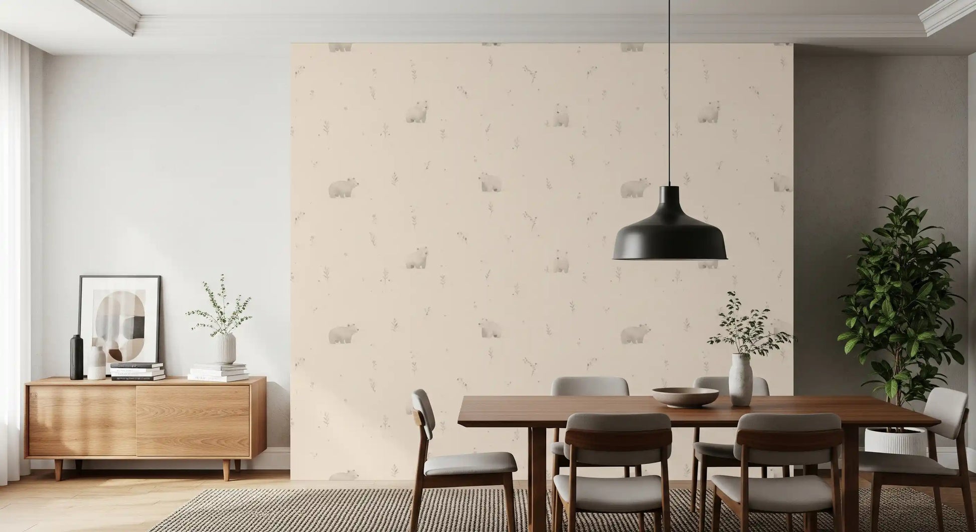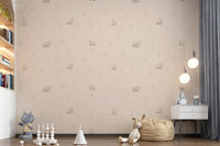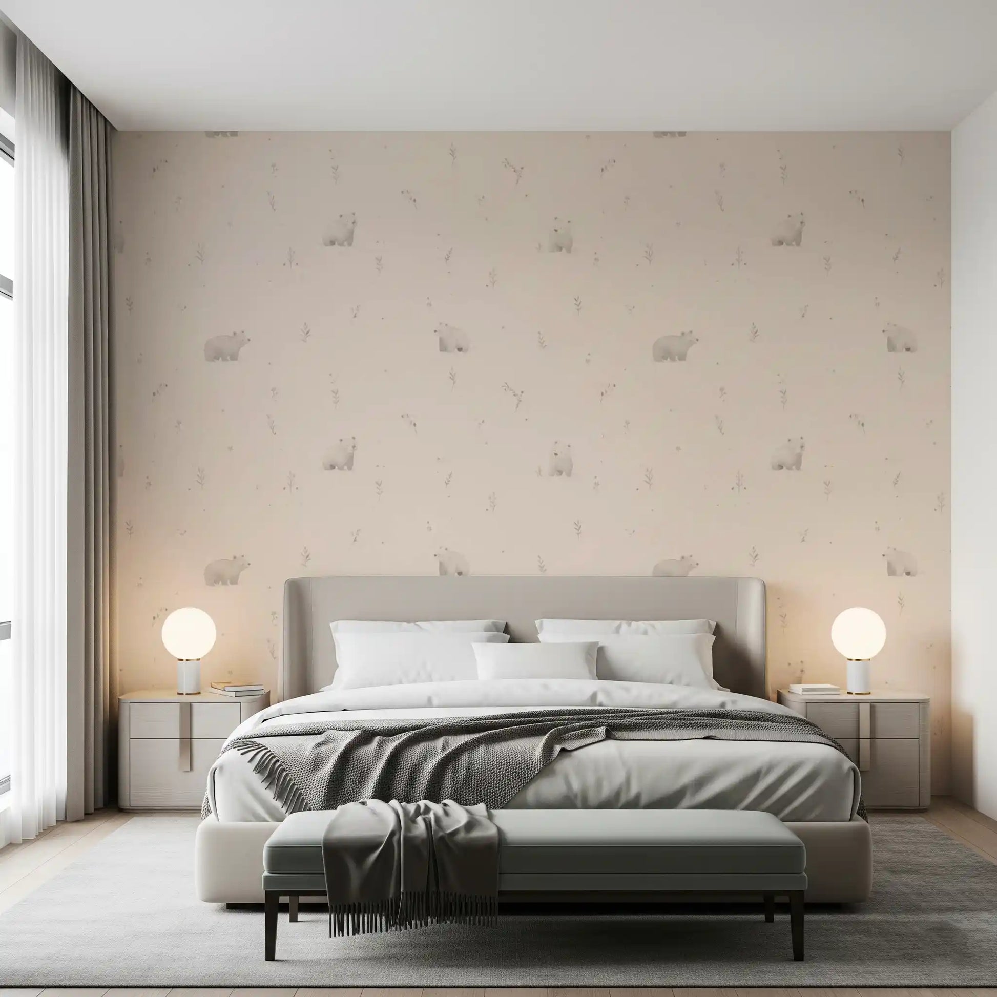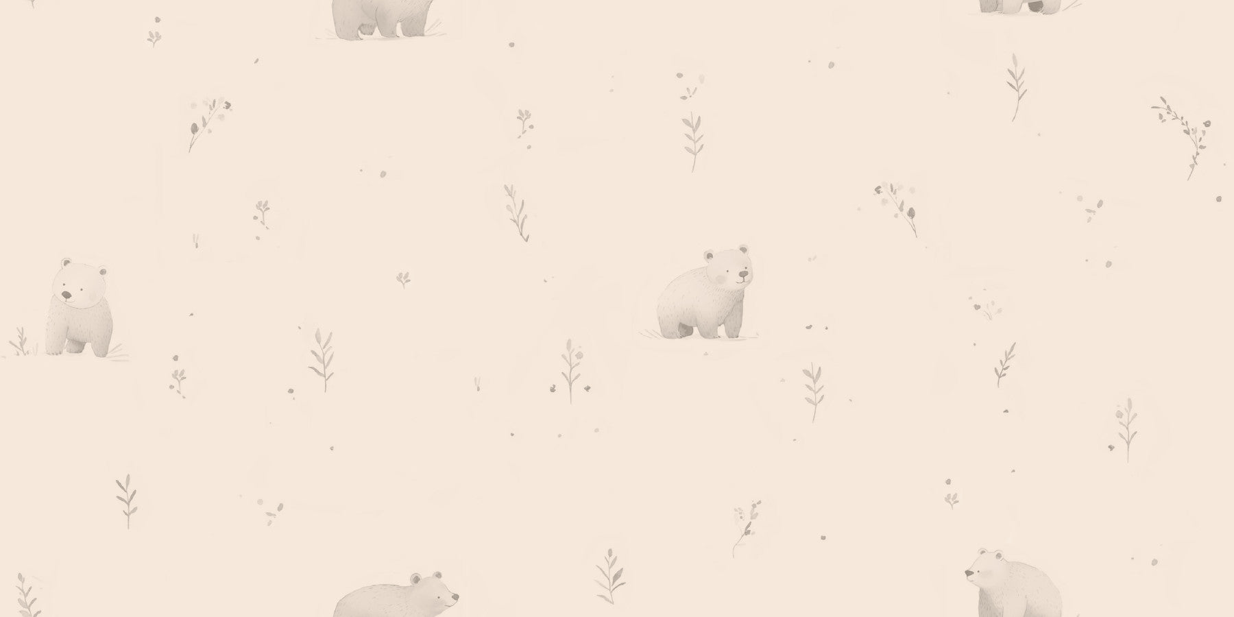 This delightful wallpaper for walls brings a serene, whimsical charm to any room. It features an endearing pattern of hand-drawn bears gently exploring a sparse meadow, accented with delicate botanical sprigs. The design’s minimalist style and soft illustrations create a peaceful ambiance, perfect for fostering imagination and tranquility. A soothing beige background anchors the muted grey and taupe details, offering a wonderfully neutral and calming color palette. This elegant pattern enhances nurseries, children’s bedrooms, and playrooms, transforming spaces into quiet havens. It also beautifully complements living areas or studies seeking a touch of understated warmth and gentle character, inviting a soft, natural aesthetic indoors.