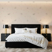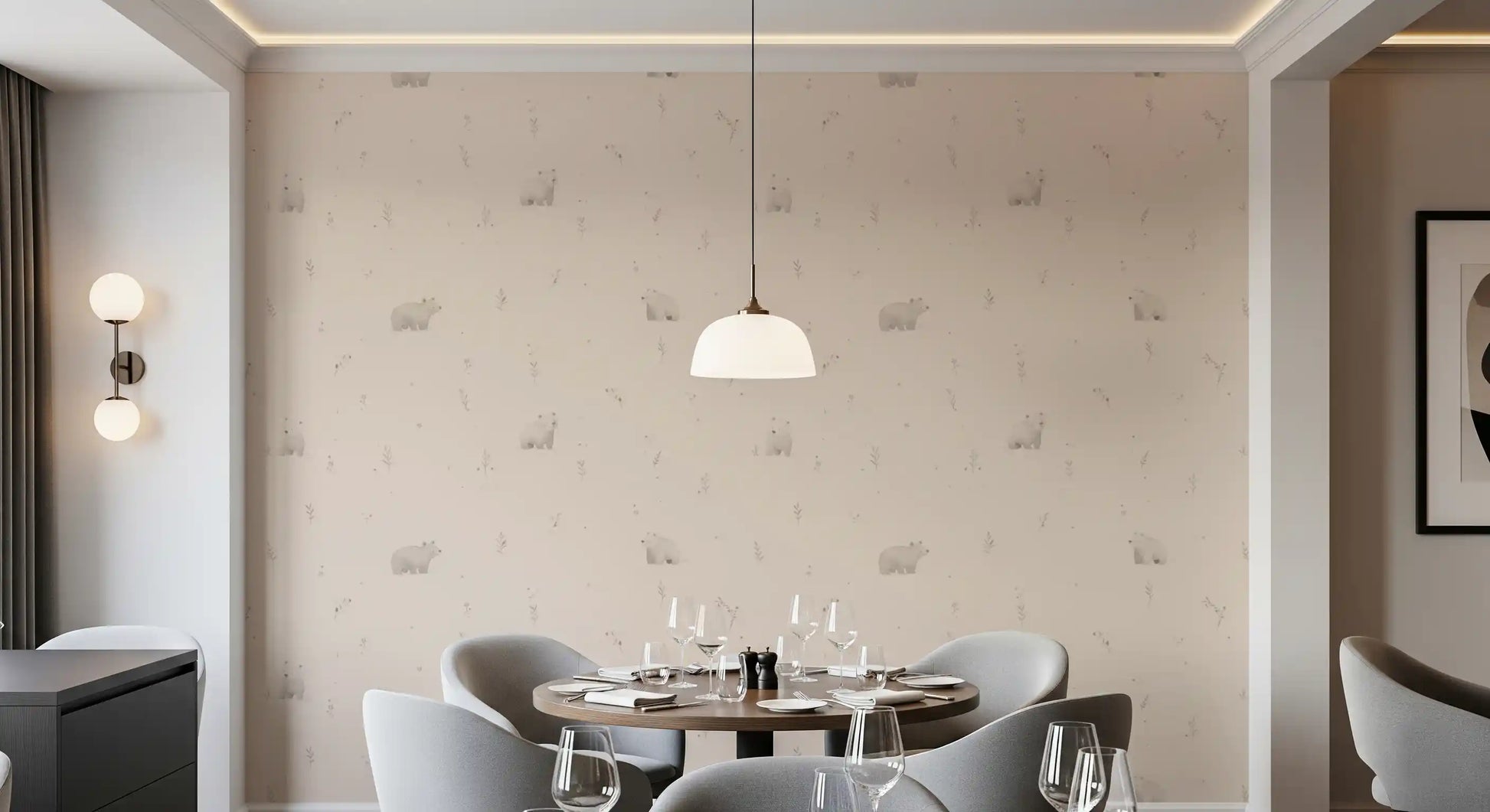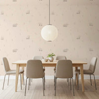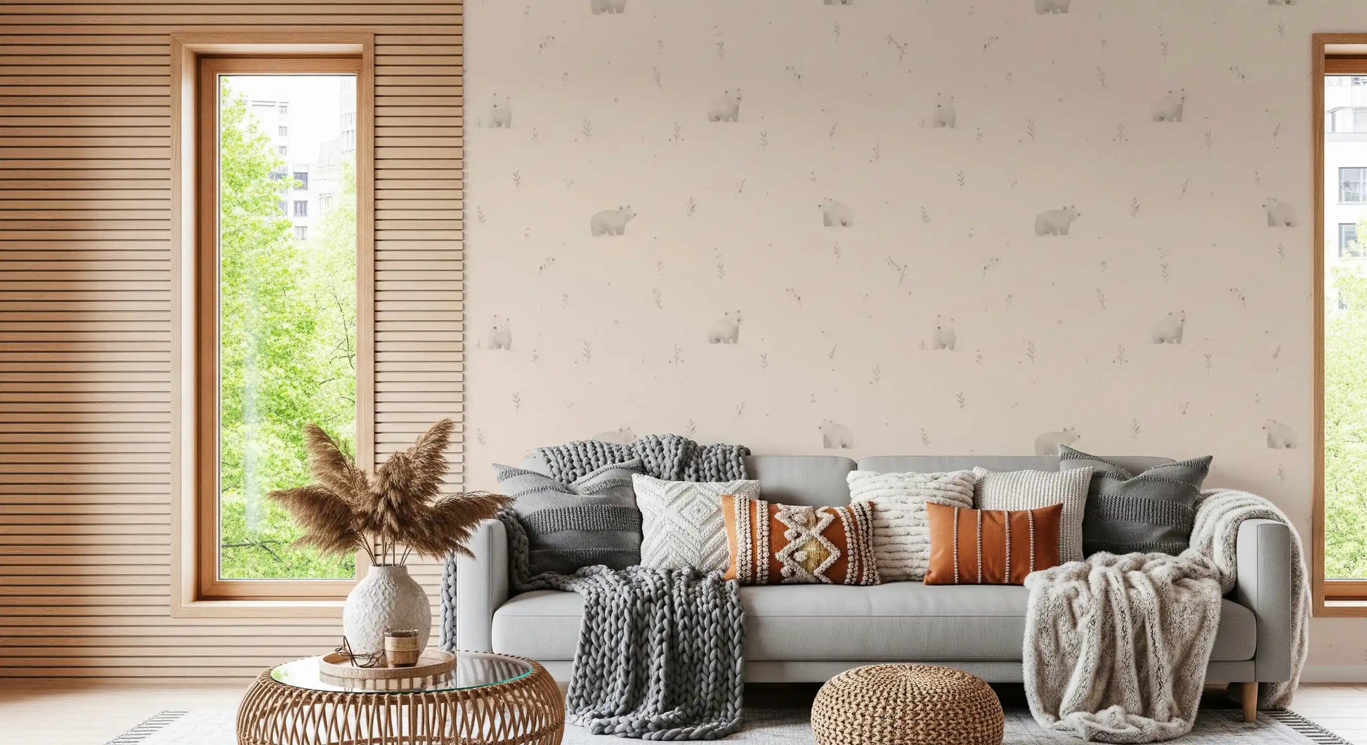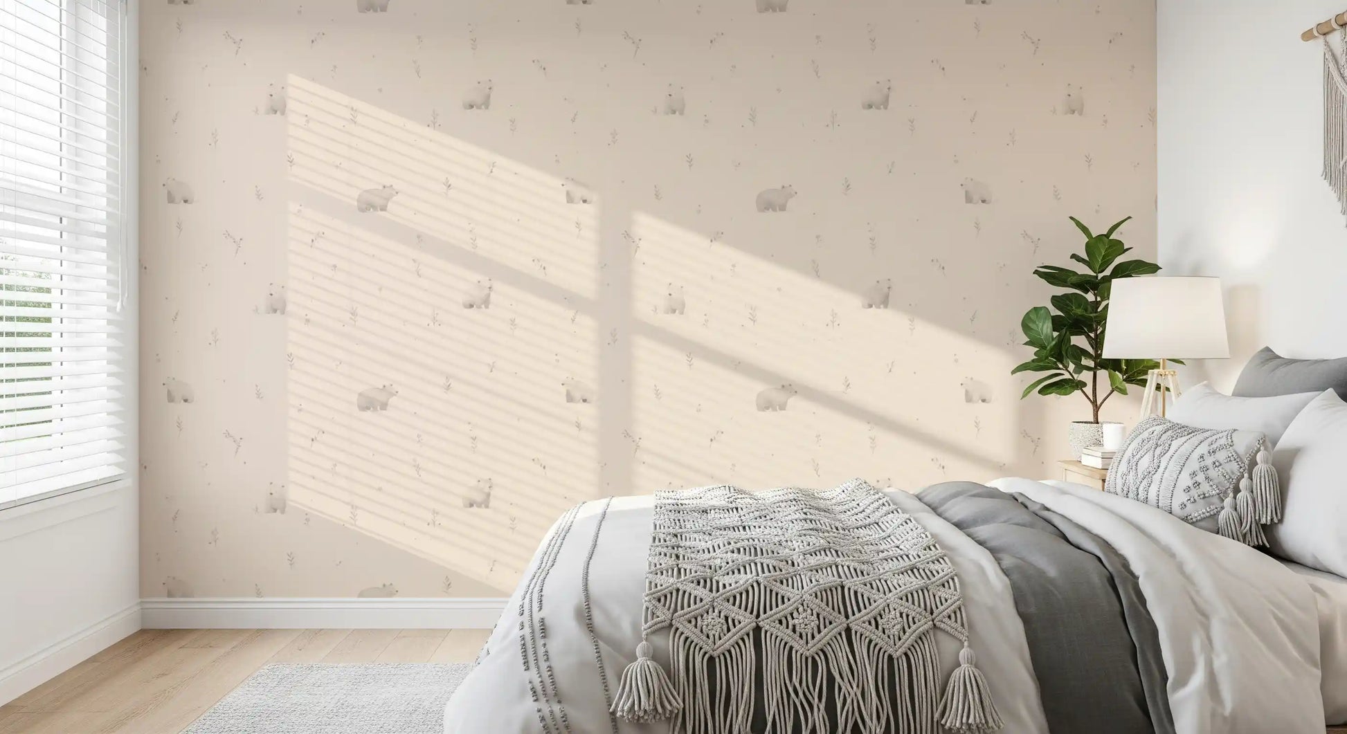 This delightful wallpaper for walls brings a serene, whimsical charm to any room. It features an endearing pattern of hand-drawn bears gently exploring a sparse meadow, accented with delicate botanical sprigs. The design’s minimalist style and soft illustrations create a peaceful ambiance, perfect for fostering imagination and tranquility. A soothing beige background anchors the muted grey and taupe details, offering a wonderfully neutral and calming color palette. This elegant pattern enhances nurseries, children’s bedrooms, and playrooms, transforming spaces into quiet havens. It also beautifully complements living areas or studies seeking a touch of understated warmth and gentle character, inviting a soft, natural aesthetic indoors.