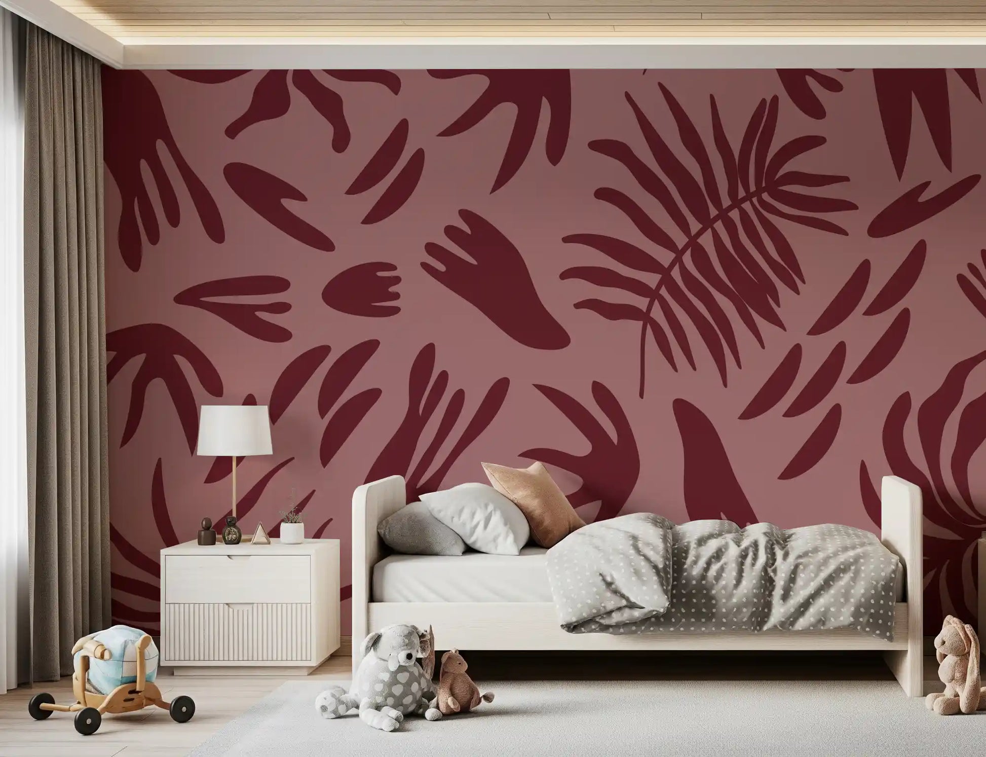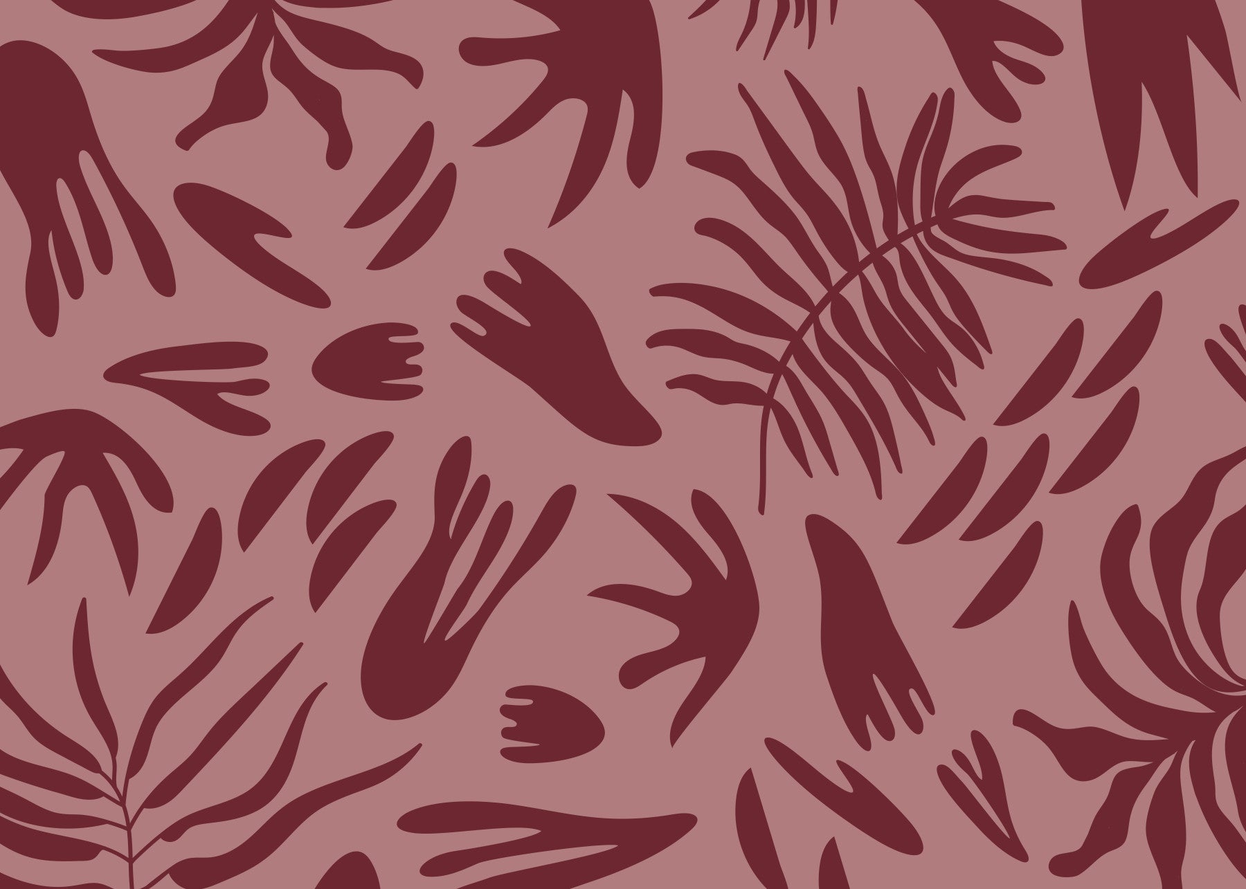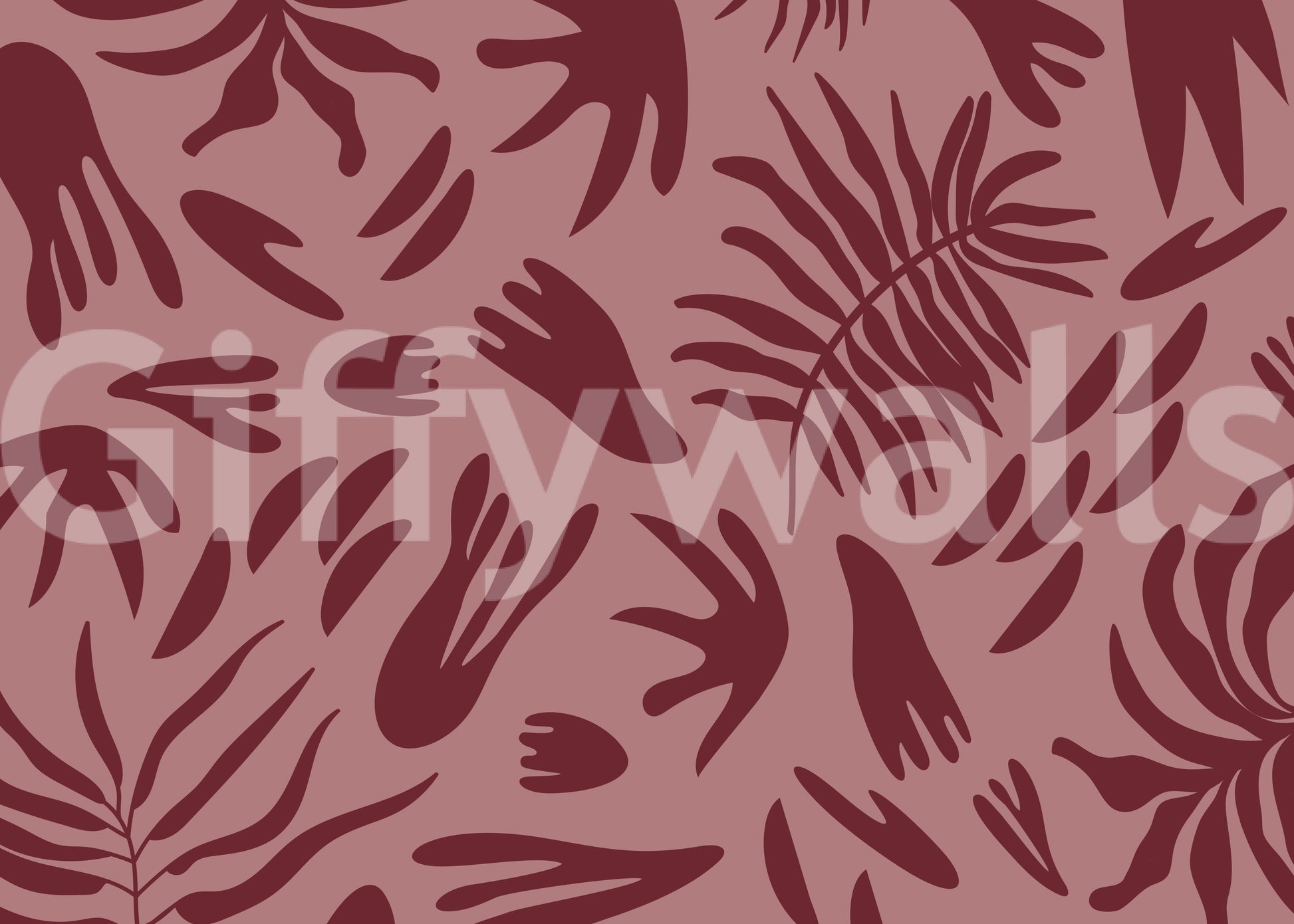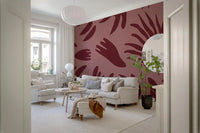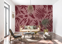 Apportez une ambiance sereine et raffinée à vos espaces de vie grâce à ce papier peint mural unique. Son motif captivant présente des formes botaniques abstraites aux contours organiques variés, évoquant de grandes feuilles et de délicates frondes. Le design minimaliste utilise des silhouettes nettes et épurées pour créer une impression moderne et artistique. Une riche teinte bordeaux profonde souligne les formes fluides, se détachant sur un fond rose poudré chaleureux. Cette palette de couleurs analogues crée une atmosphère harmonieuse et accueillante, apportant une profondeur subtile et une chaleur naturelle à toute pièce. Ce motif polyvalent s'intègre parfaitement dans un salon contemporain, une chambre paisible, une salle à manger élégante ou un bureau stylé, complétant sans effort les styles d'intérieur modernes, bohèmes ou éclectiques.