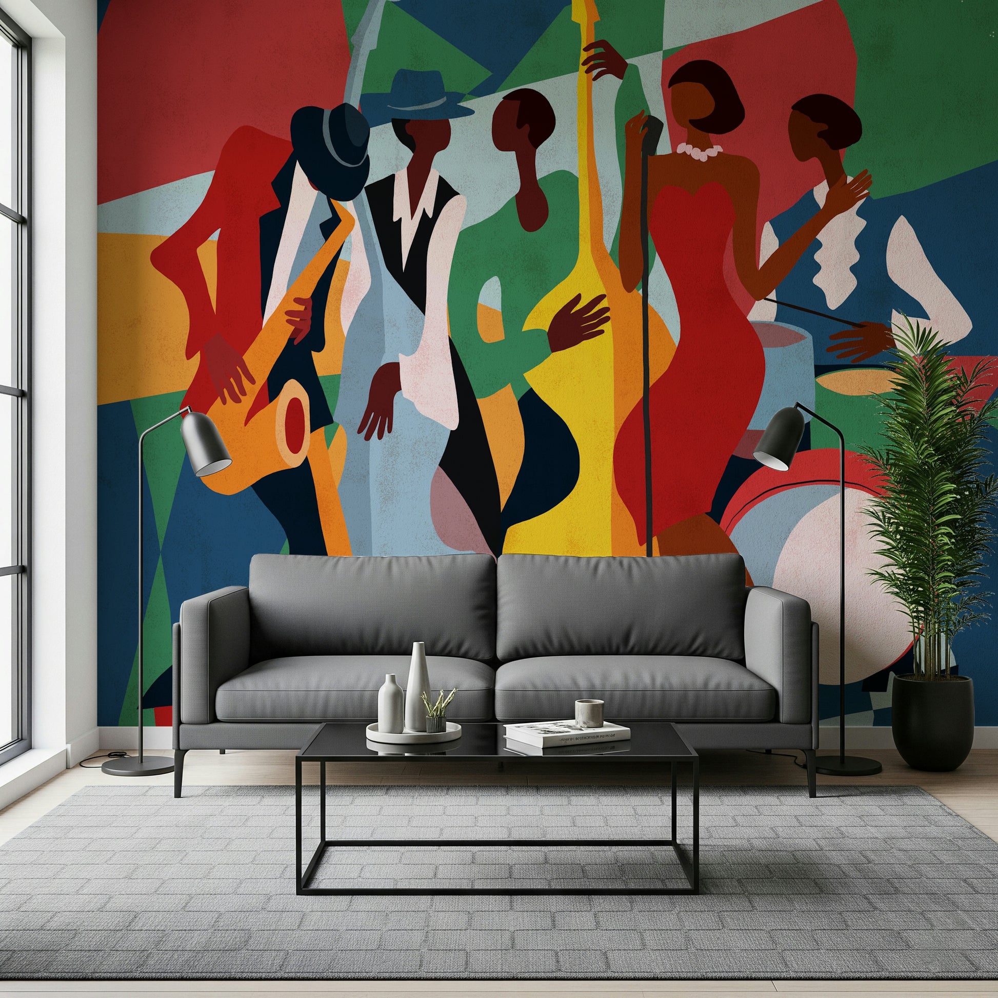 Apportez l'énergie de la musique live chez vous avec ce papier peint vibrant. Son motif représente un orchestre de jazz dans un style géométrique et coloré. Des lignes affirmées et une palette de couleurs audacieuse – rouges, bleus, verts et jaunes – créent une ambiance à la fois dynamique et sophistiquée. Idéal pour le salon, la salle à manger ou même le bureau, ce papier peint insuffle rythme et originalité à n'importe quel espace. Sa composition dynamique s'harmonise avec les intérieurs modernes et Art déco, offrant un élément décoratif captivant qui stimule la créativité et favorise les échanges.