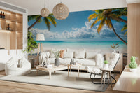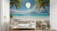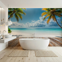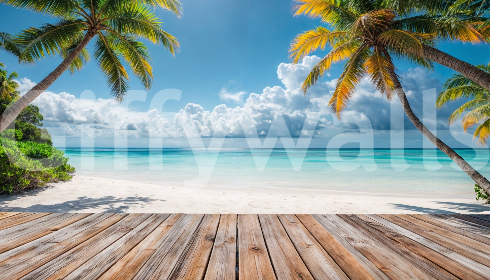Apportez la sérénité d'une escapade tropicale chez vous grâce à ce magnifique papier peint. La mer turquoise et vibrante rencontre une plage de sable blanc immaculé, encadrée de palmiers luxuriants sur un ciel d'un bleu limpide. La lumière du soleil danse sur une promenade en bois, ajoutant chaleur et profondeur à l'ensemble. La palette de couleurs évoque un sentiment de paix et de détente. Elle crée une atmosphère rafraîchissante pour un salon, une chambre ou une salle de bain. Ce motif transforme n'importe quel intérieur en un havre de paix, alliant la beauté de la nature à une touche de charme rustique et illuminant votre espace.