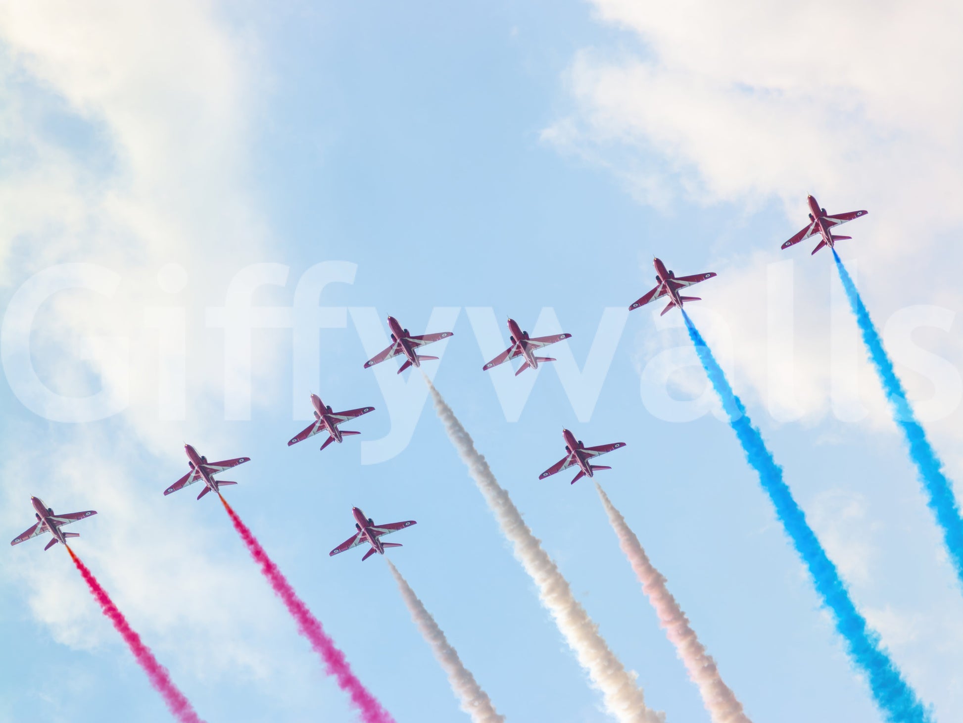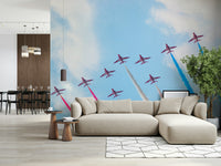 The Red Arrows flying in formation in sky with multicolored smoke. Transform your space with the breathtaking spectacle of an air show. This wallpaper for walls captures the dynamism of synchronized jets streaking across a pale blue sky, leaving trails of vibrant color in their wake. The bright, clean palette invigorates rooms with a sense of wonder and exhilaration. Ideal for a child’s bedroom, a modern living room, or even a home office, this design injects energy and visual interest. This pattern gives an illusion of movement, enlivening spaces and fostering a bold and cheerful atmosphere. The crisp details and colorful trails complement both minimalist and maximalist interiors.
