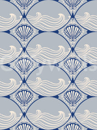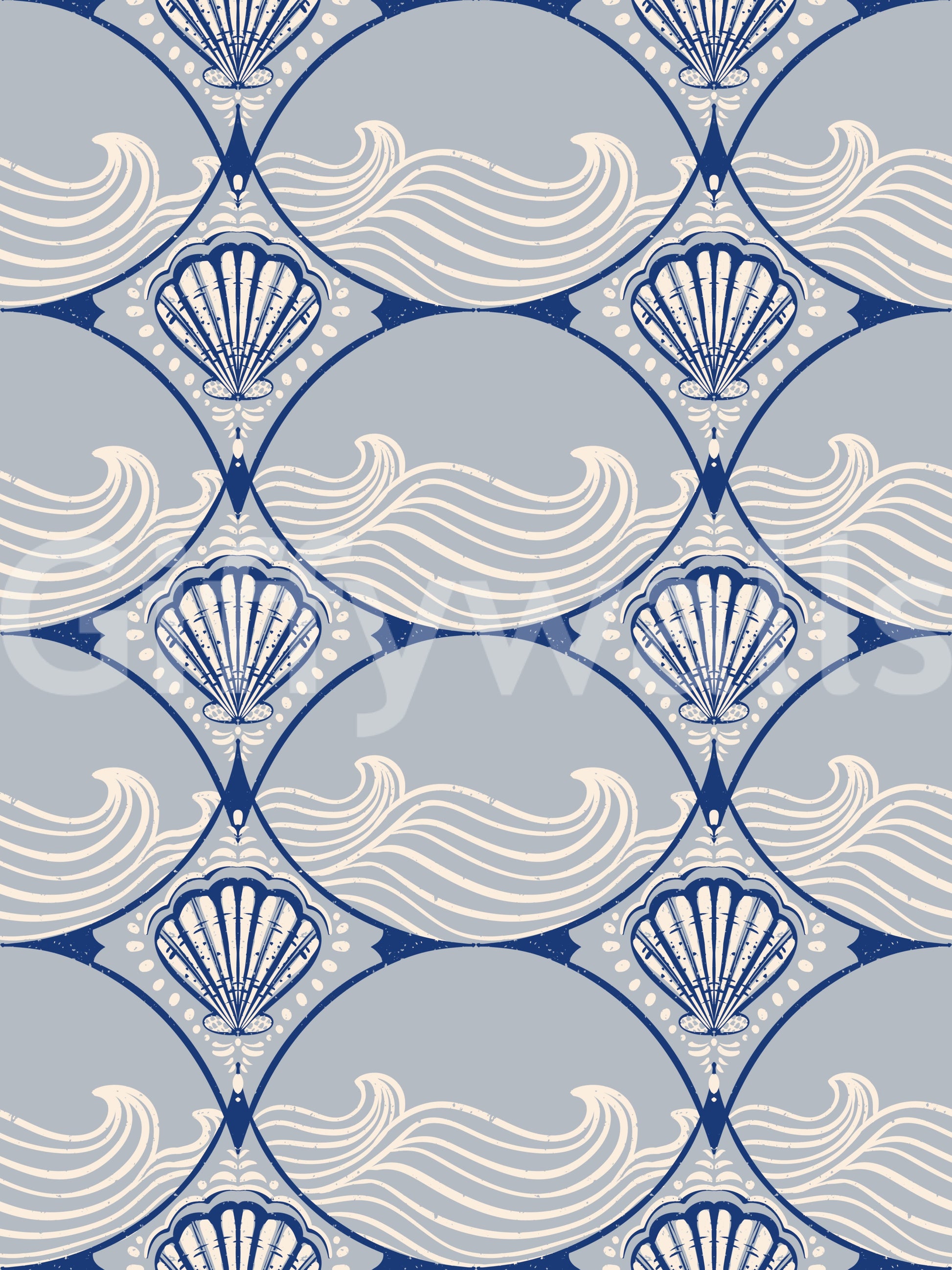 Ce papier peint élégant apporte une touche de sérénité côtière à votre intérieur. Son motif sophistiqué, inspiré de l'Art déco, met en scène des coquillages stylisés nichés au cœur d'arches géométriques entrelacées. Des vagues ondoyantes forment un arrière-plan dynamique qui sublime ces délicats motifs. La palette de bleu marine profond, de bleu poudré doux et de blanc cassé crémeux crée une atmosphère paisible et raffinée. Ce modèle embellit salons, chambres et salles de bains, les transformant en havres de paix en bord de mer. Son esthétique vintage lui confère du caractère et s'harmonise aussi bien avec les intérieurs classiques que contemporains, grâce à son luxe discret. Sa texture légèrement vieillie lui donne un charme authentique et intemporel.